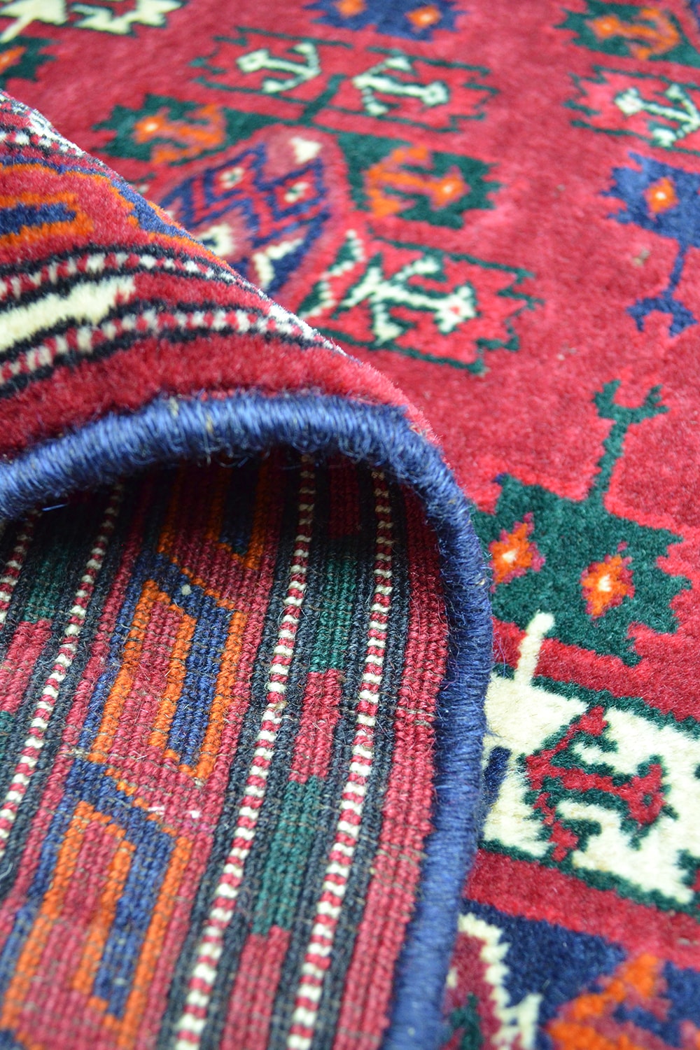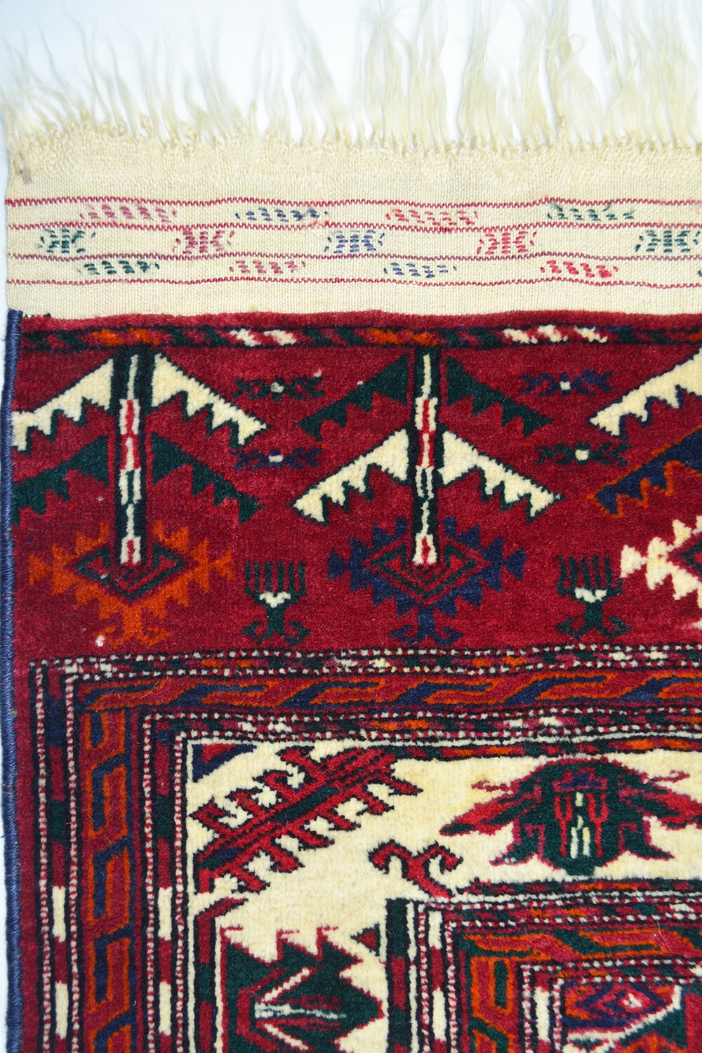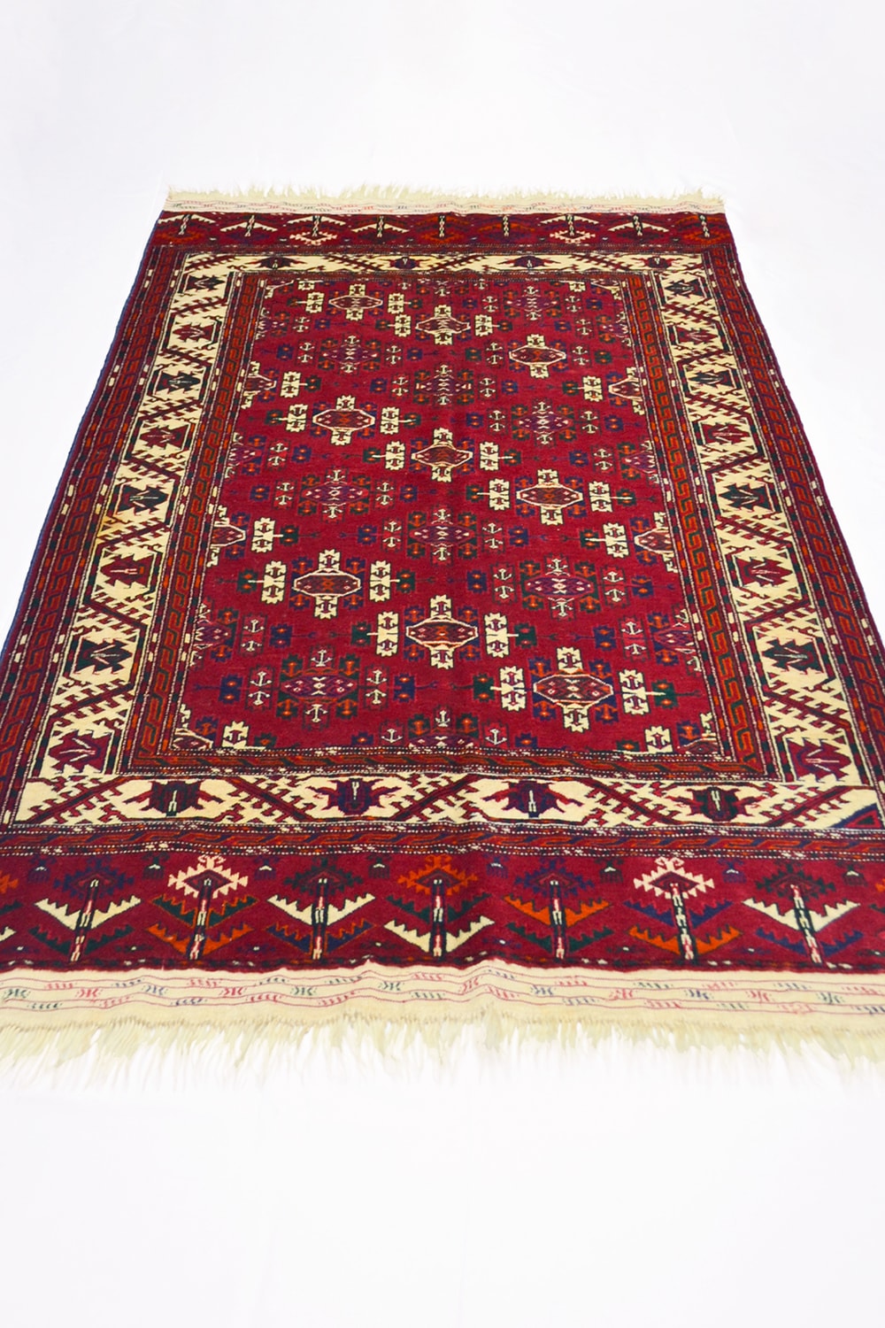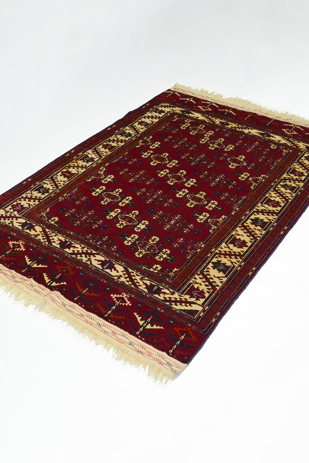 Orta Asya’nın köklü dokuma geleneğini yansıtan bu Türkmen Buhara halısı, 130x193 cm (2.51 m²) ölçülerindedir. Yün saçak üzerine Kirman yününden dokunmuş olup, kökboya renklerle ilmek ilmek hazırlanmıştır.