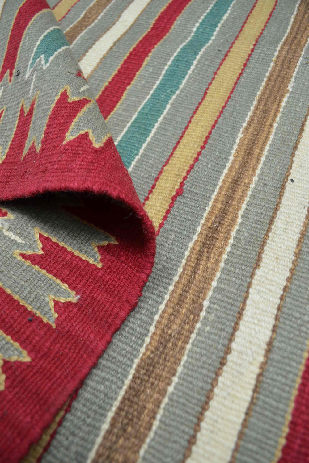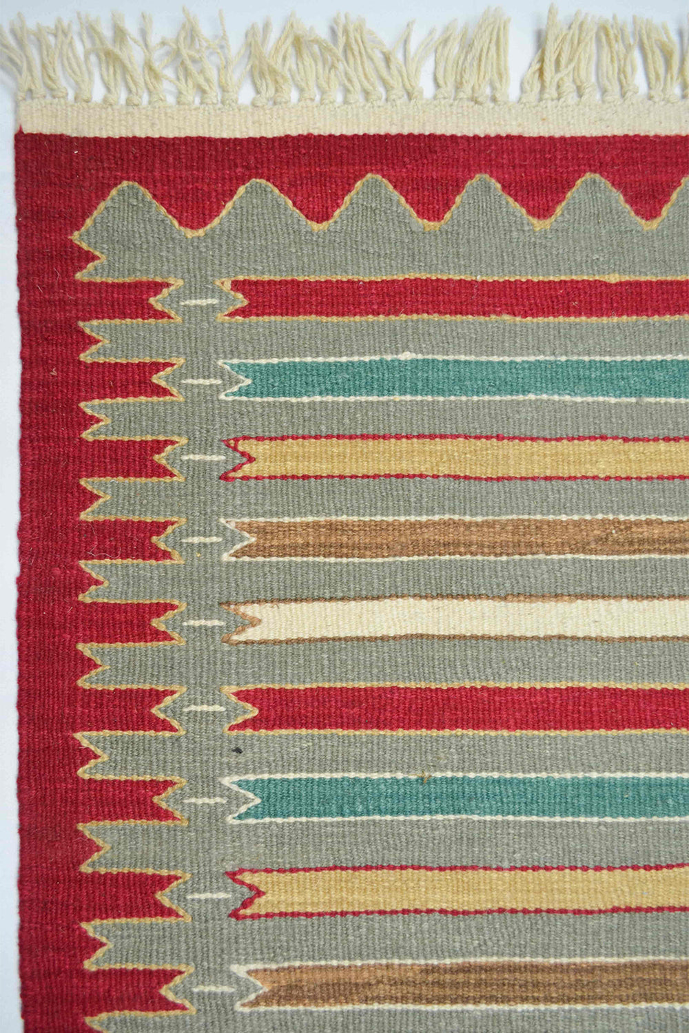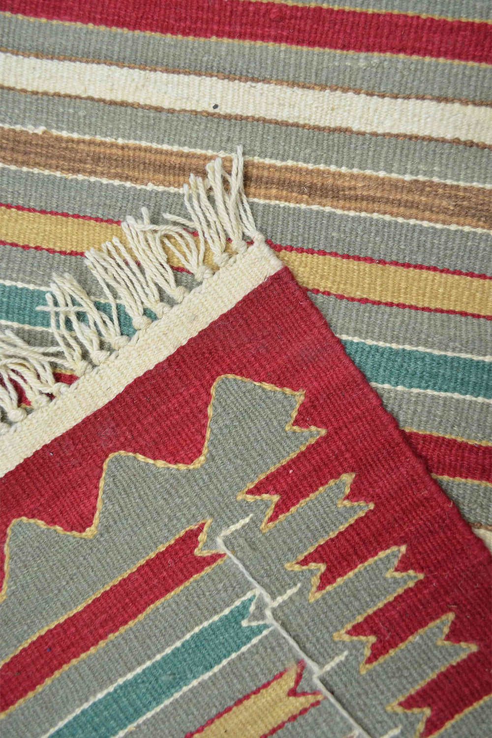 Bu el dokuma Uşak kilimi, tamamen yün ipliklerle üretilmiş olup bordo renkli çerçevesi ve ortasında yer alan rengârenk çizgili dokusuyla dikkat çeker. Bordo çerçeve, kilime belirgin bir sınır kazandırırken çok renkli orta alan hareketli ve karakterli bir görünüm sunar. 115x177 cm ölçüsü, salon, oturma alanı veya geçiş bölgelerinde dekoratif ve işlevsel kullanım sağlar.