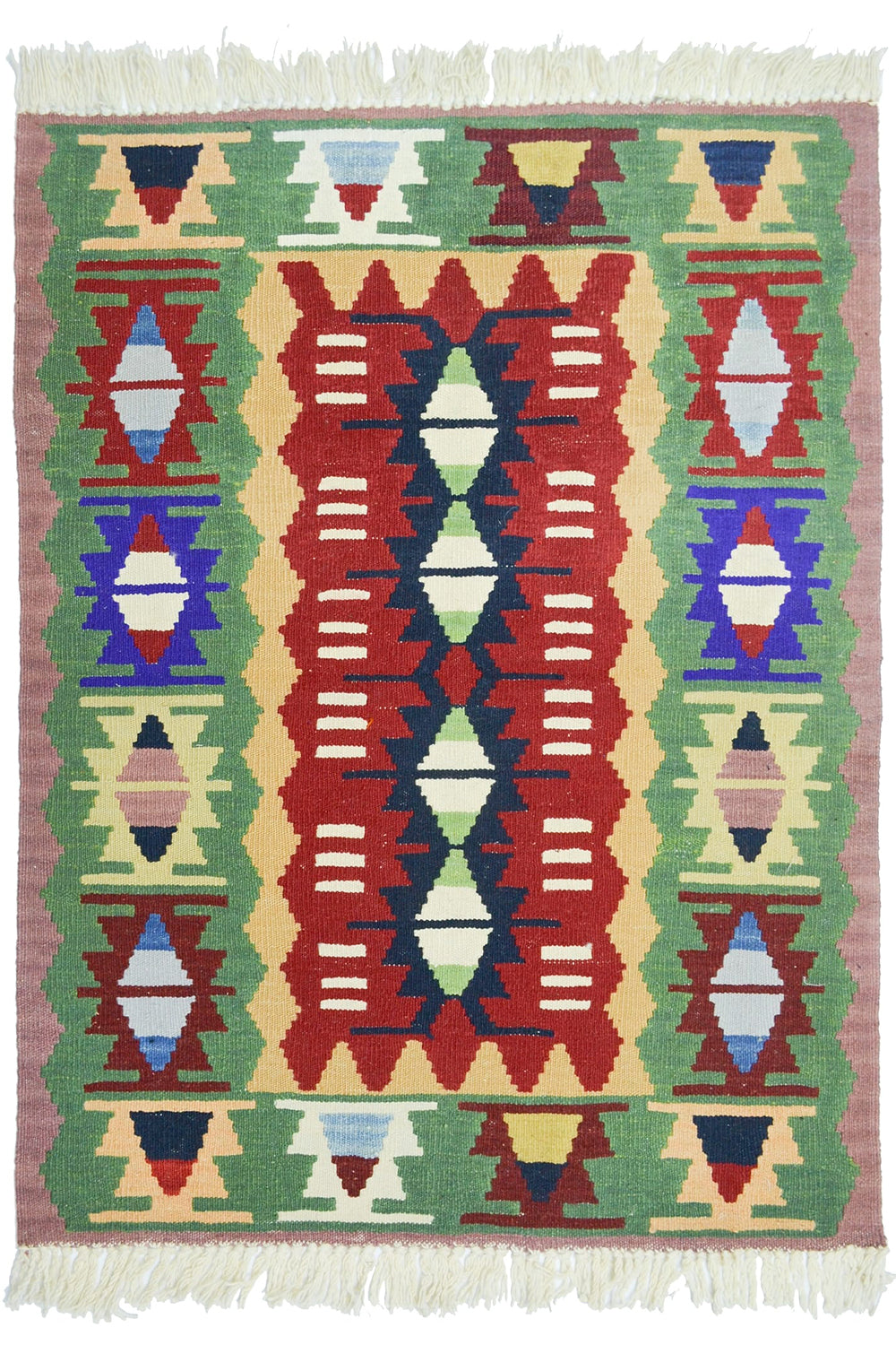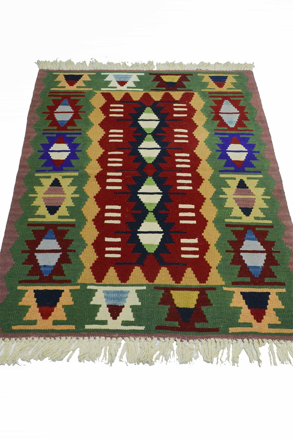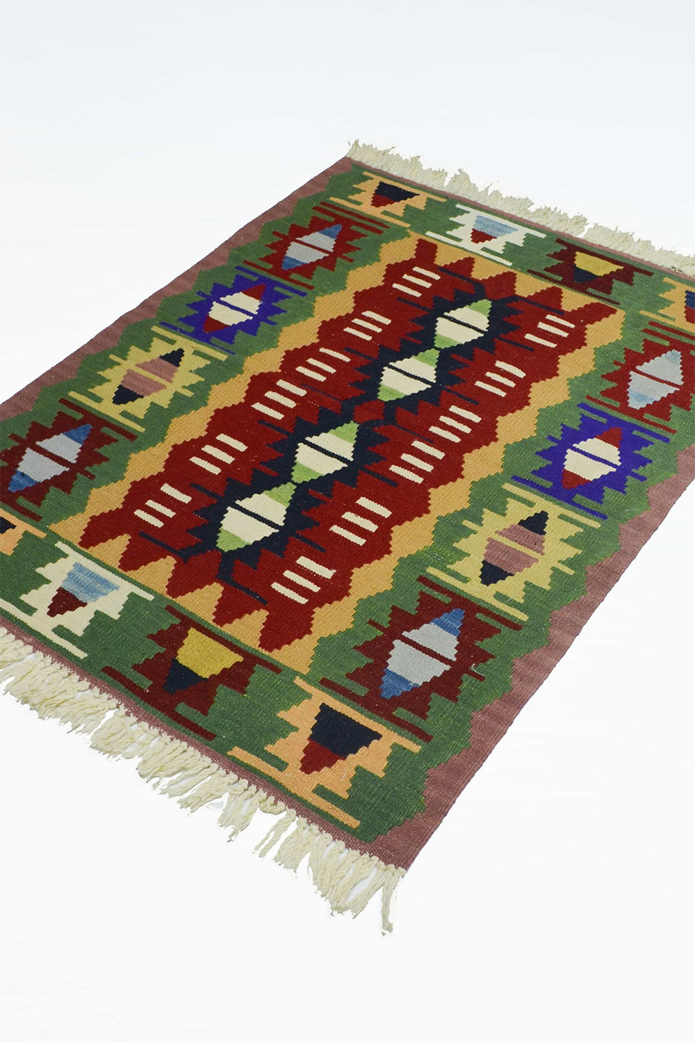 El dokuma Uşak kök ince kilim, %100 yün ipliklerle geleneksel Anadolu dokuma teknikleri kullanılarak üretilmiştir. Doğal kök boyalarla elde edilen yeşil ve kırmızı renkler kilime güçlü, dengeli ve özgün bir karakter kazandırır. İnce dokuma yapısı sayesinde hafif ve kullanışlı olan bu kilim, 90x112 cm ölçüsüyle küçük alanlar, girişler ve dekoratif köşeler için ideal bir kullanım sunar.