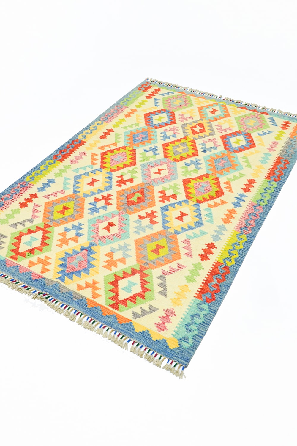 Afganistan’ın köklü dokuma geleneğini yansıtan bu el dokuma kilim, 125x187 cm (2.34 m²) ölçülerindedir. %100 yünden üretilen kilim, canlı ve çok renkli tasarımıyla mekânlara hareket ve enerji katar.