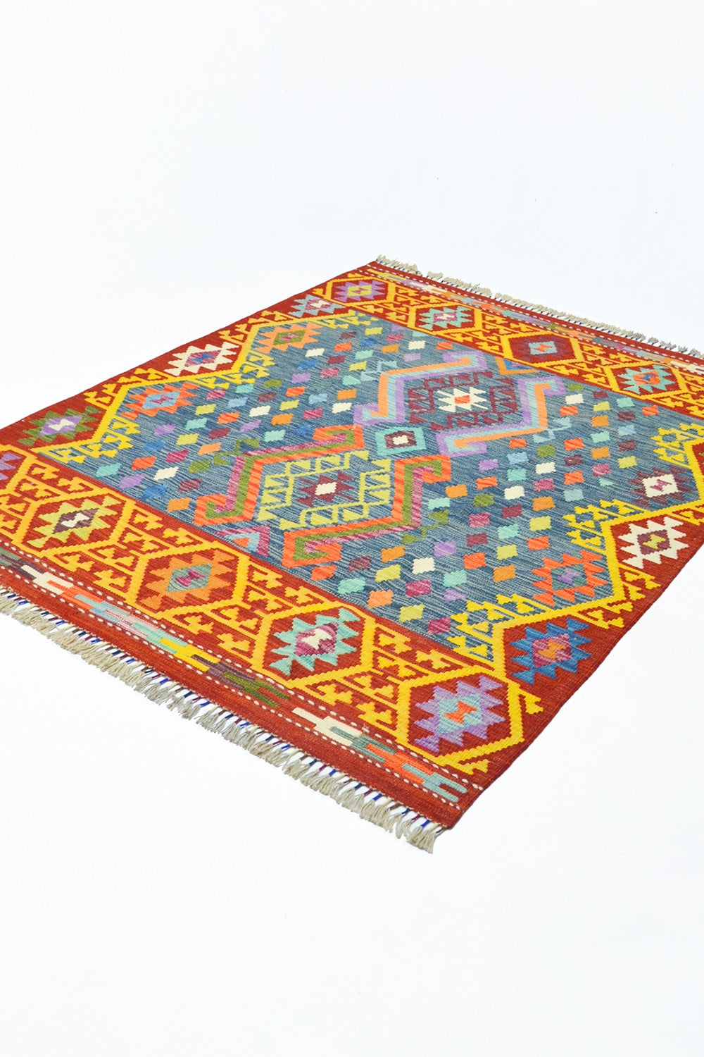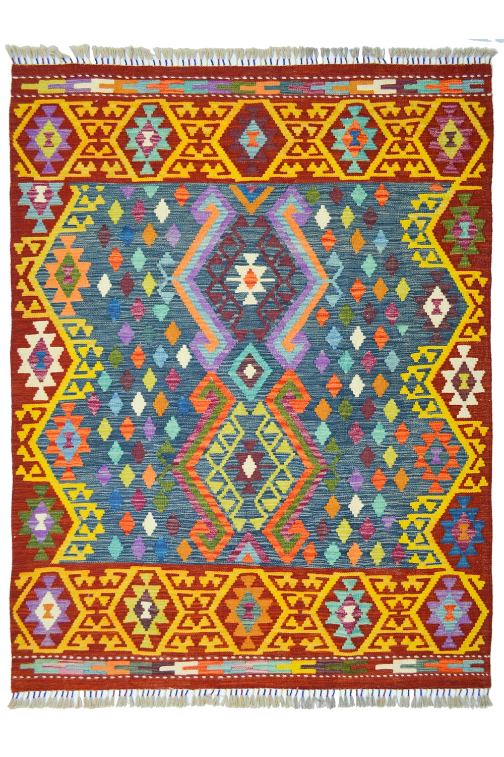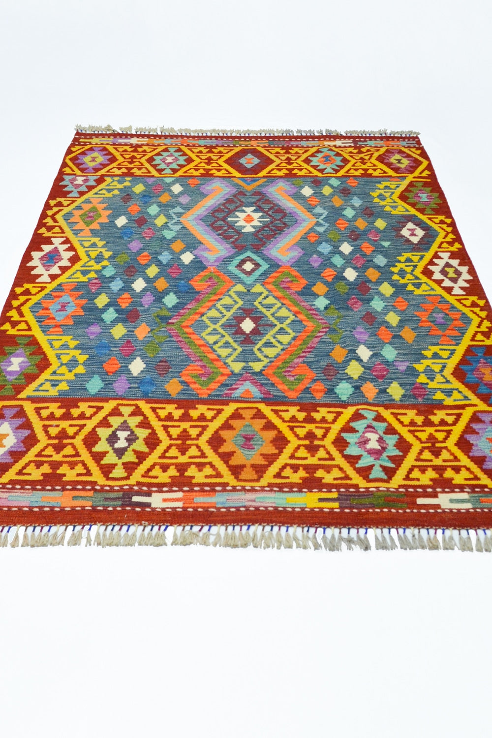 Afganistan’ın köklü dokuma geleneğini yansıtan bu el dokuma kilim, 174x241 cm (4.19 m²) ölçülerindedir. %100 yünden üretilen kilim, canlı ve çok renkli tasarımıyla mekânlara hareket ve enerji katar.