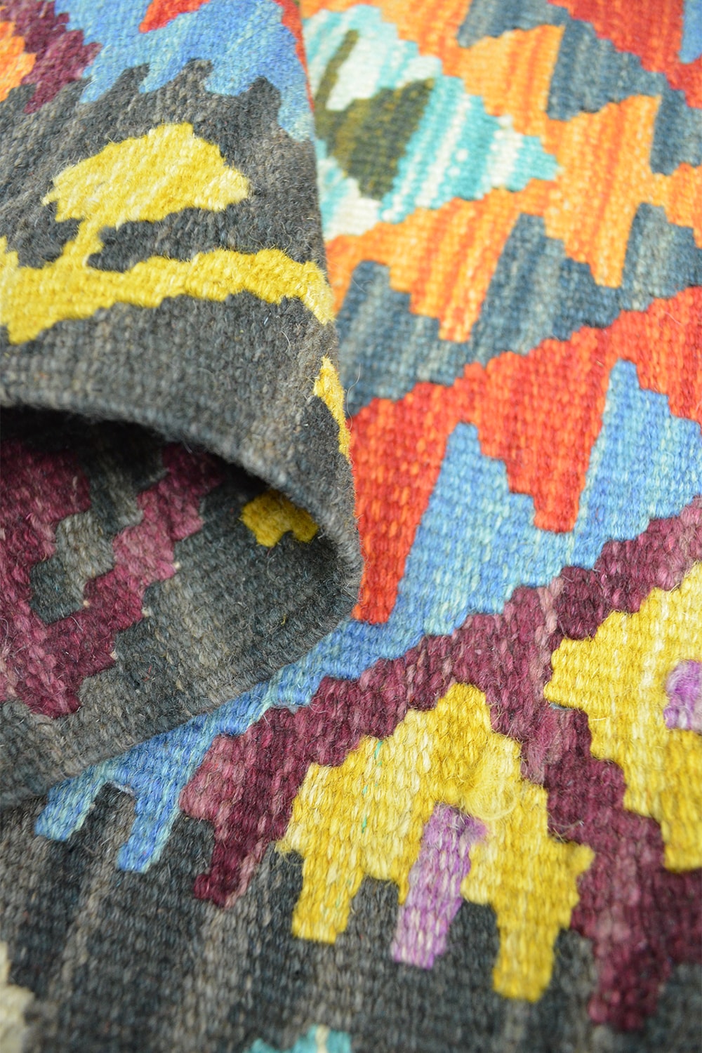 Afganistan’ın köklü dokuma geleneğini yansıtan bu el dokuma kilim, 60x200 cm (1.20 m²) ölçülerindedir. %100 yünden üretilen kilim, canlı ve çok renkli tasarımıyla mekânlara hareket ve enerji katar.