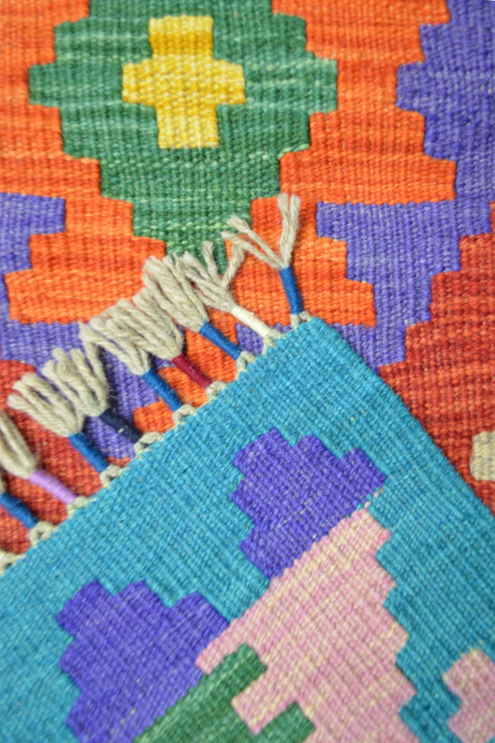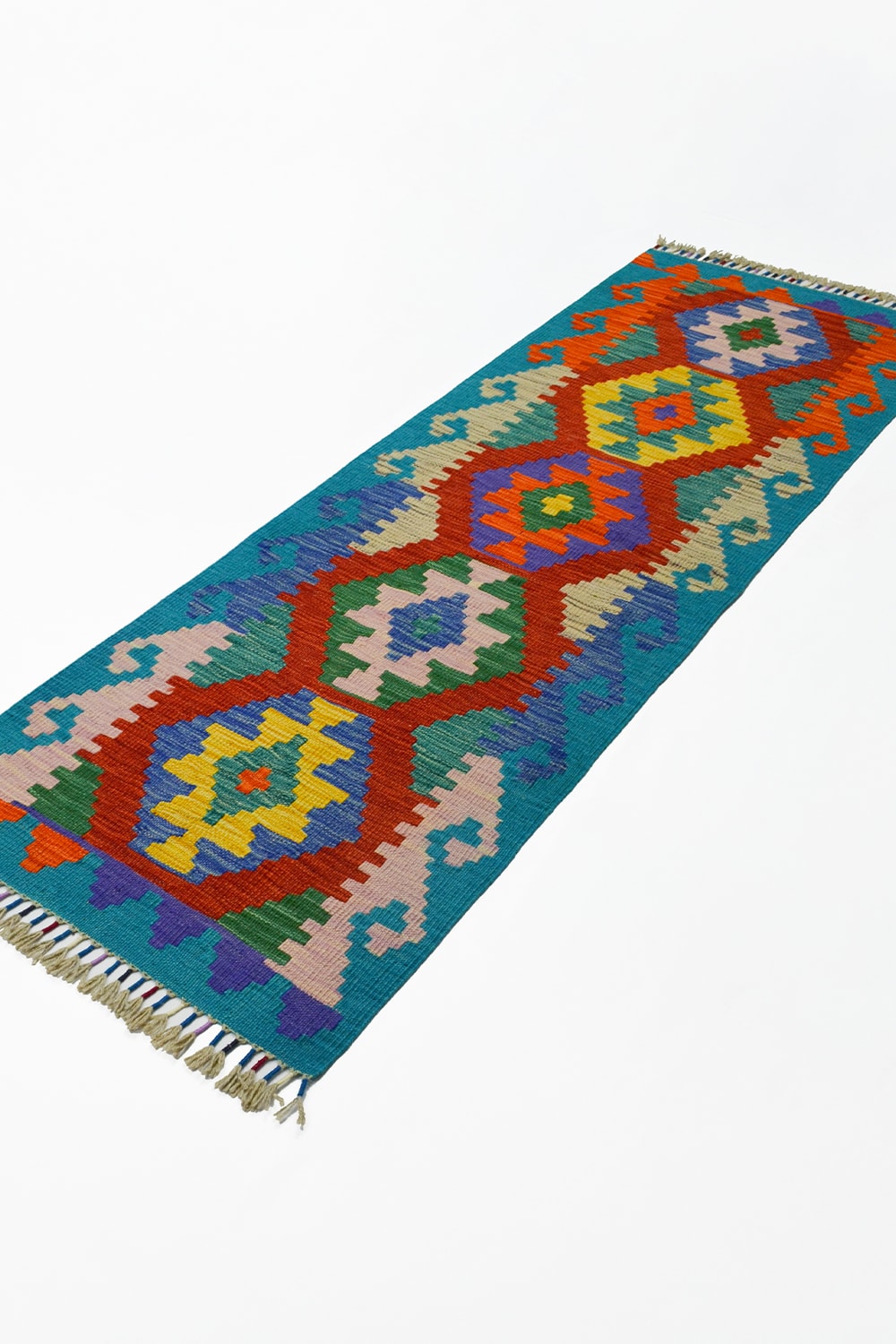 Afganistan’ın köklü dokuma geleneğini yansıtan bu el dokuma kilim, 61x173 cm (1.06 m²) ölçülerindedir. %100 yünden üretilen kilim, canlı ve çok renkli tasarımıyla mekânlara hareket ve enerji katar.