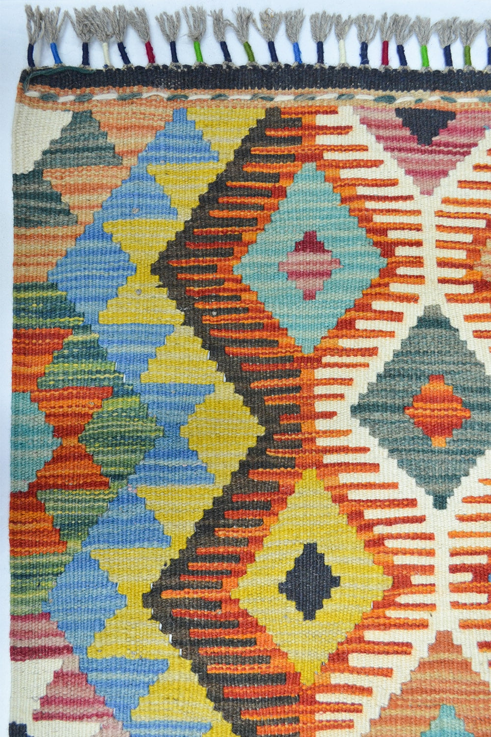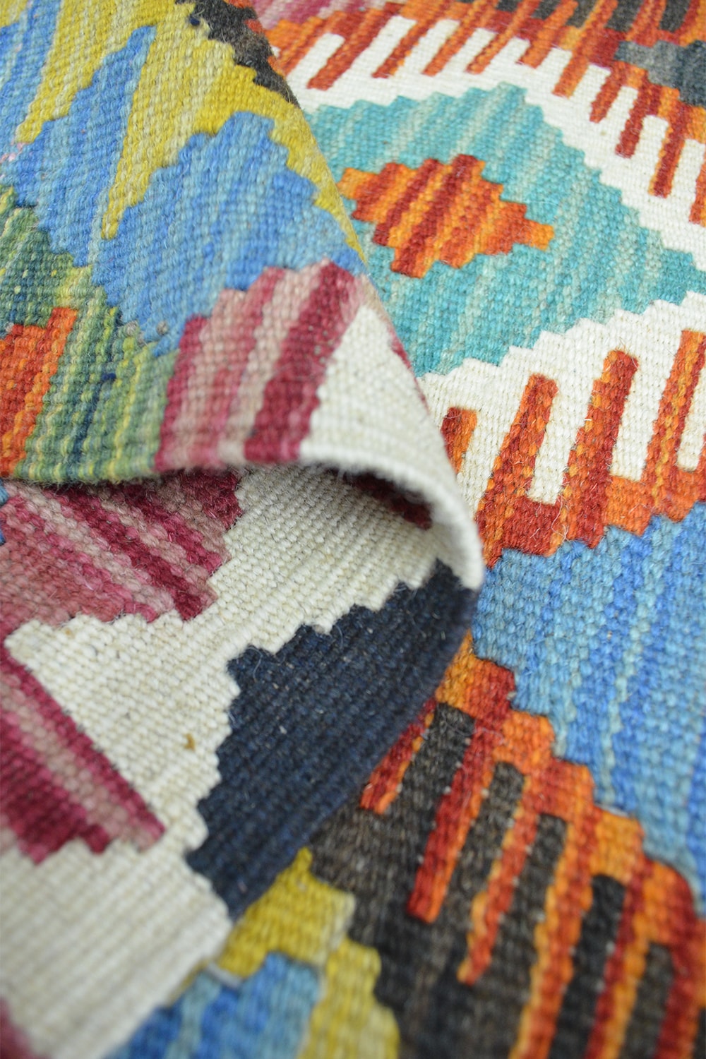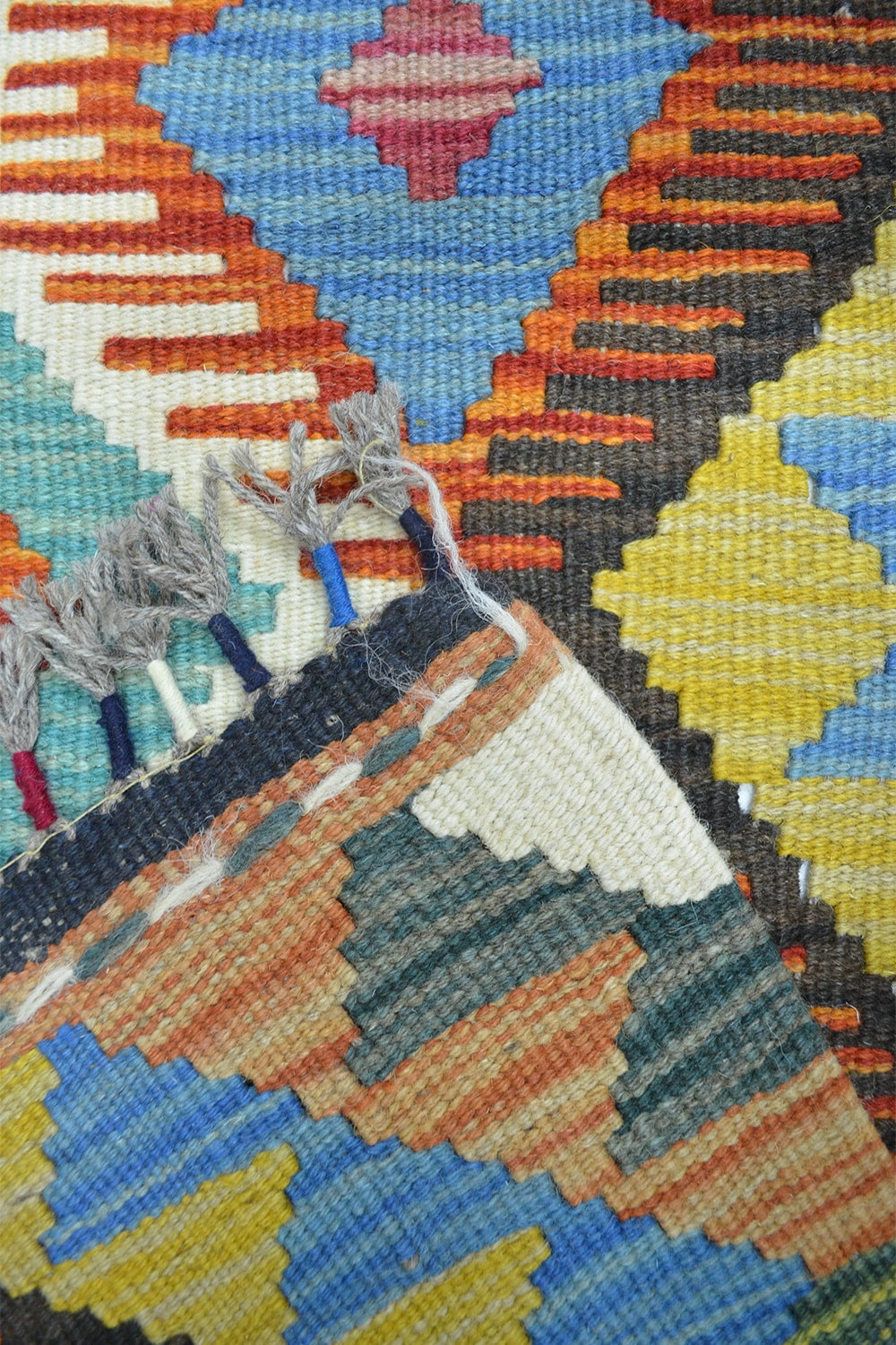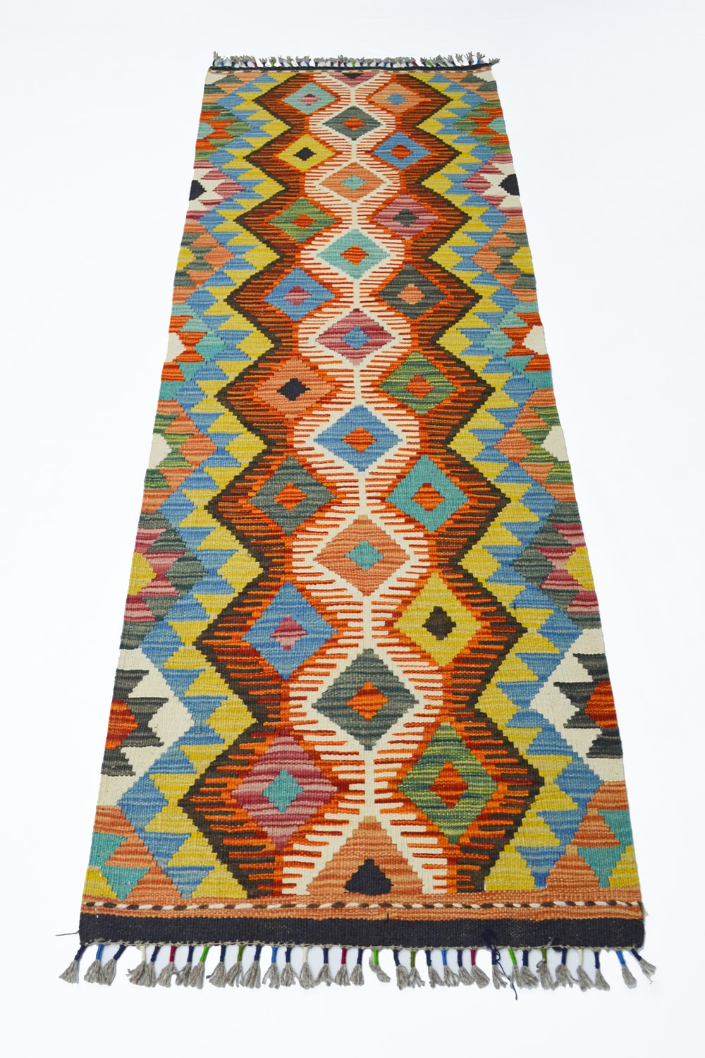 Afganistan’ın köklü dokuma geleneğini yansıtan bu el dokuma kilim, 65x197 cm (1.28 m²) ölçülerindedir. %100 yünden üretilen kilim, canlı ve çok renkli tasarımıyla mekânlara hareket ve enerji katar.