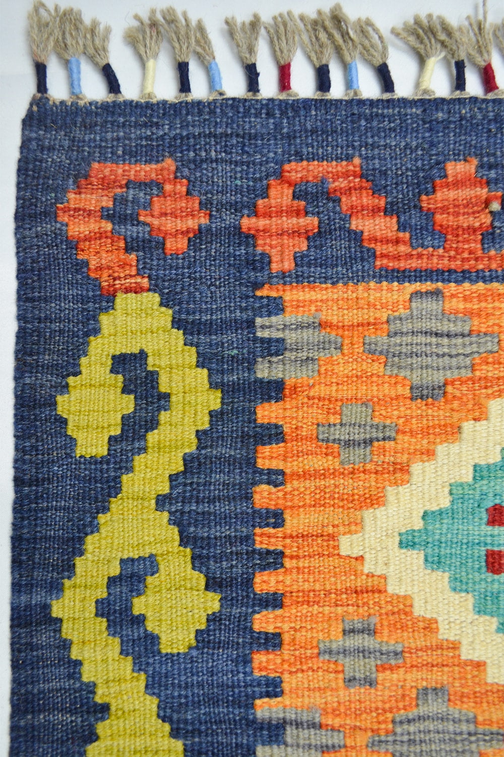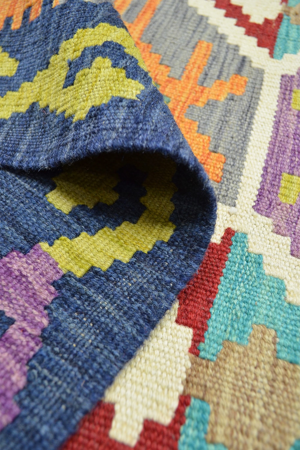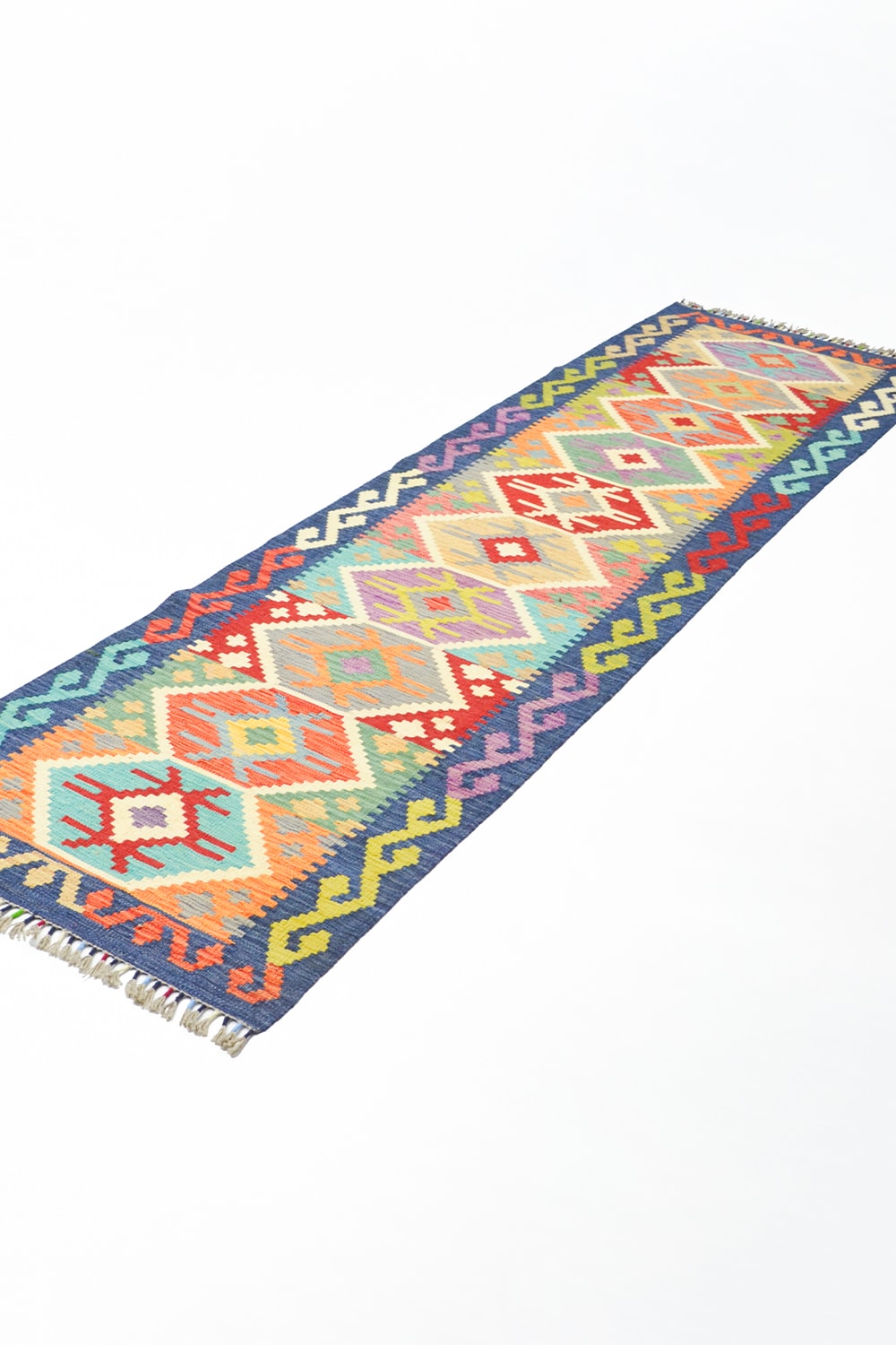 Afganistan’ın köklü dokuma geleneğini yansıtan bu el dokuma kilim, 77x297 cm (2.29 m²) ölçülerindedir. %100 yünden üretilen kilim, canlı ve çok renkli tasarımıyla mekânlara hareket ve enerji katar.