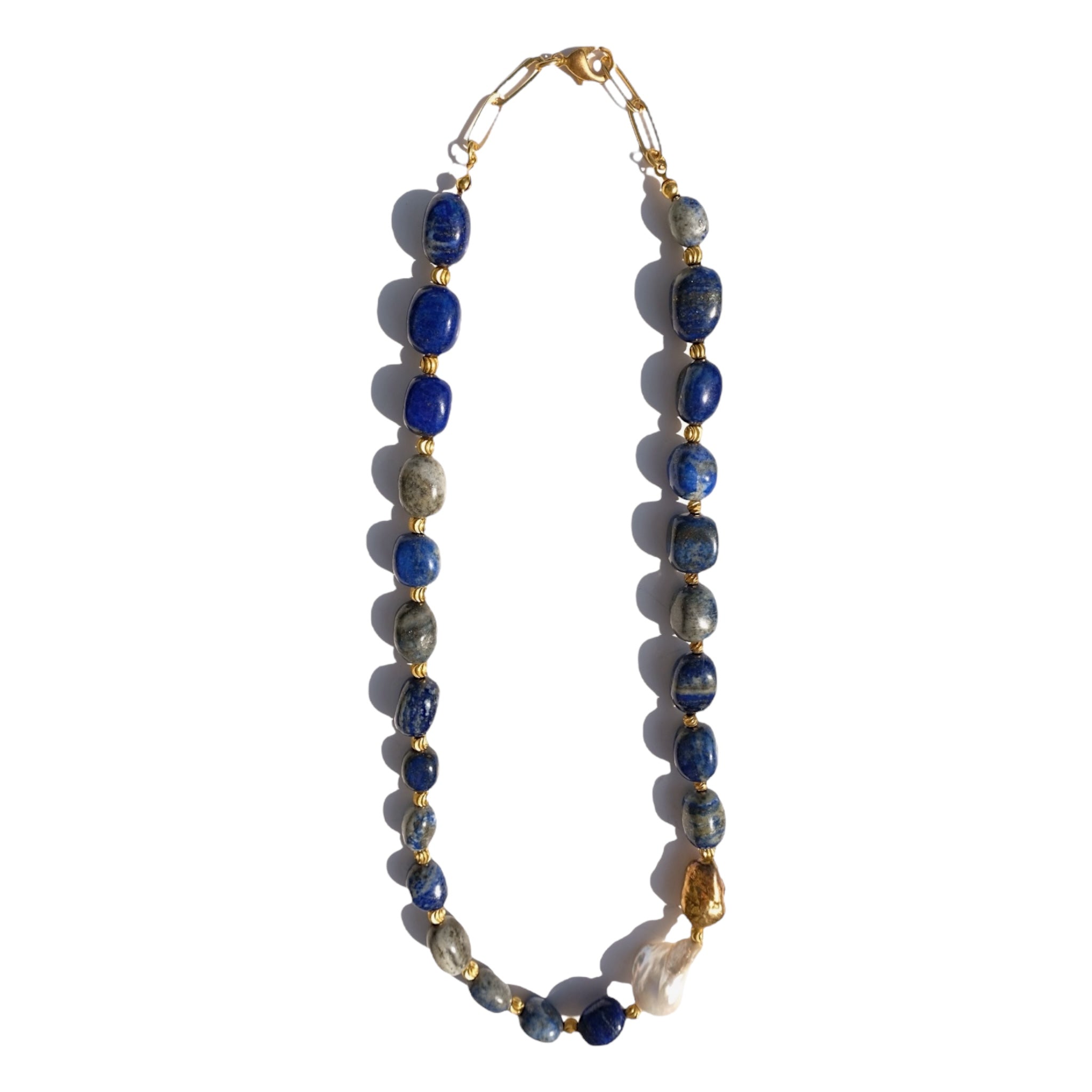 Key Features:- Lapis lazuli beads in deep blue with natural golden flecks- Two baroque pearls: one in its organic form and one coated in gold for a striking accent- Necklace length: 55 cm / 21.6 inches- Handcrafted clasp in 22k gold-plated brass for secure and elegant closure- A unique composition that combines the richness of lapis with the distinct beauty of baroque pearls