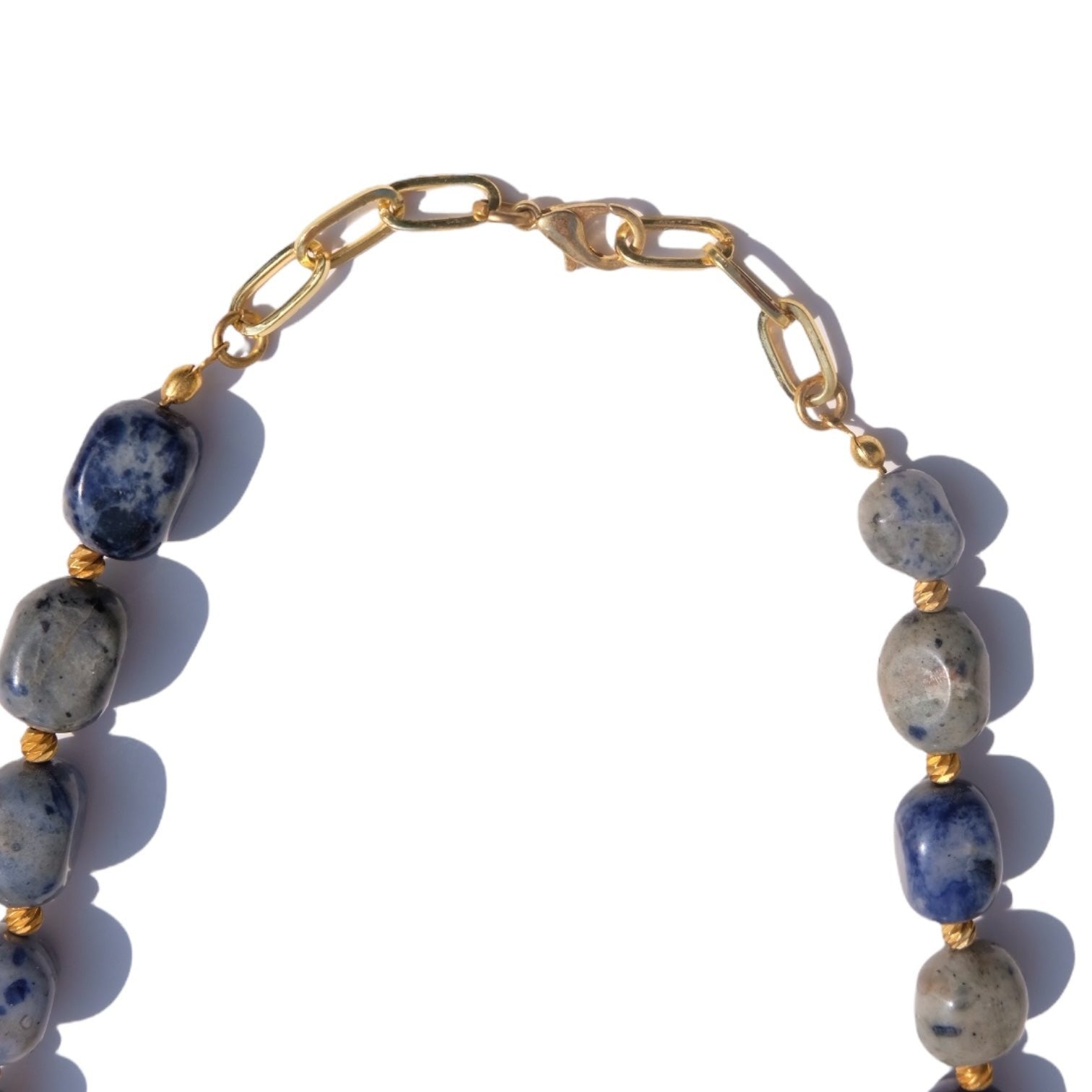 The Zei Necklace in Lapis is a bold and elegant statement, featuring deep blue lapis lazuli beads interspersed with two stunning baroque pearls. The lapis stones exhibit rich, midnight blue hues with natural golden flecks, evoking the beauty of a starlit sky. Adding a unique twist, the design includes two baroque pearls—one with its natural, lustrous finish and the other coated in gold, creating a luxurious contrast. This piece is completed with a handcrafted 22k gold-plated brass clasp, bringing a refined touch to the design.