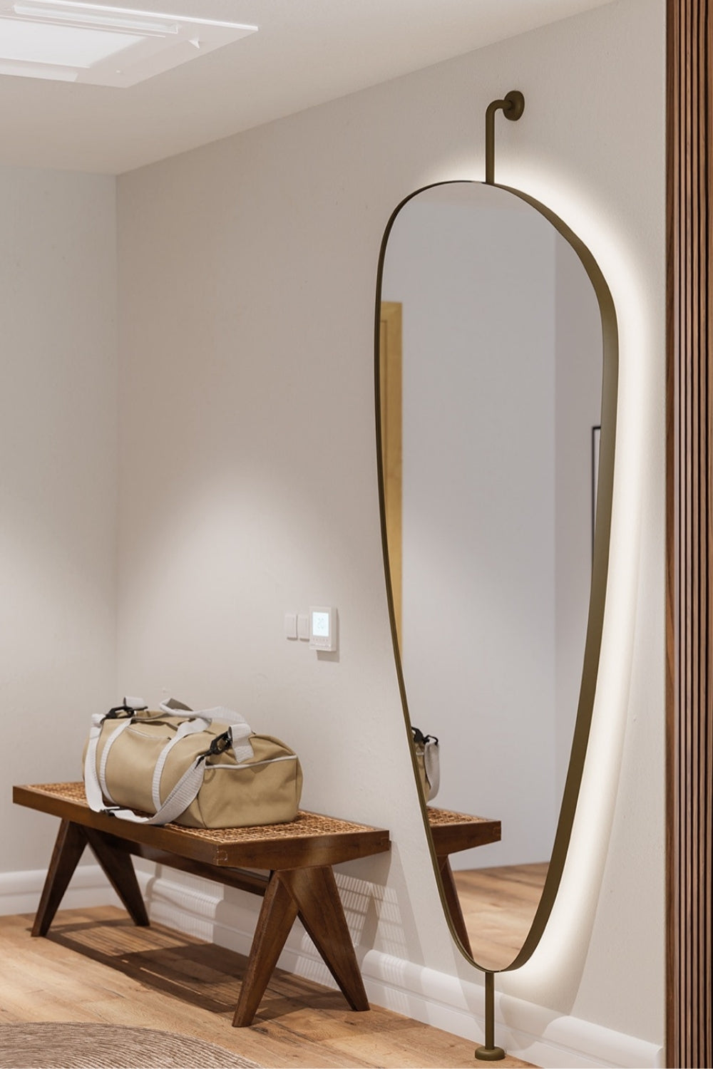 Pearl Akıllı LED Ayna, formu kadar teknolojisiyle de dikkat çeker. Duvar yüzeyine zarif bir şekilde monte edilen bu ayna, çevresini saran yumuşak LED aydınlatma ile mekâna sıcaklık ve derinlik katar.