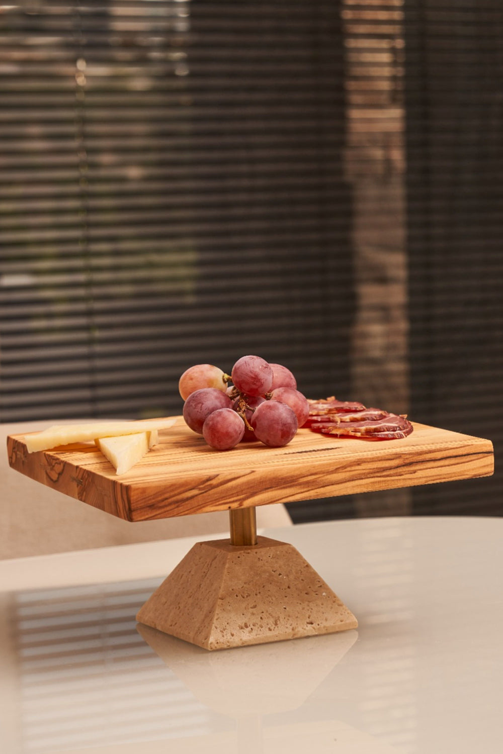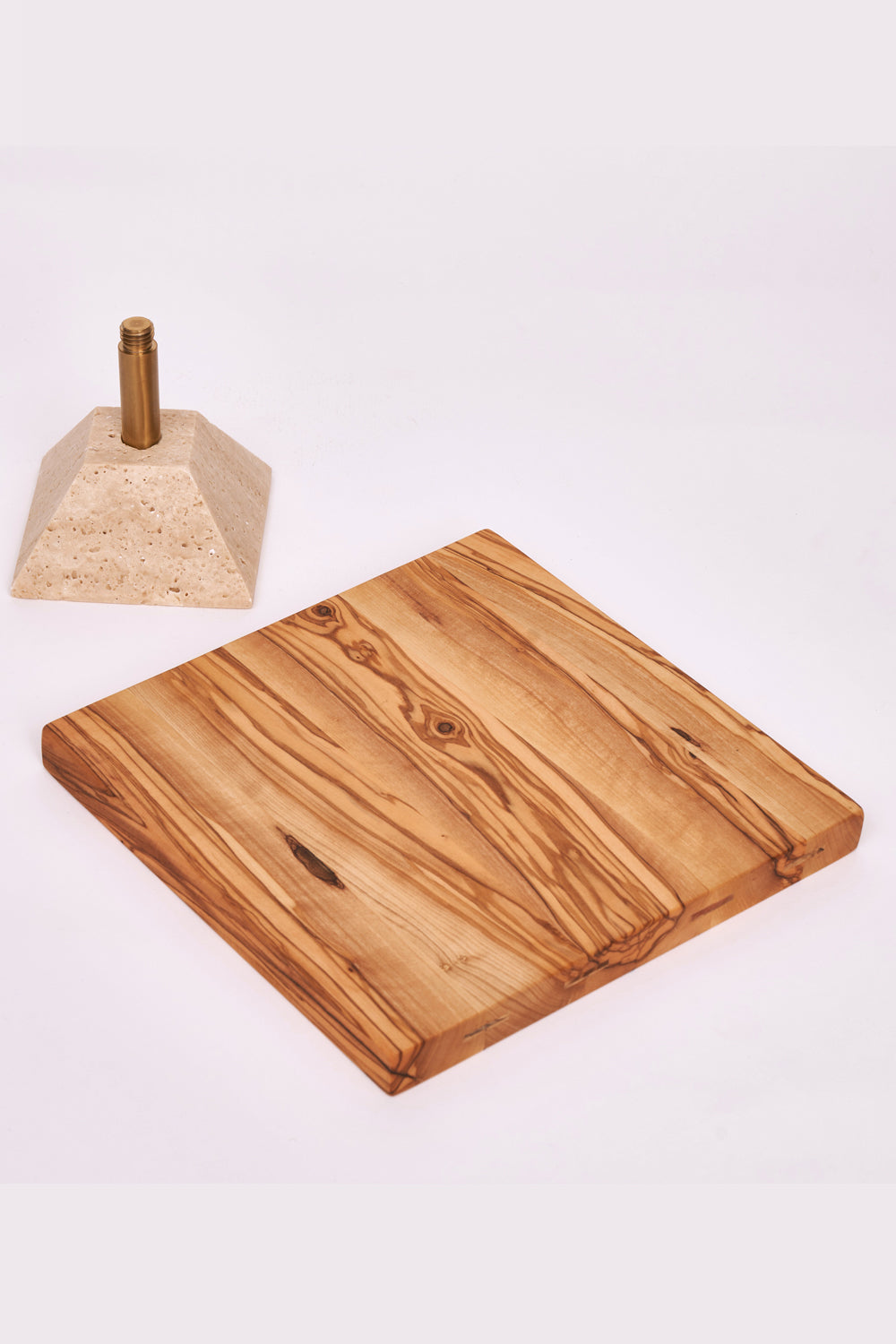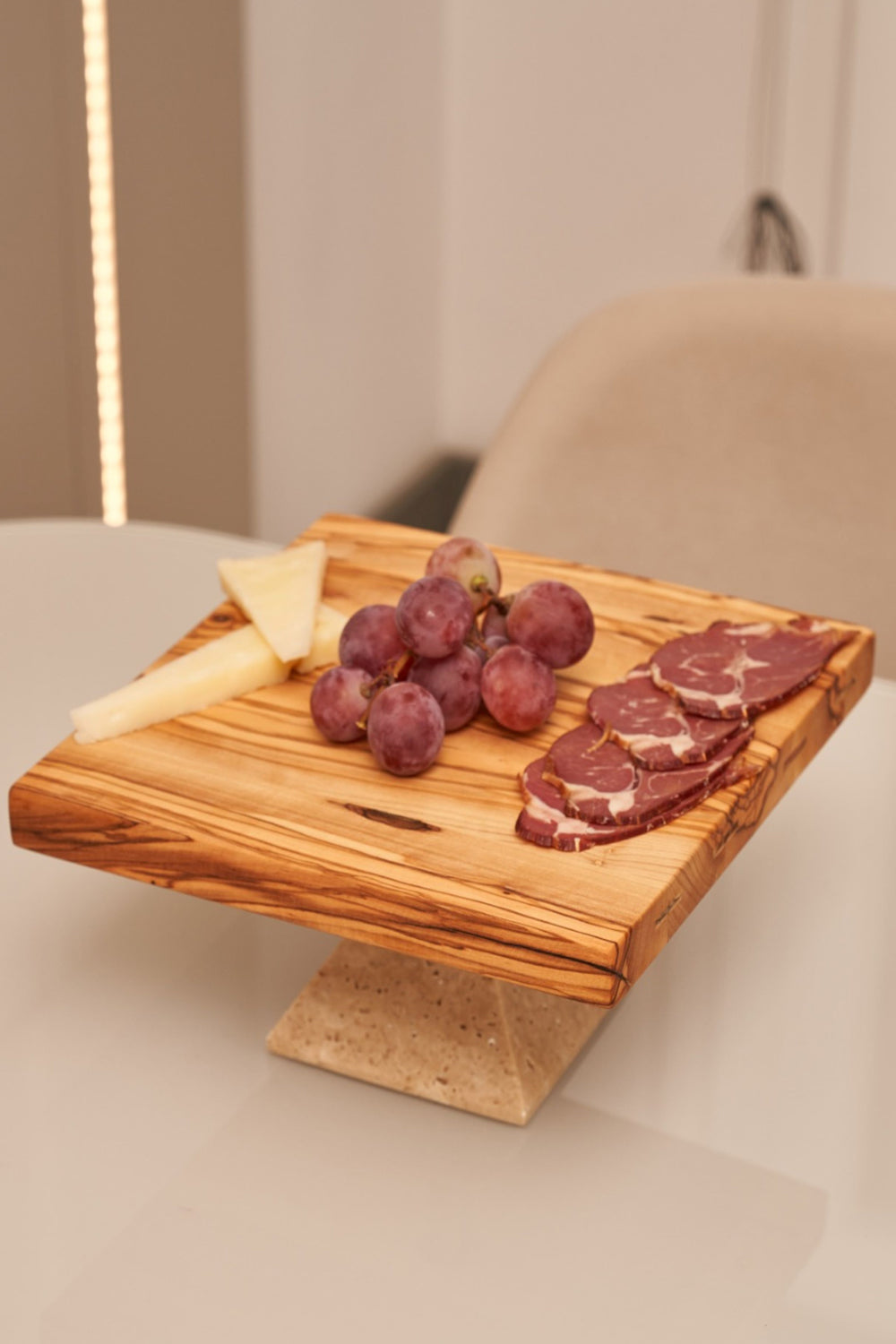 Ürün Özellikleri:– Zeytin ağacından kare servis yüzeyi– Gümüş traverten mermer taban– Pirinç detaylı gövde bağlantısı– %100 doğal malzeme: Her üründe renk ve damar yapısı farklılık gösterebilir