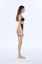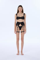 Caroline Siyah Dantel Jartiyer'i Valeria Siyah Balconette Sütyen ve Nova Askılı Tanga ile eşleştirerek cesur ve kışkırtıcı bir takım oluşturun. Şeffaf diz üstü çoraplar ekleyerek zamansız bir çekicilik katın ve omuzlarınıza Gloria Şeffaf Sabahlık'ı alarak altındaki zarif dantelin ipuçlarını sergileyin.