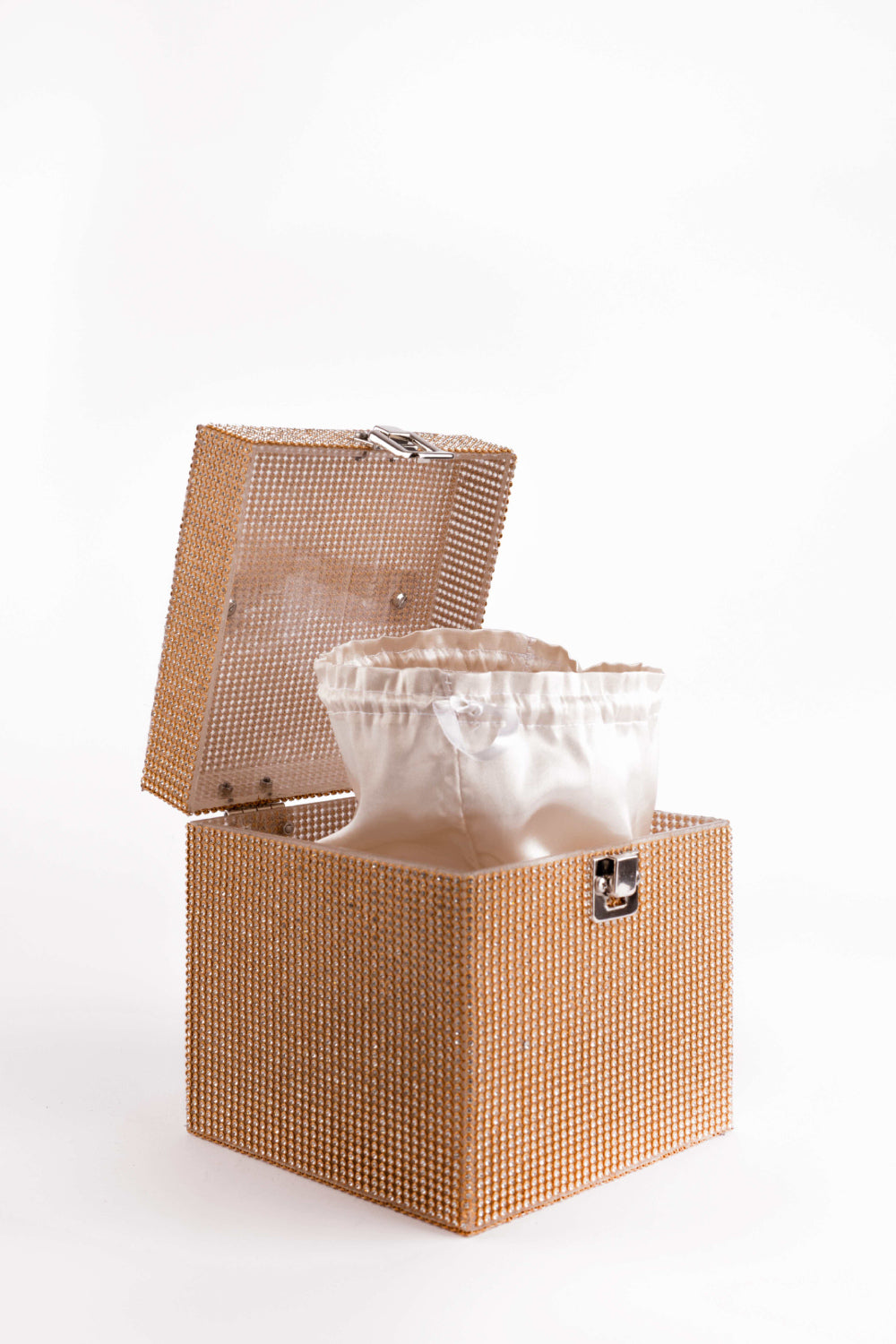 Kare, Şık, Akrilik, Deri Saplı, Kilit mekanizmalı, Saten Keseli, Kristal Taş Kaplama, El yapımı Makyaj Çantası ;