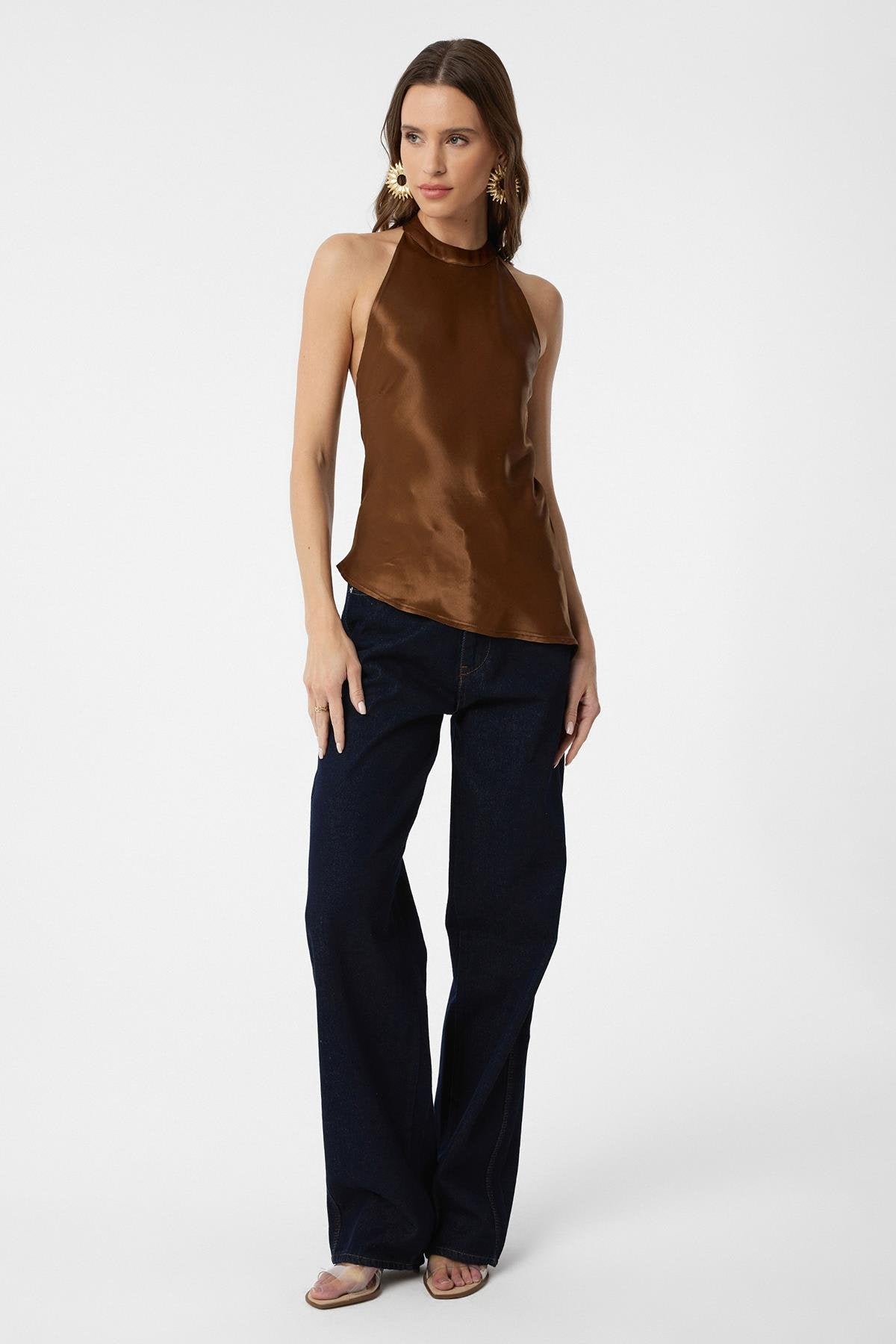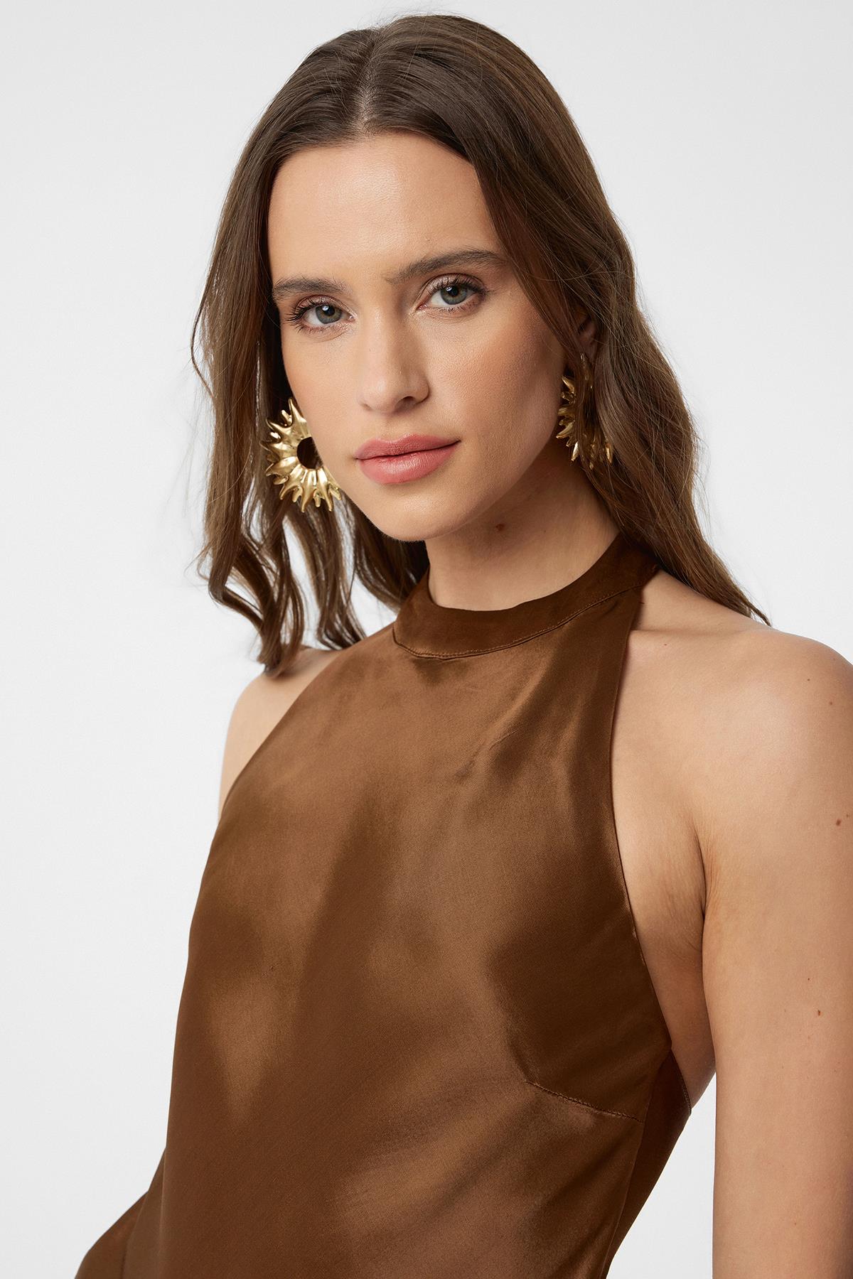 Kahve Asimetrik Saten Sırt Dekolteli Kadın Top