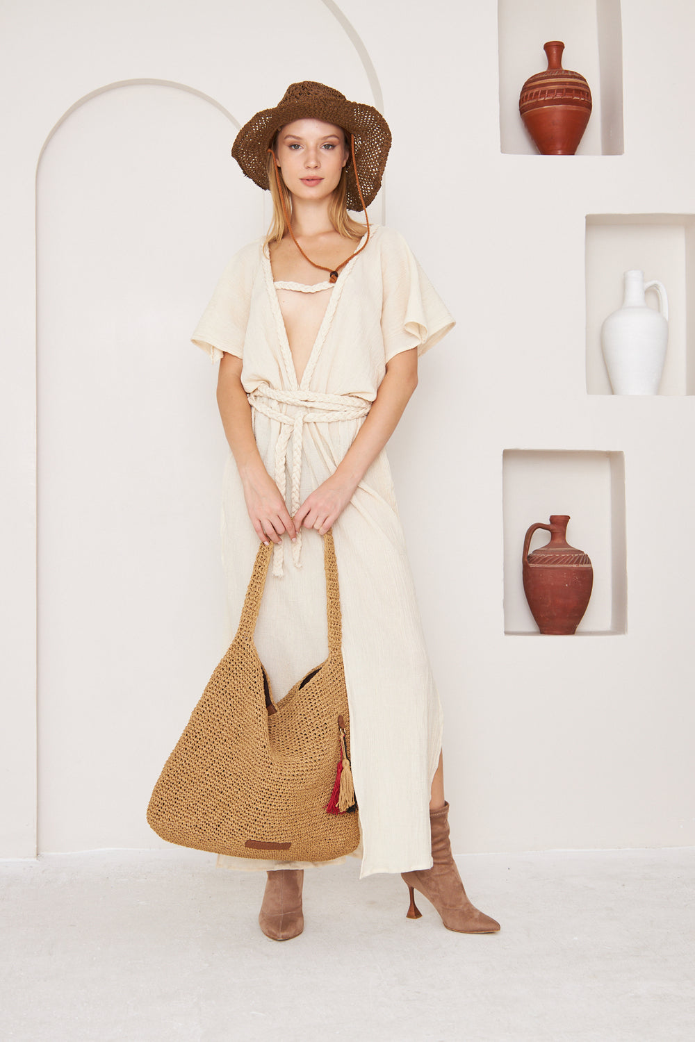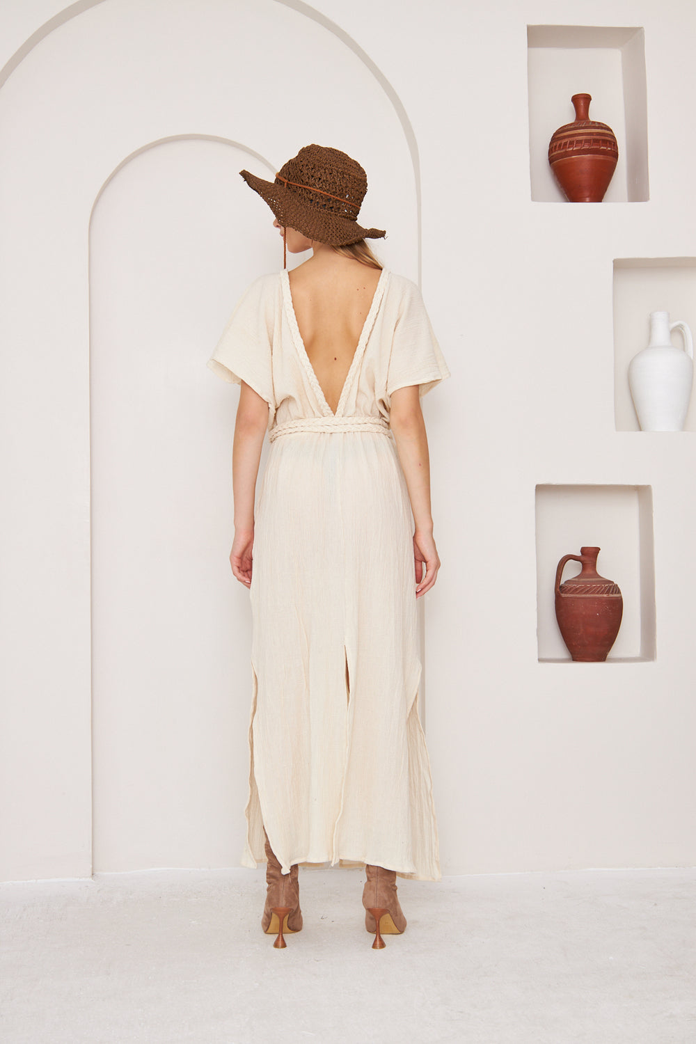 Elbisenin bel ve göğüs çevresindeki el dokuması örgüler, rustik bir çekicilik katarken, ön ve arkadaki örgülerle süslenmiş derin V-yaka ve V-sırt dekolteleri, çarpıcı bir görünüm sağlar. Diz hizasındaki yırtmaçlar ve geniş, bol kolları ile hem şık hem de konforlu bir kullanım sunar.