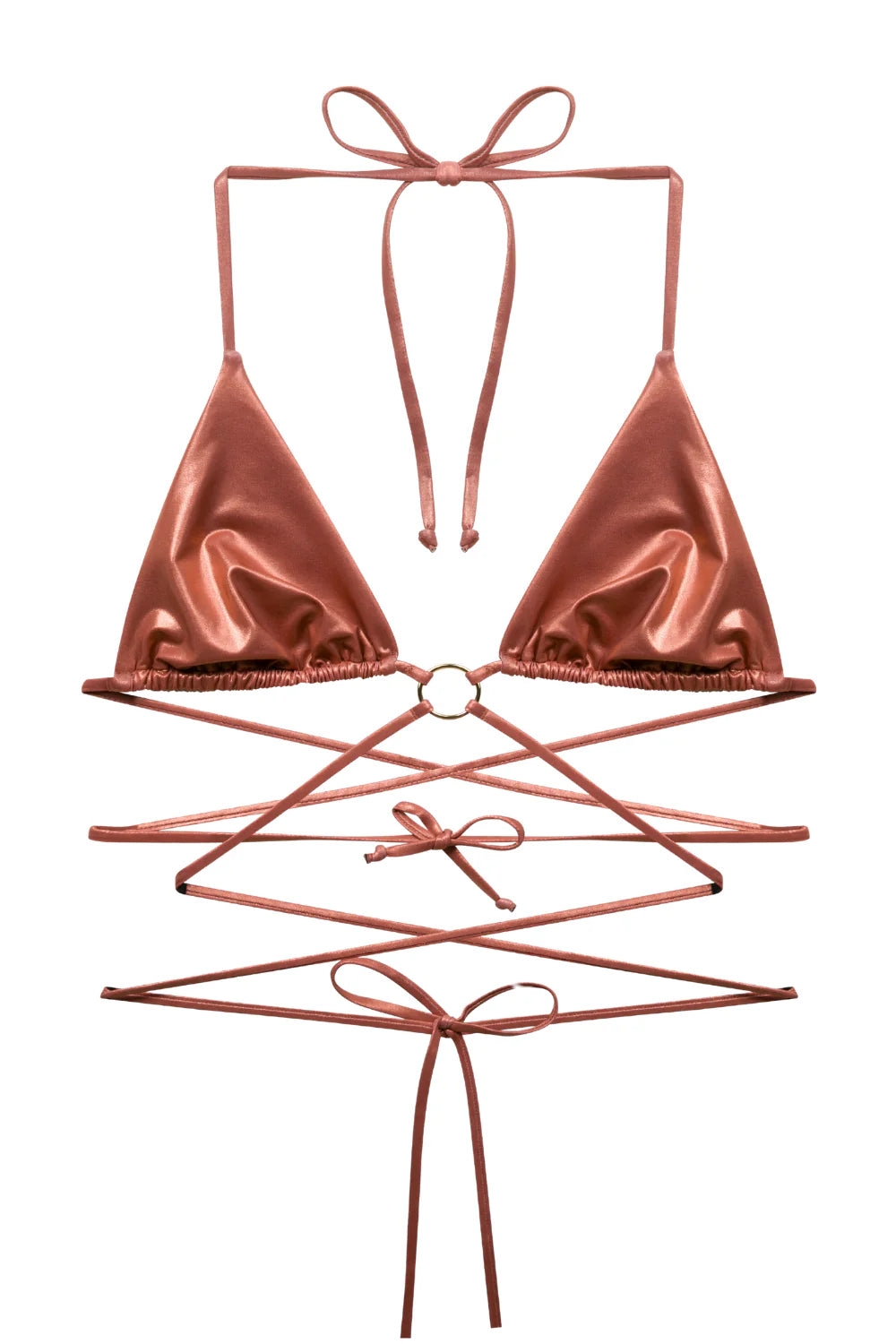 The 'Brunette Bombshell' top is a testament to the allure of simplicity intertwined with intricate detail. In a luxurious shade of deep cinnamon, this halter-style piece captivates with its interplay of straps that wrap around the body, evoking a sense of sophistication and intrigue. It’s the quintessential choice for those who wield their femininity with confidence and a touch of mystique.