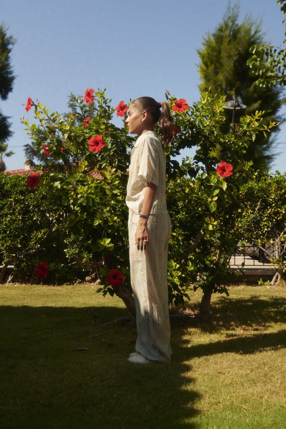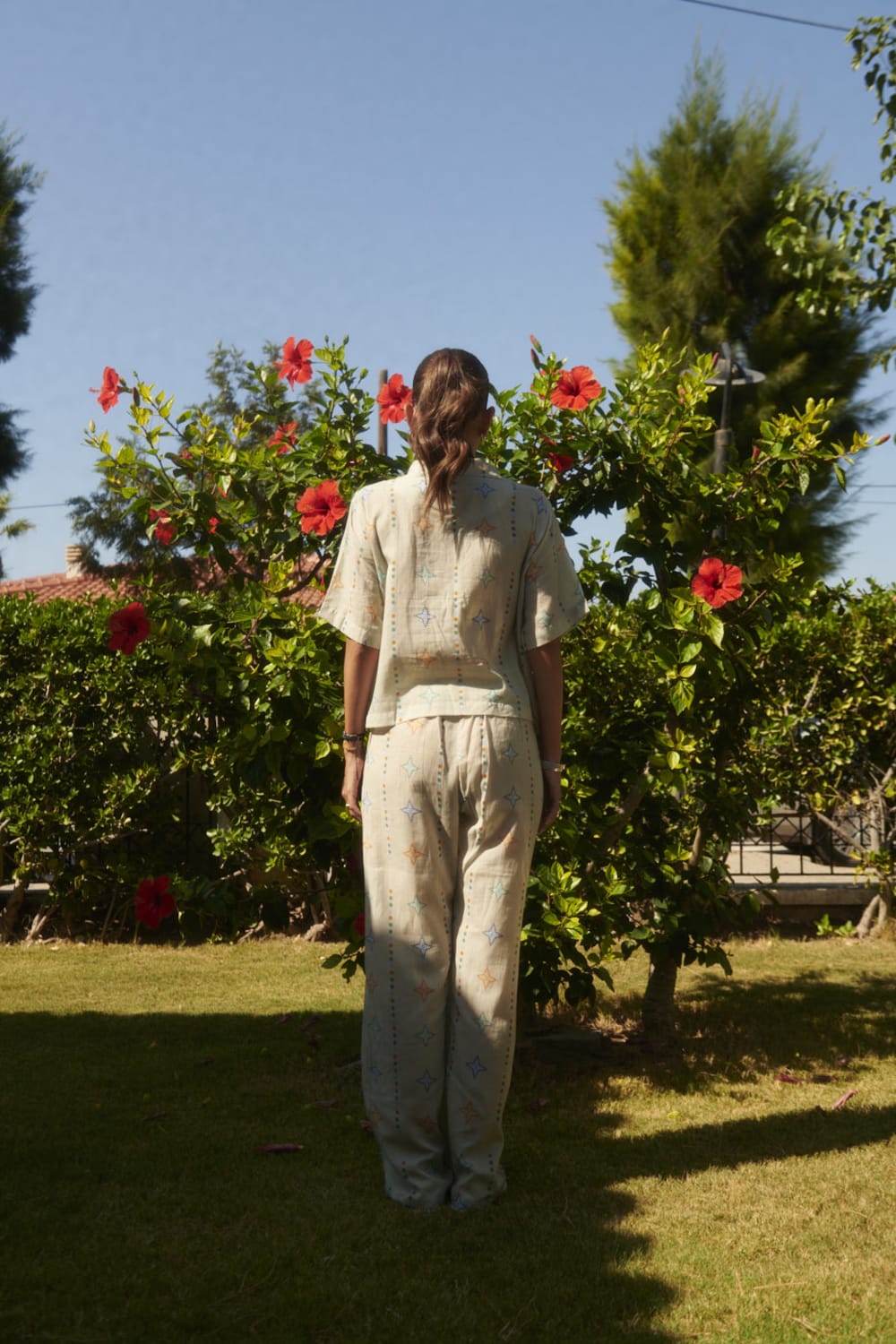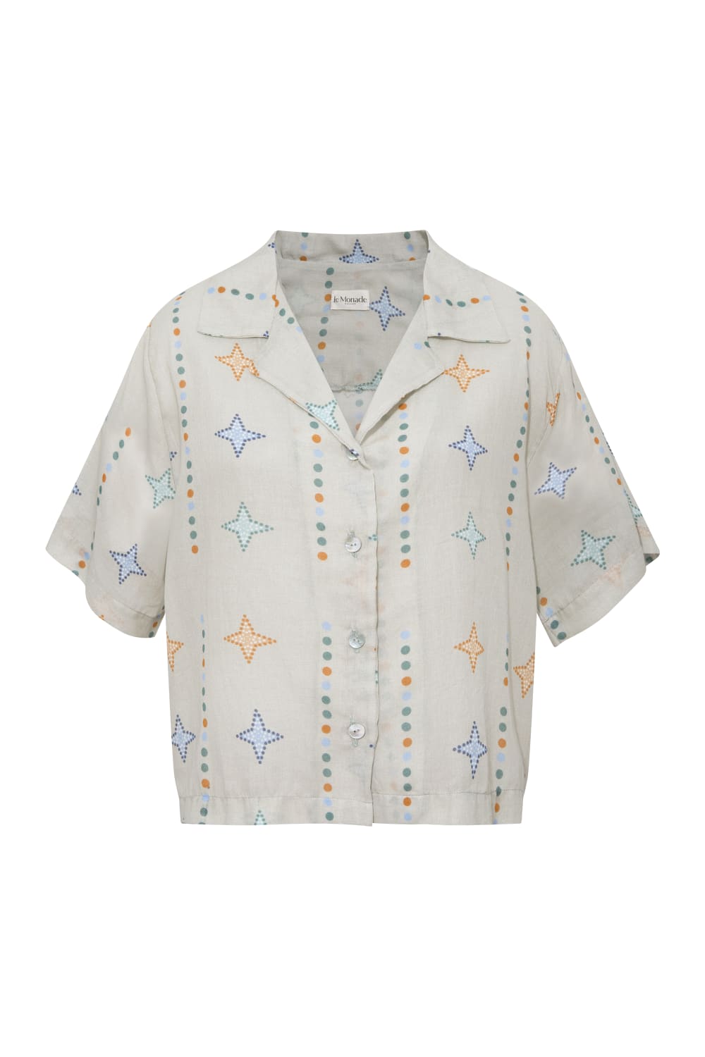 Yıldız Desenli Kısa Kollu GömlekDesenler, Sanatçı Defne Camcıoğlu’nun eserlerinden oluşturulmuştur,%100 Pamuk,Ürün, dökümlü ve yumuşak dokulu Vual kumaştan üretilmiştir,Yıldız desenlerden oluşan eser, vual kumaş'a dijital baskı yöntemi ile basılmıştır,Kısa kol, resort yaka detaylıdır.BAKIM ÖNERİLERİ:30 derecede yıkama yapılabilir,Ağartıcı kullanılamaz,Makinede kurutmayınız.Boy: 52 cmBel: 104 cm
