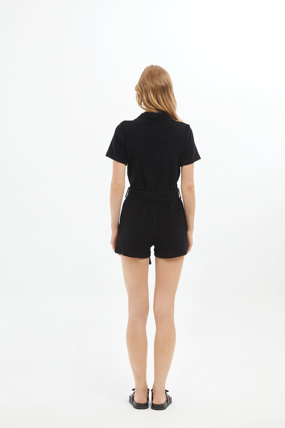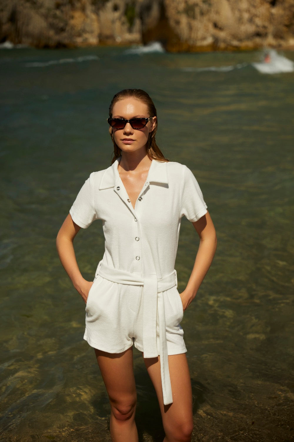 Minimal formu, yumuşak havlu dokusuyla tamamlayan Solea tulum; yaz günlerinin en konforlu eşlikçisi. Düğmeli önü, şort boy kesimi ve ayarlanabilir kemeriyle hem işlevsel hem zamansız. İster plajdan şehre, ister evden güne – her ana uyum sağlar.