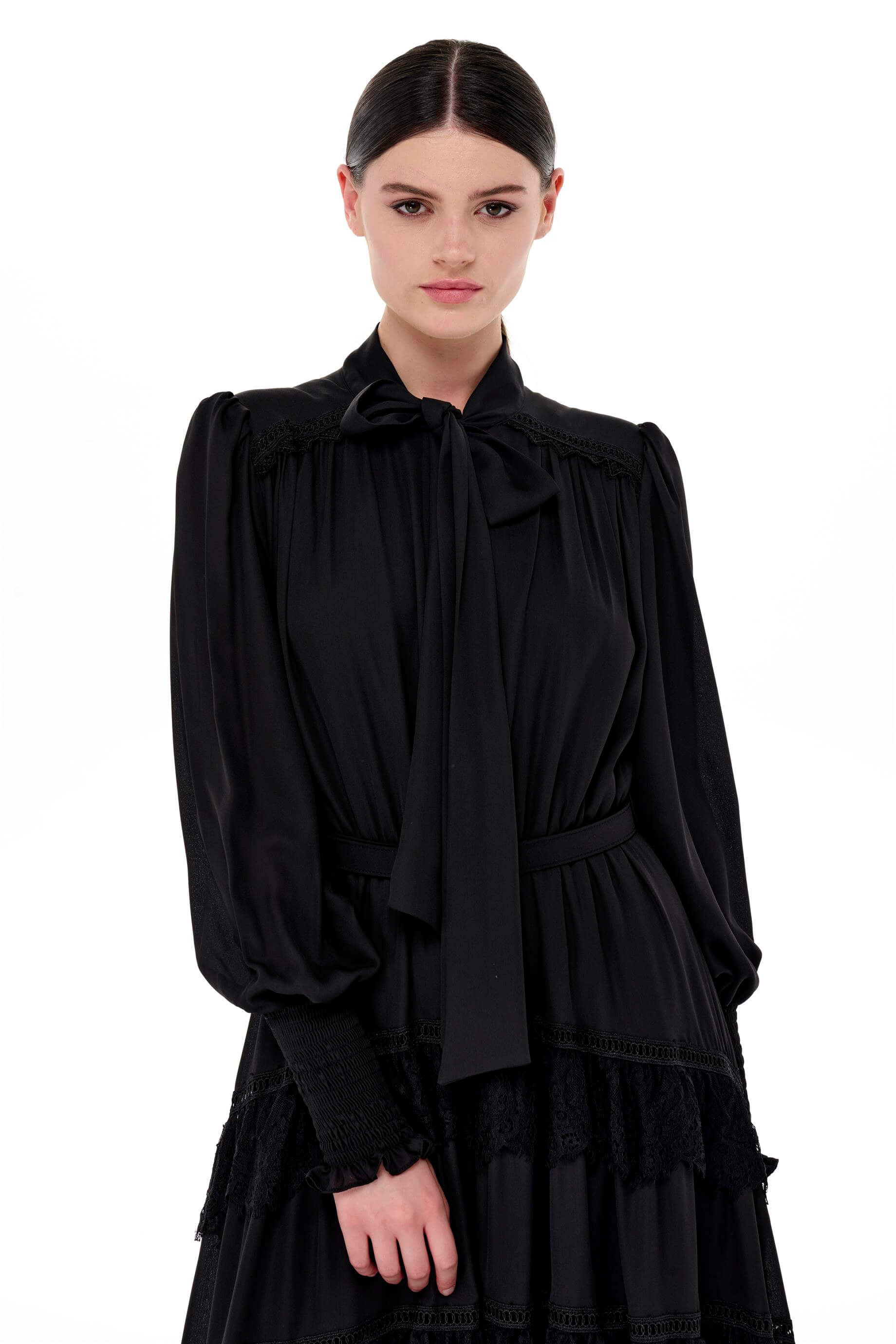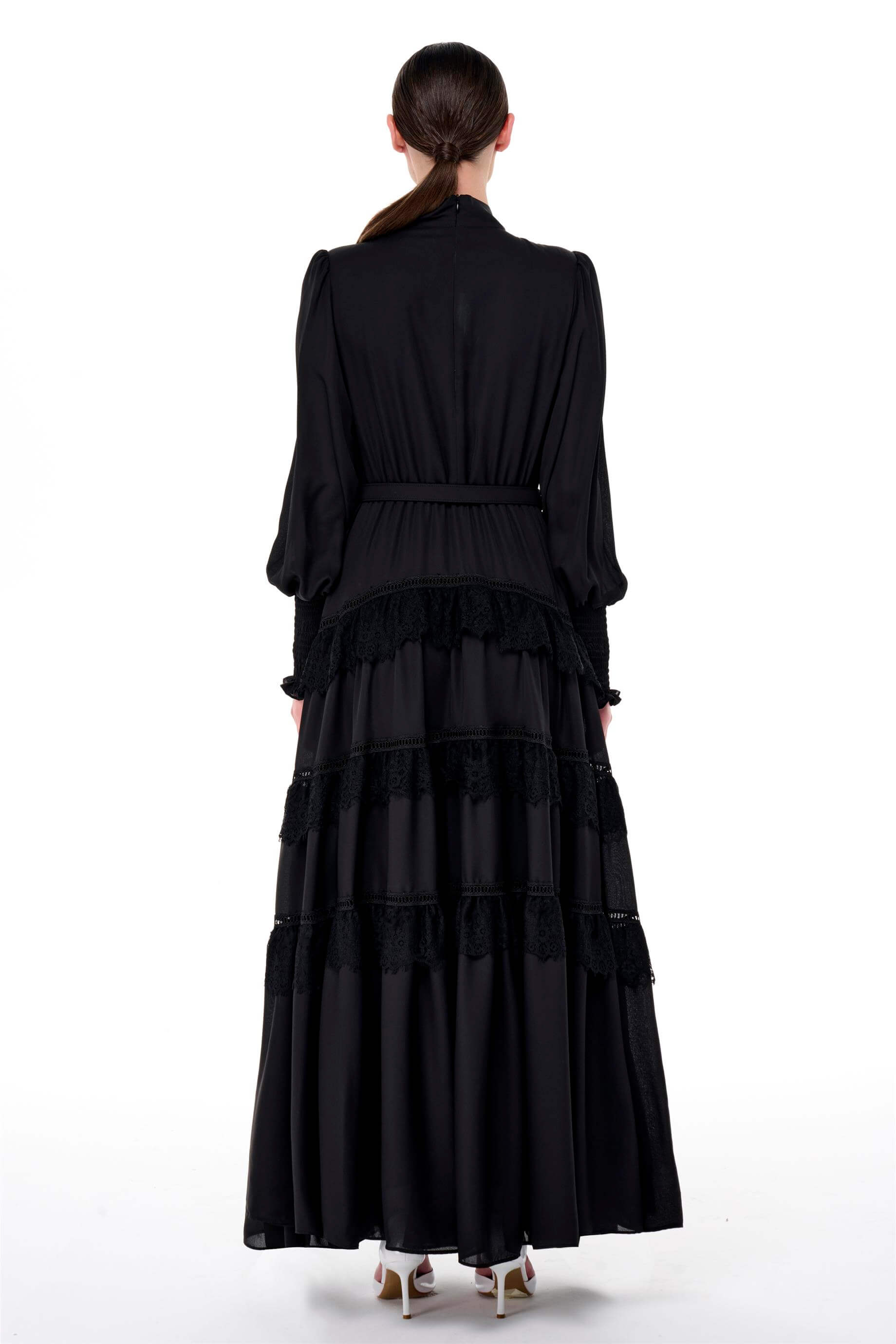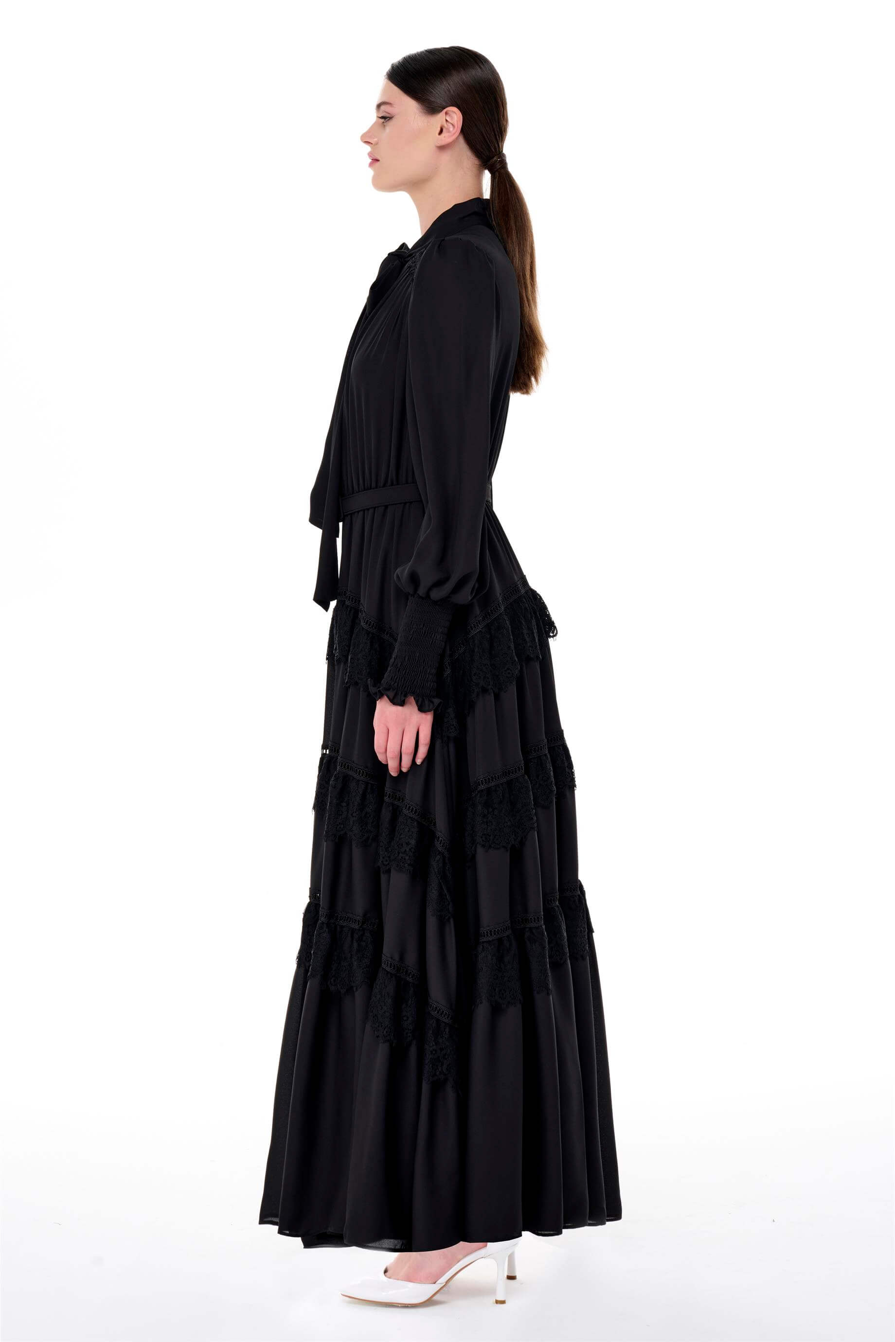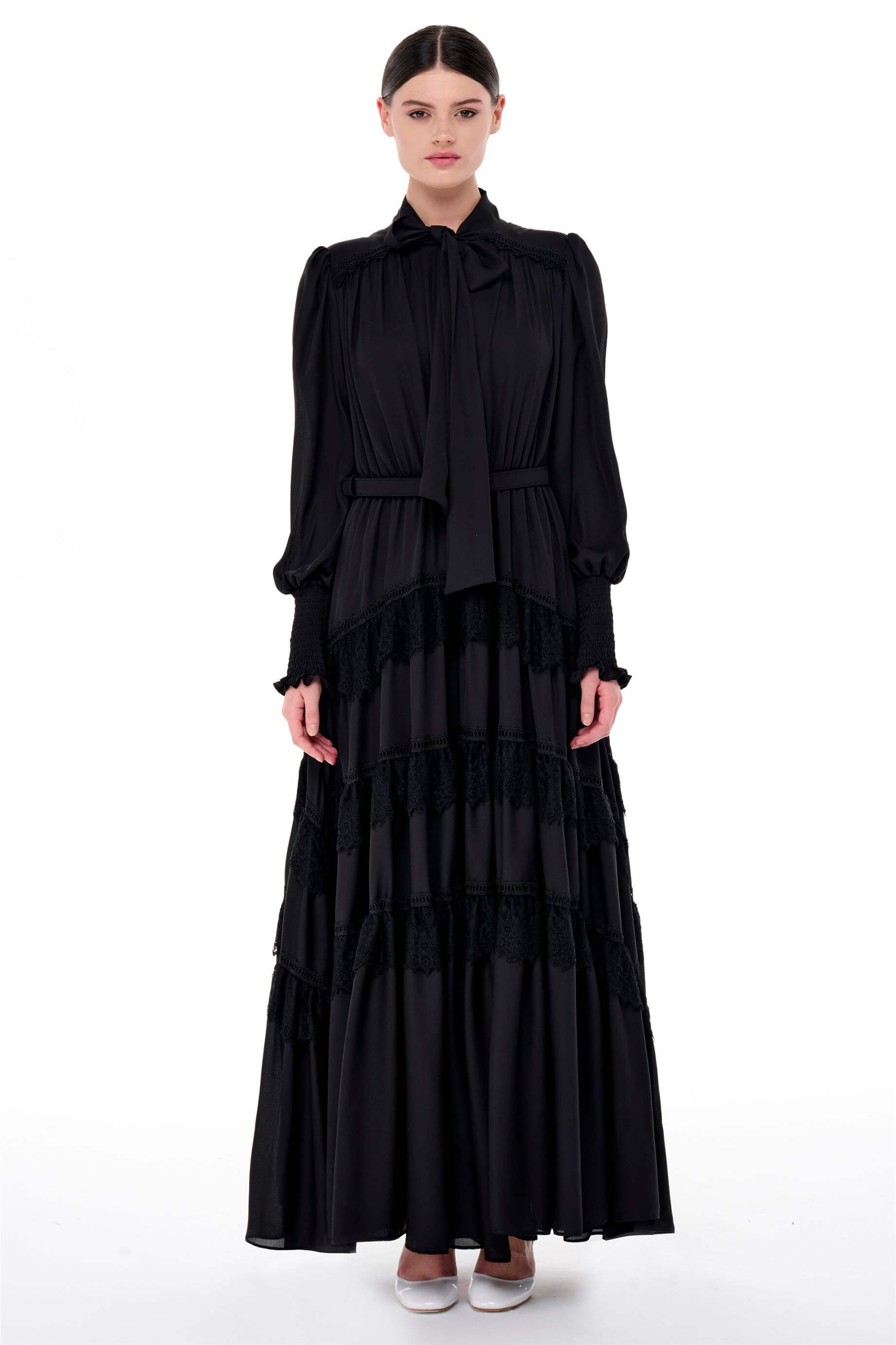 Eteği Kat Kat Büzgülü Uzun Elbise Siyah