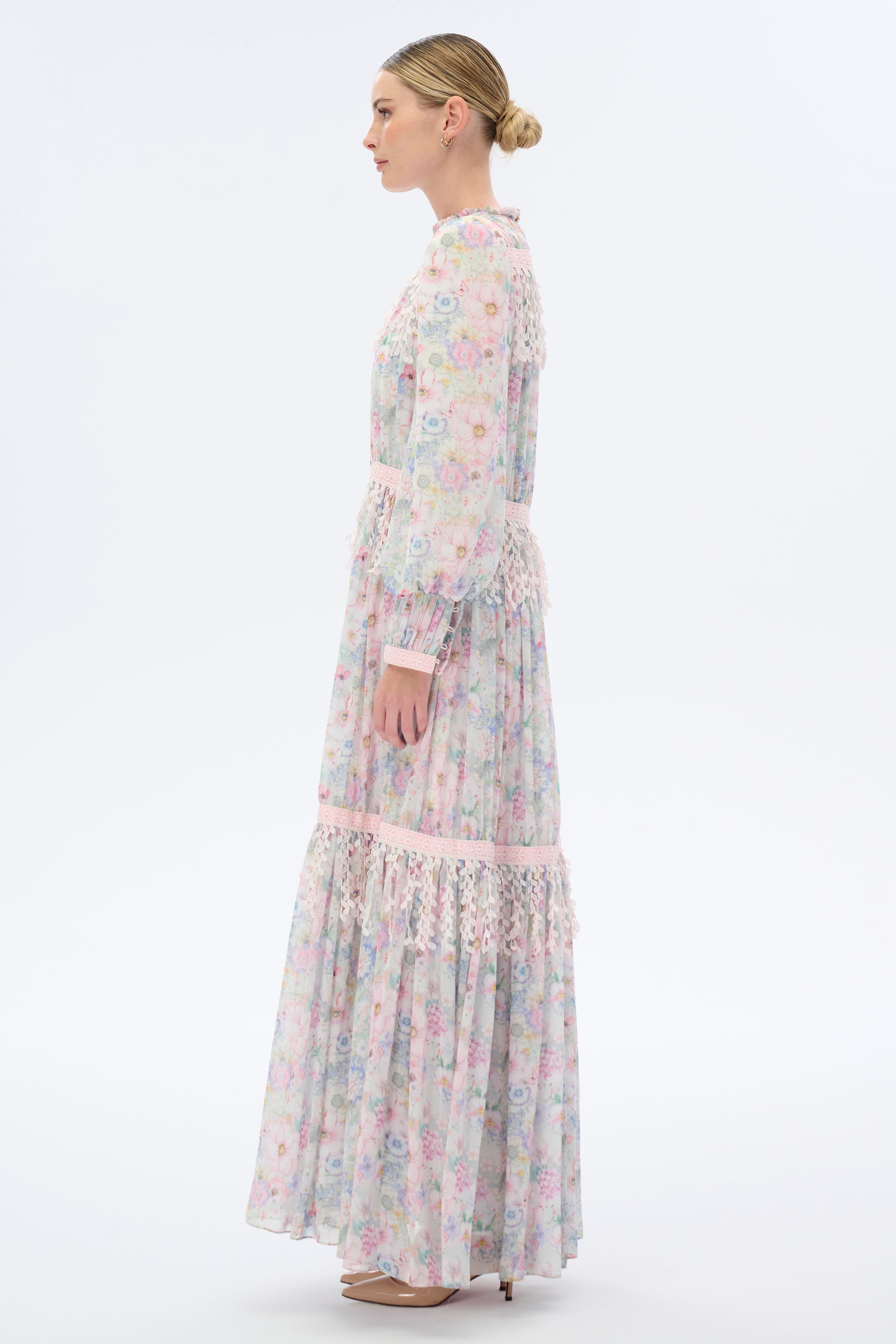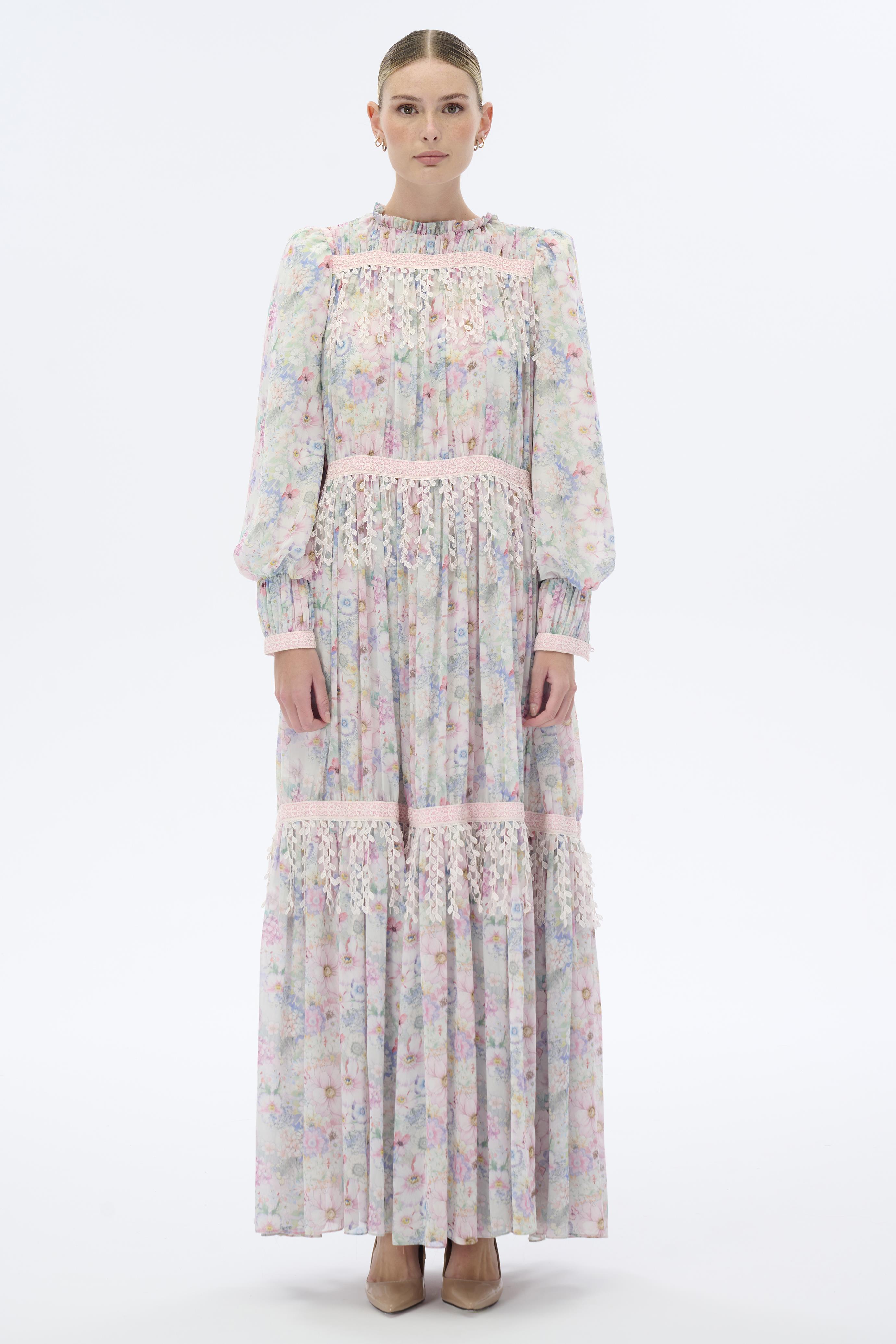 - Ürün Açıklaması: Sonbahar deseni ile çiçek desenlerinin harmanlandığı bu elbise; şifon kumaşı ve pamuk astar sayesinde güçlü bir duruş sağlar. Şerit dantelden sarkan yapraklar bu elbiseye romantik bir hava katıyor.