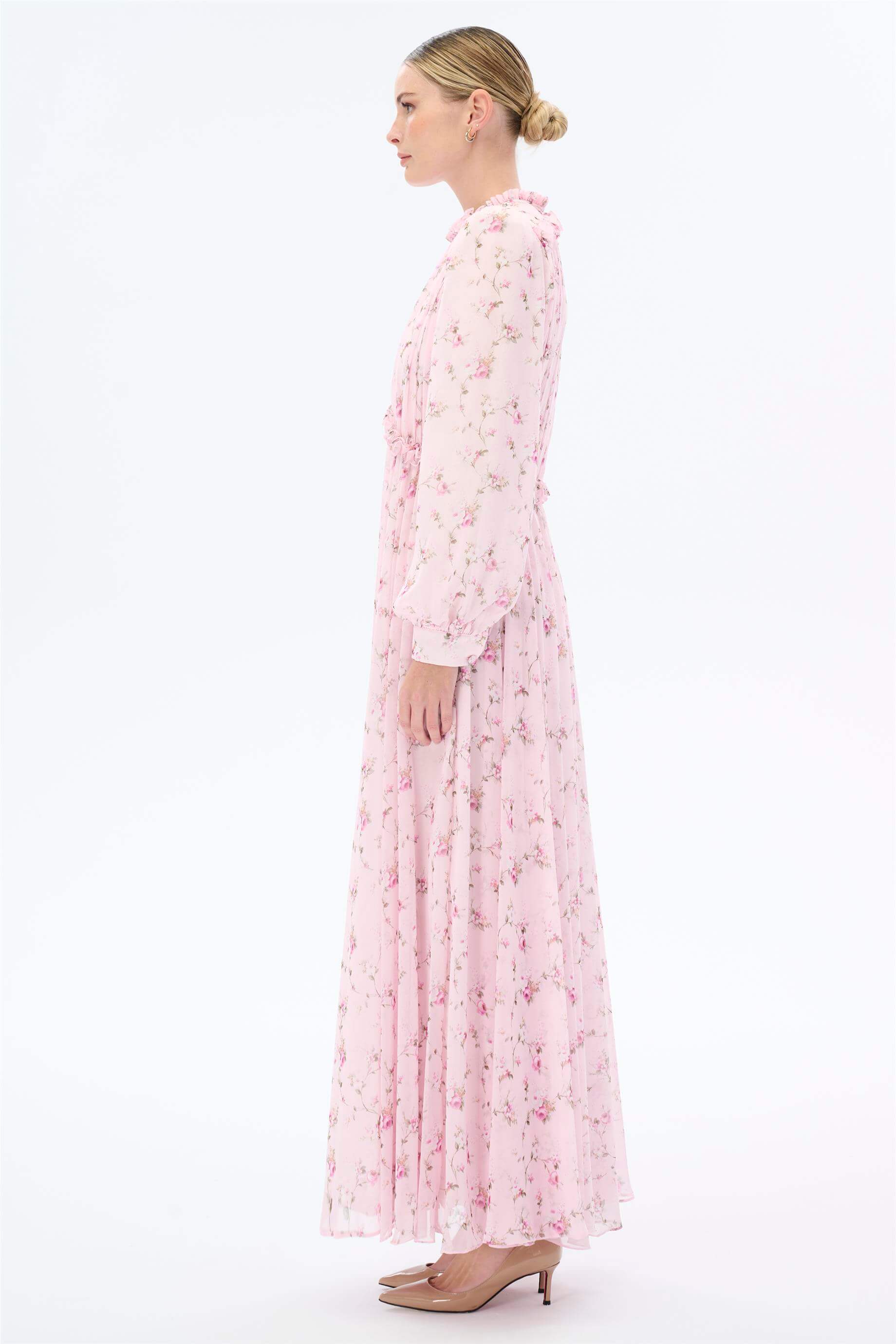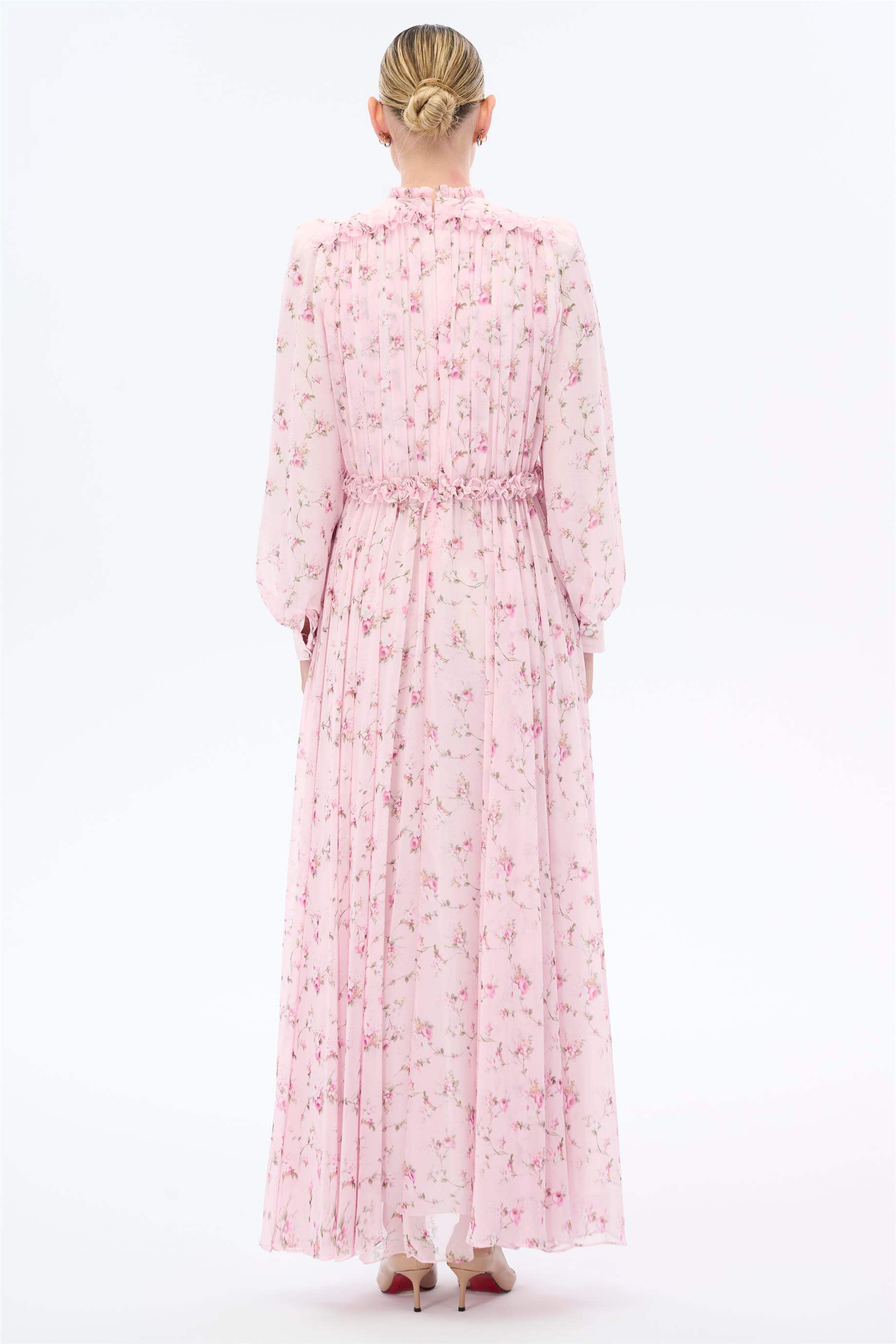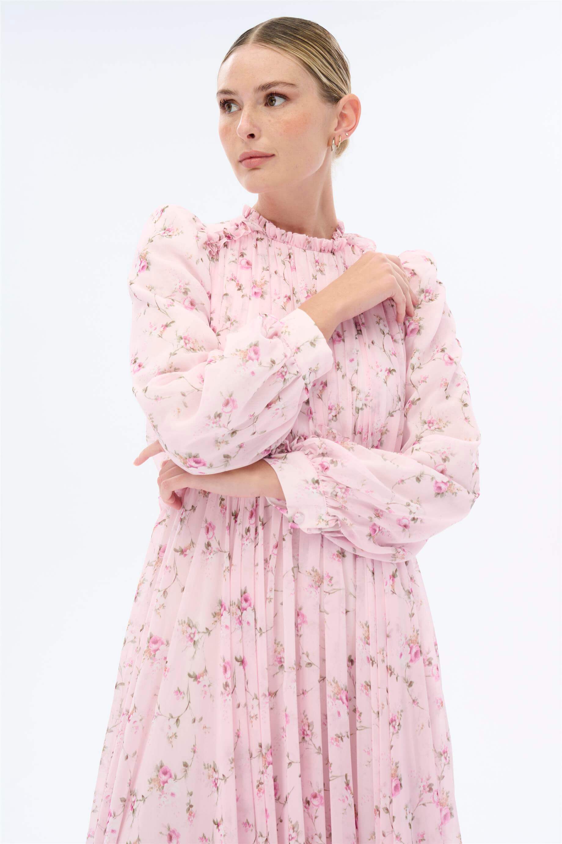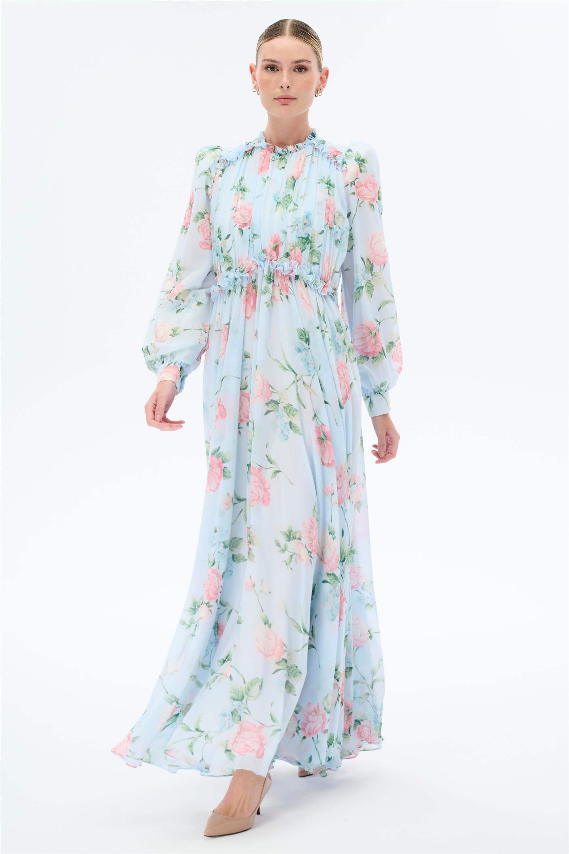 Yakası Büzgü Detaylı Çiçek Desenli Elbise