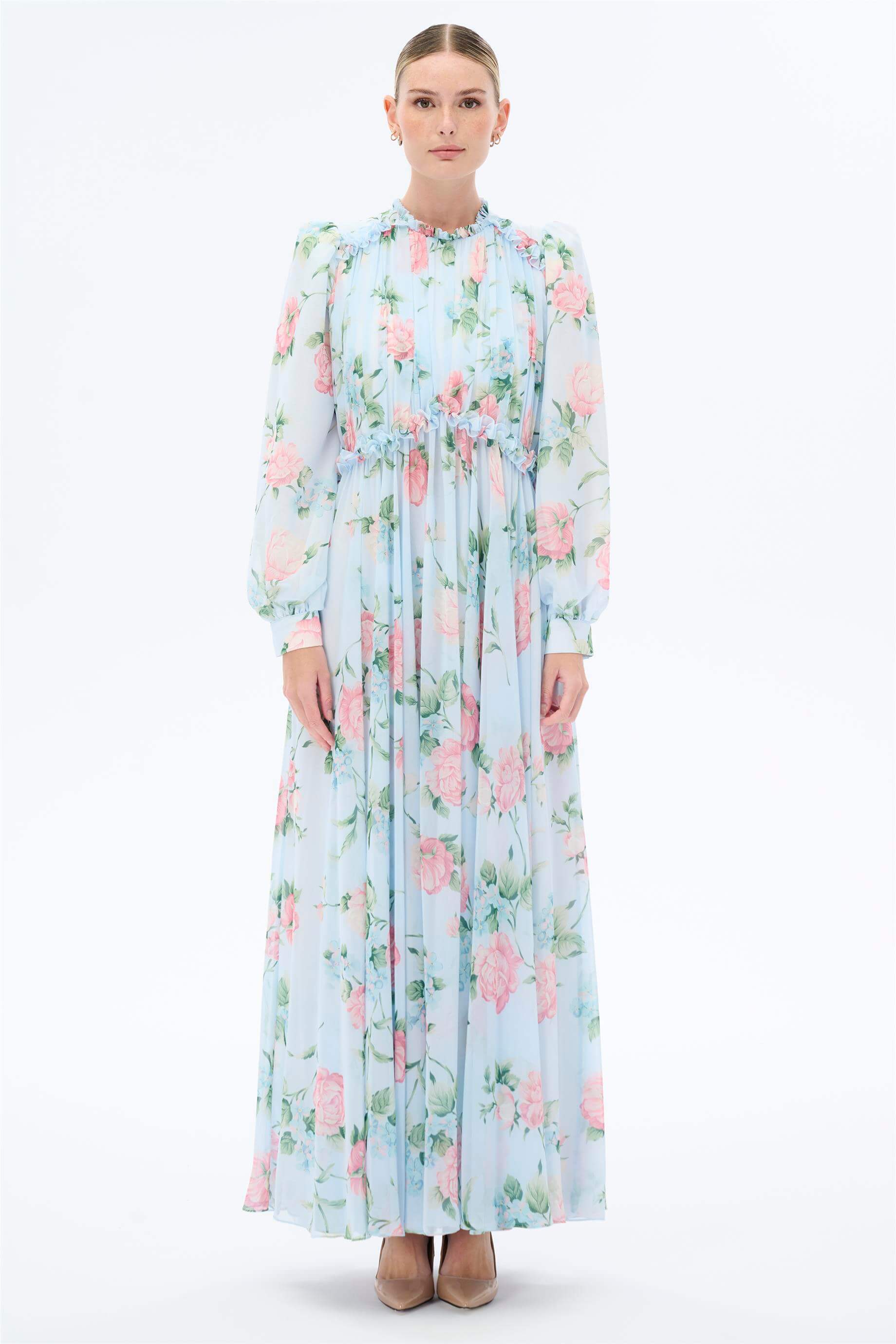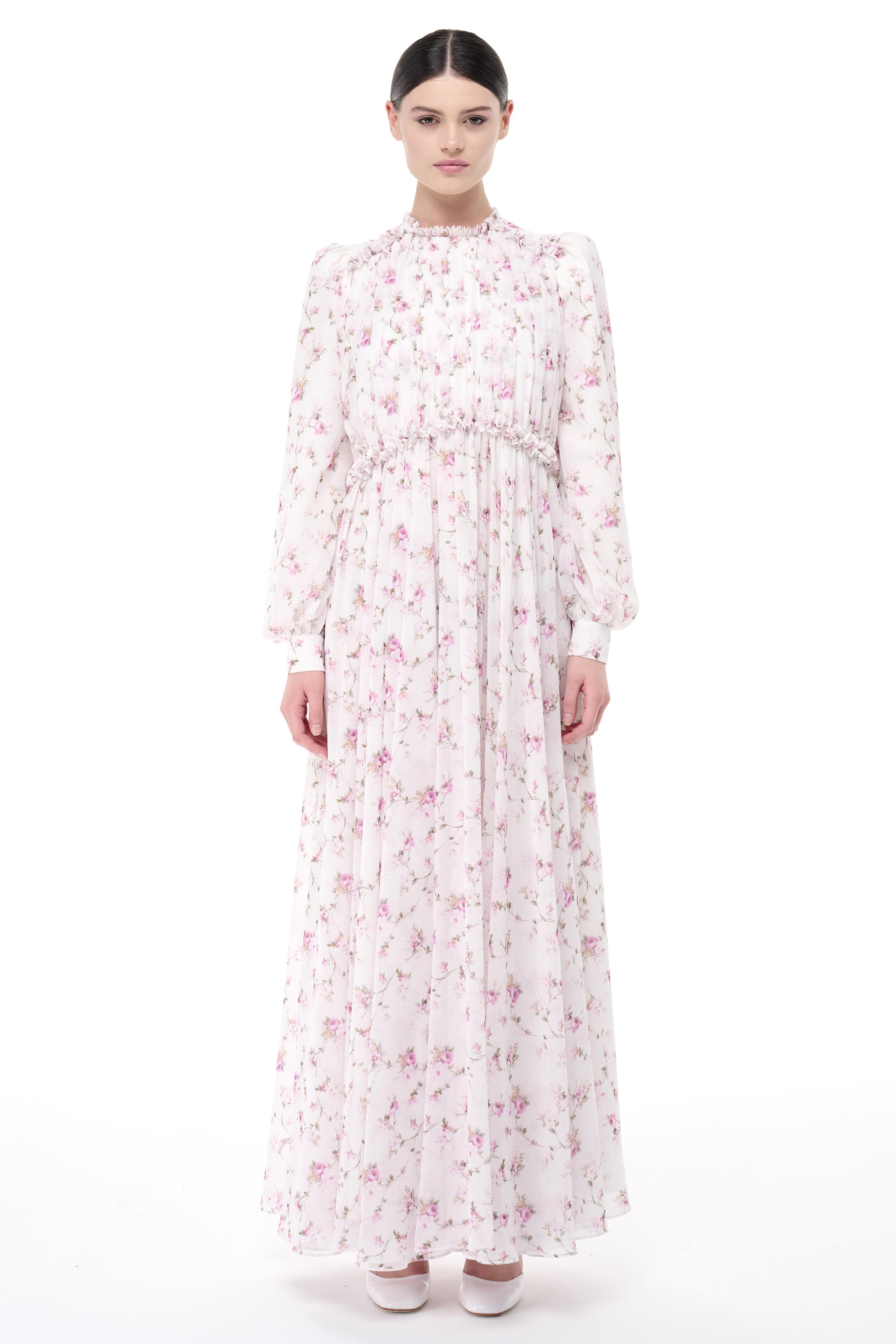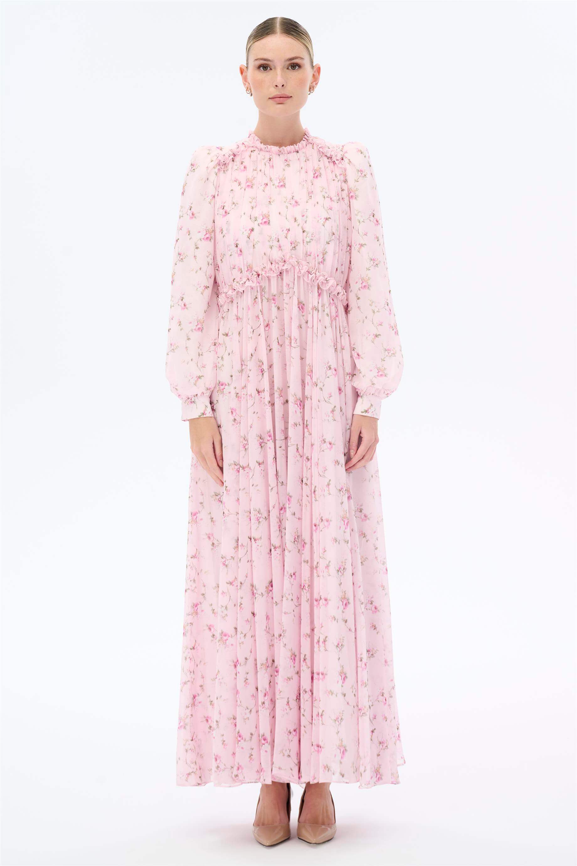 Yakası Büzgü Detaylı Çiçek Desenli Elbise
