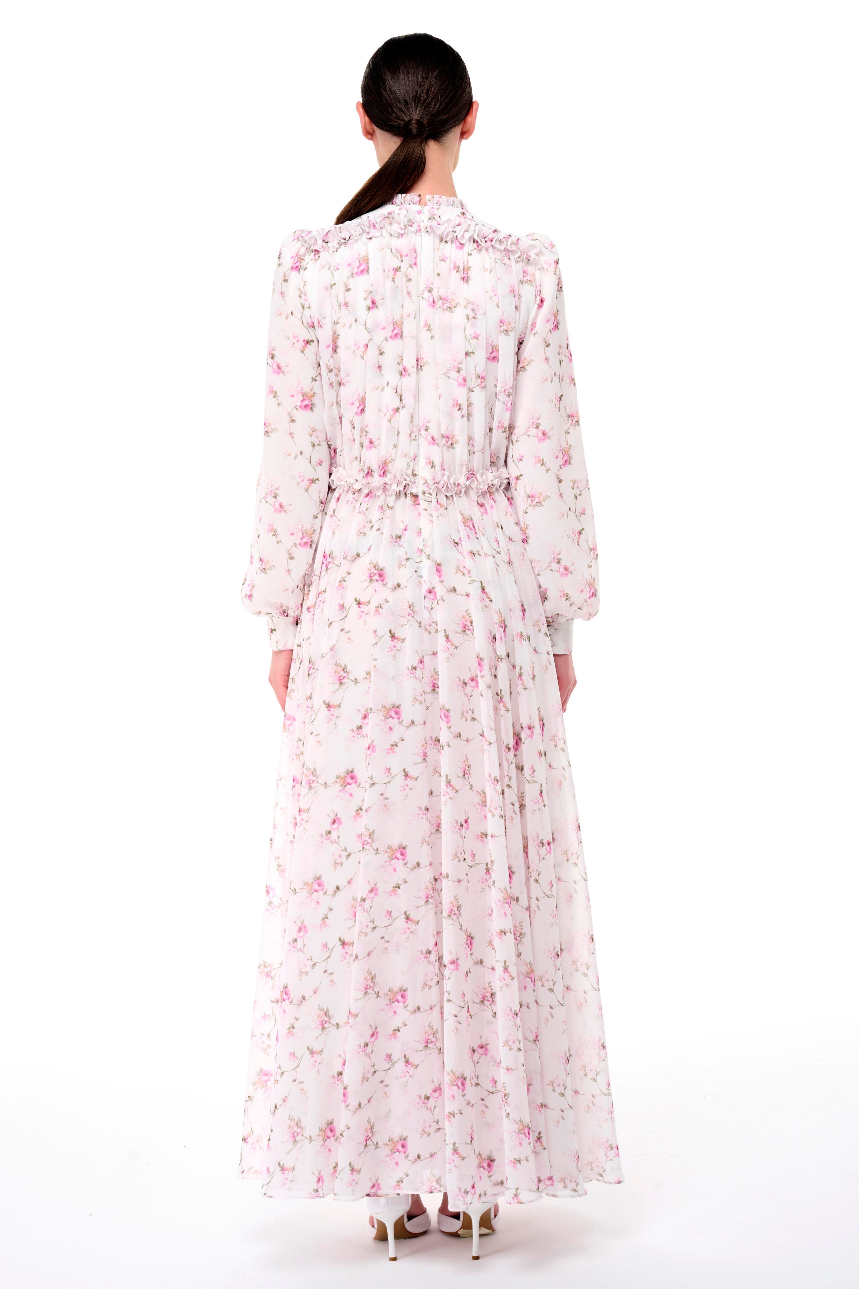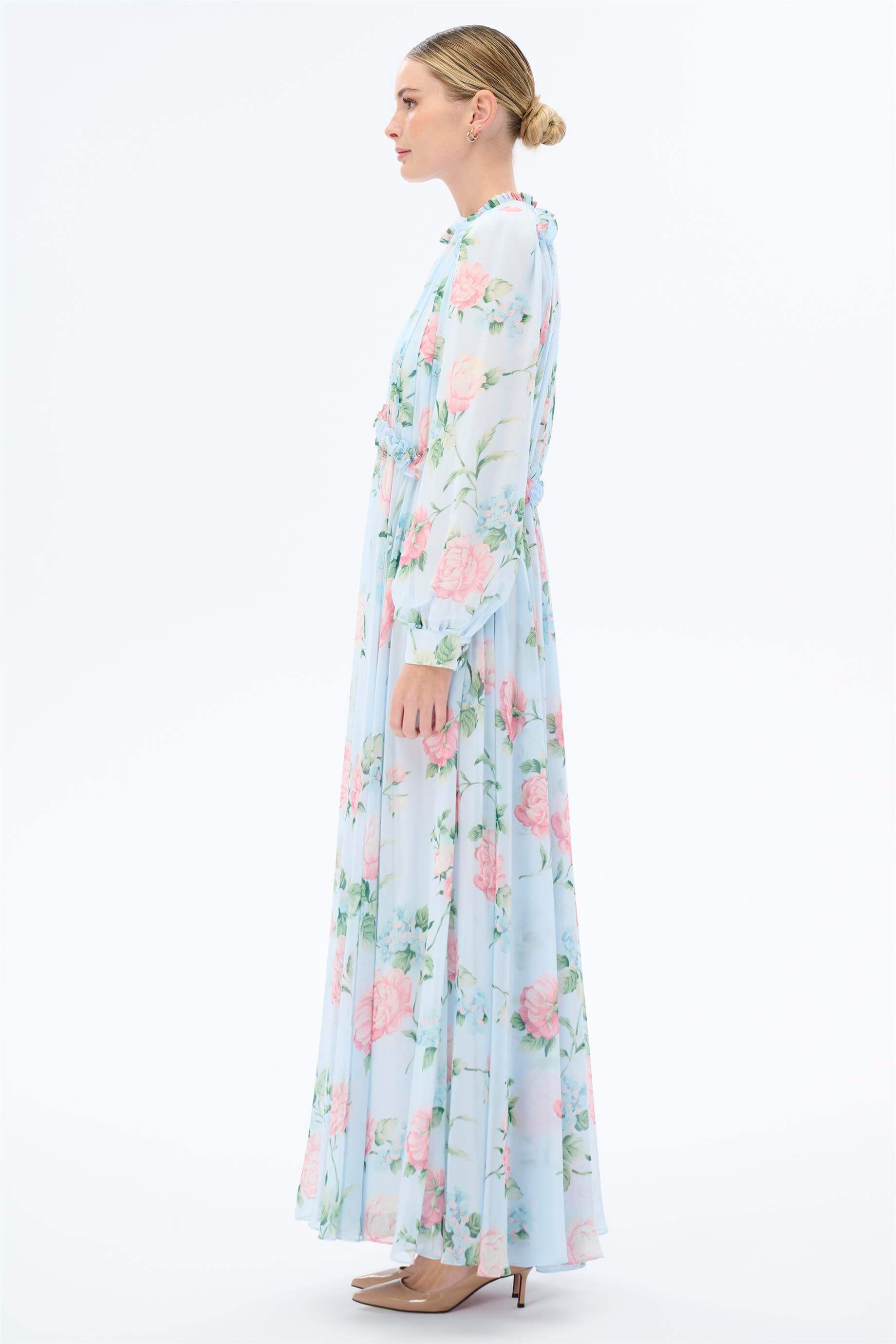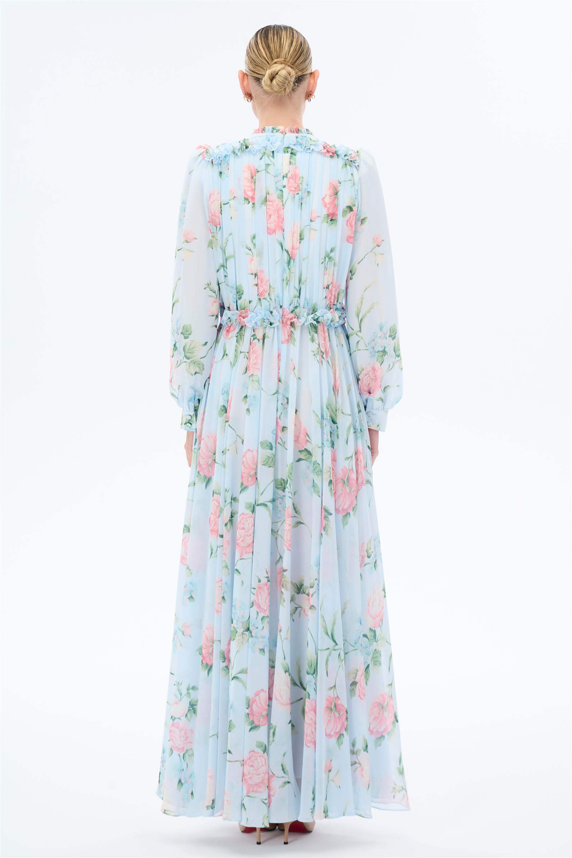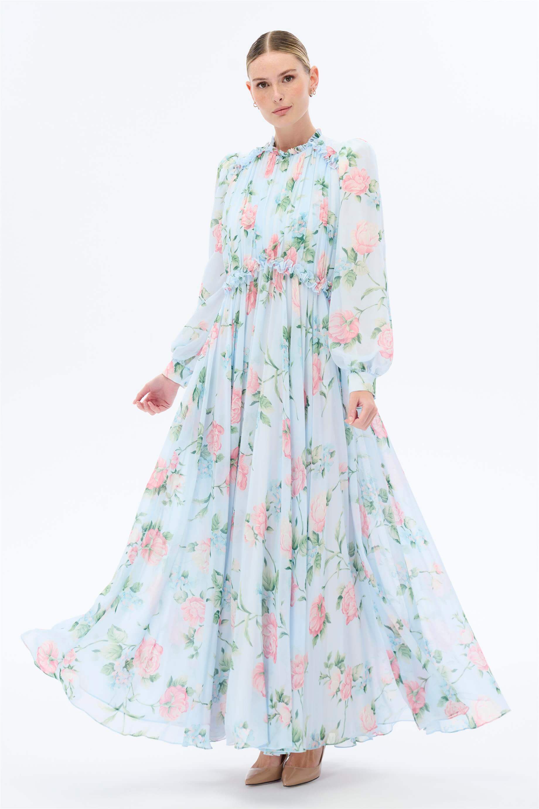 Yakası Büzgü Detaylı Çiçek Desenli Elbise