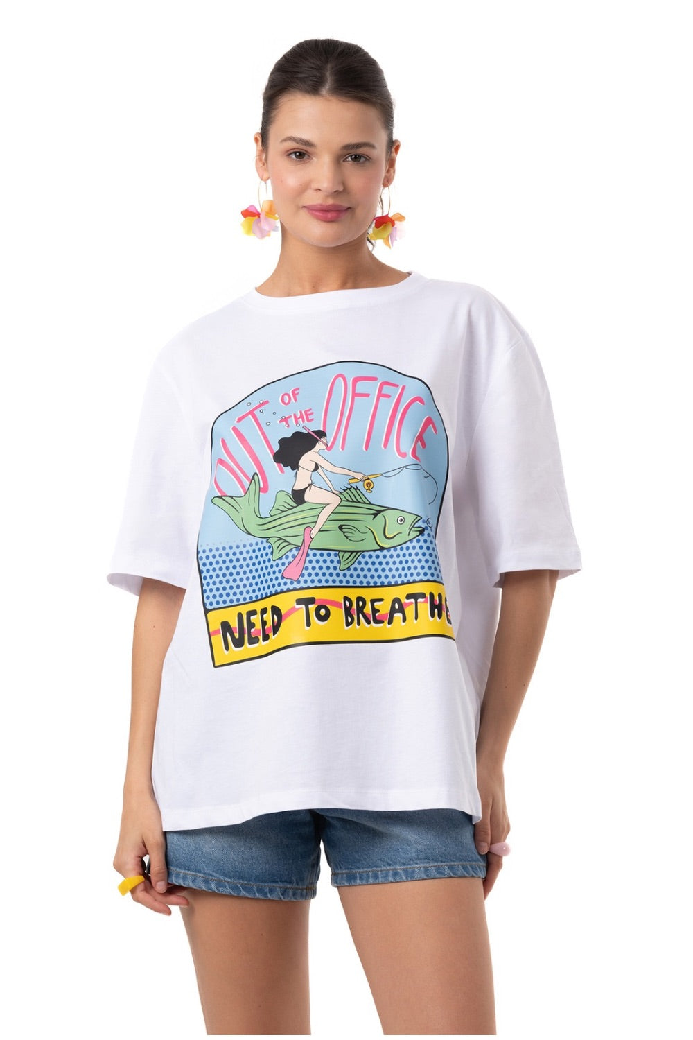 "Out of the Office - Need to Breathe" mesajıyla herkese tatil modunda olduğunu göster! Her anın tadını birlikte çıkartmak için rahat kesimi, yüksek kalite emprime baskısı ve oversize kalıbı her anınızda konforlu ve şık hissetmenizi sağlayacak.