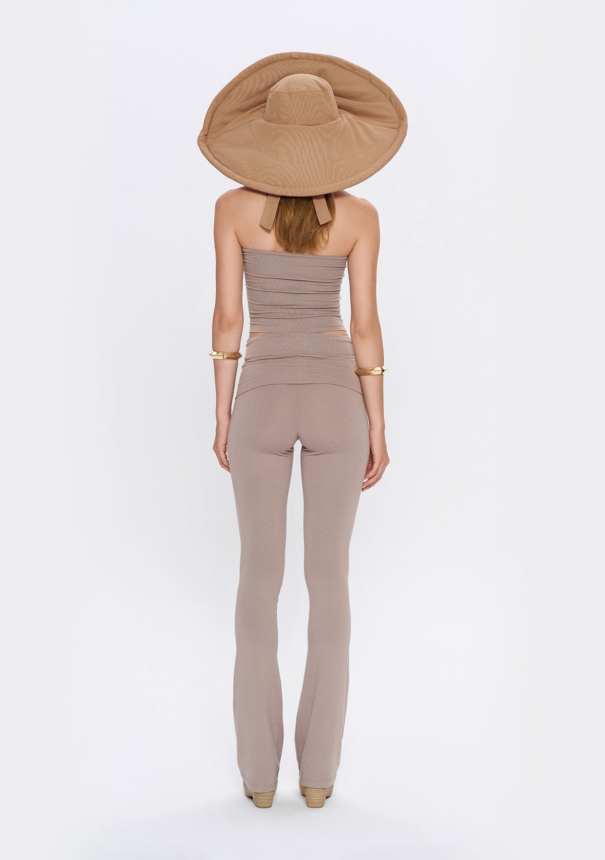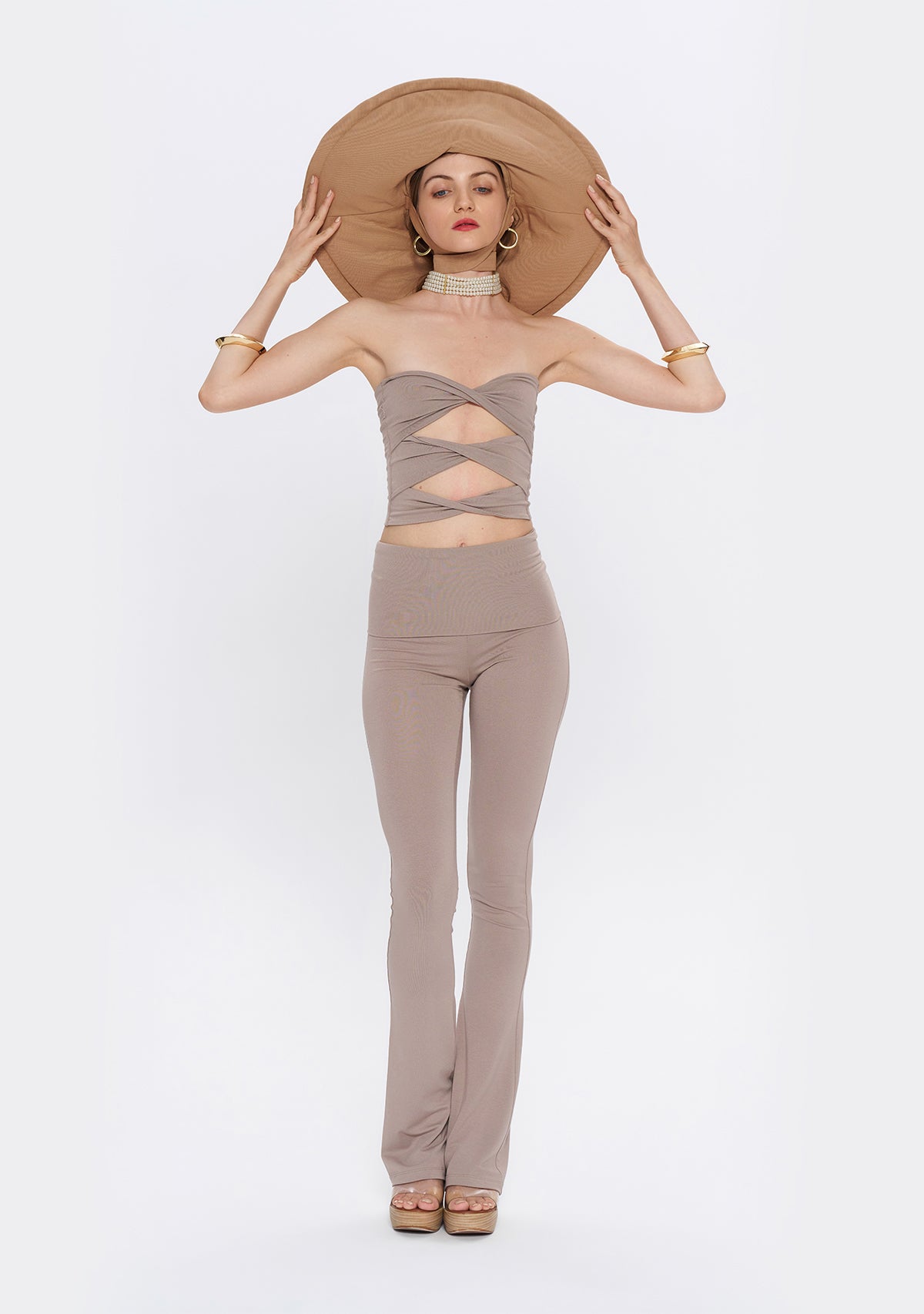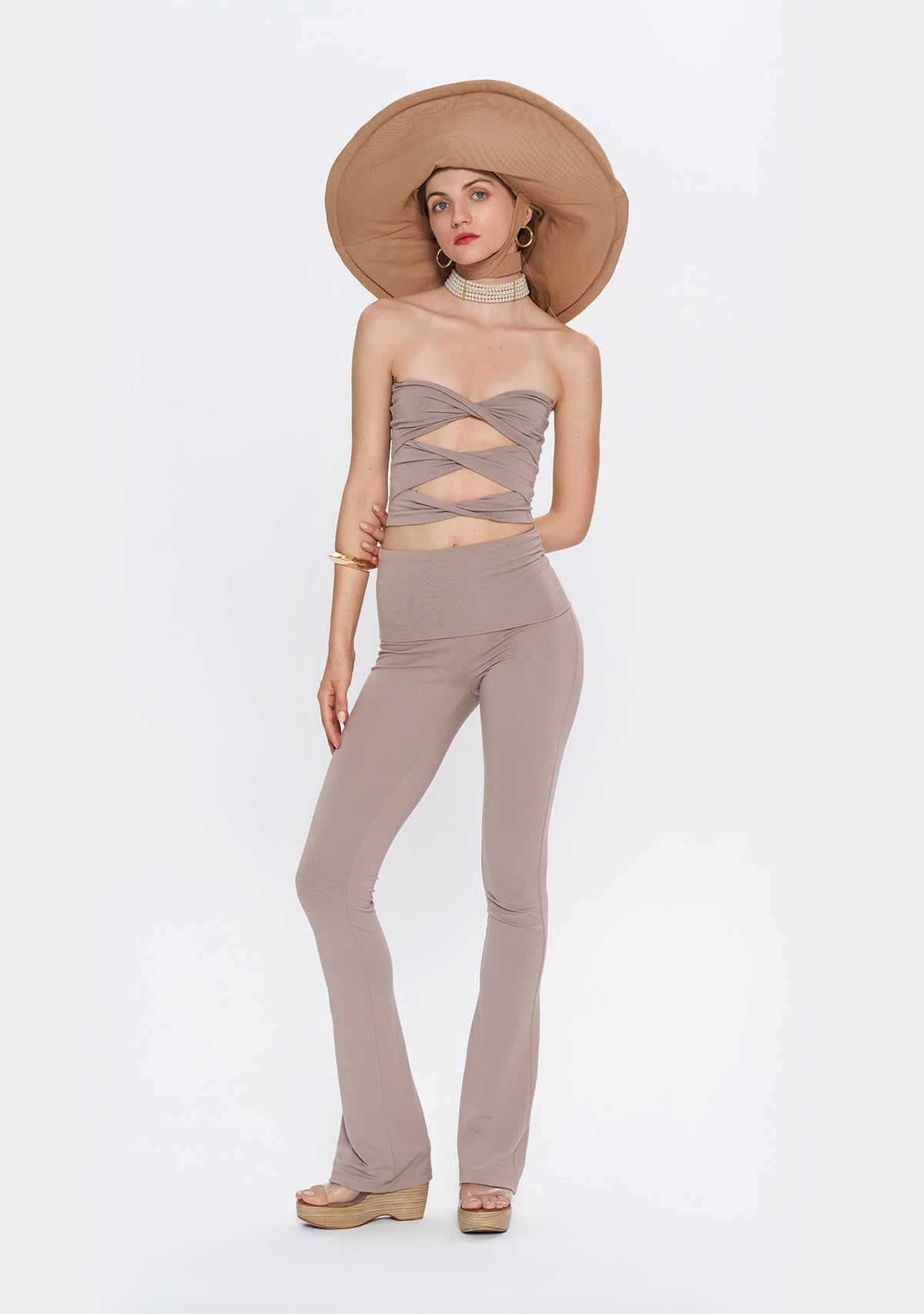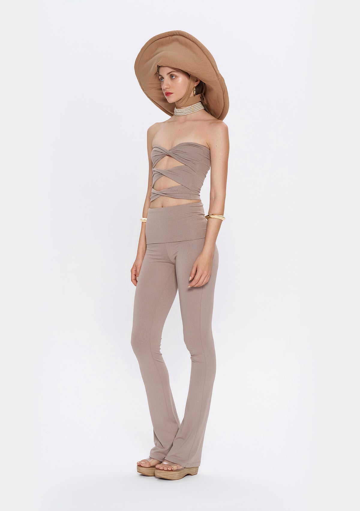 - Yumuşak kumaşı ve katlanabilir beli ile Yüksek Bel İspanyol Paça Açık Kahverengi Tayt , hem düşük bel hem de yüksek bel olarak kullanma esnekliği sunar.