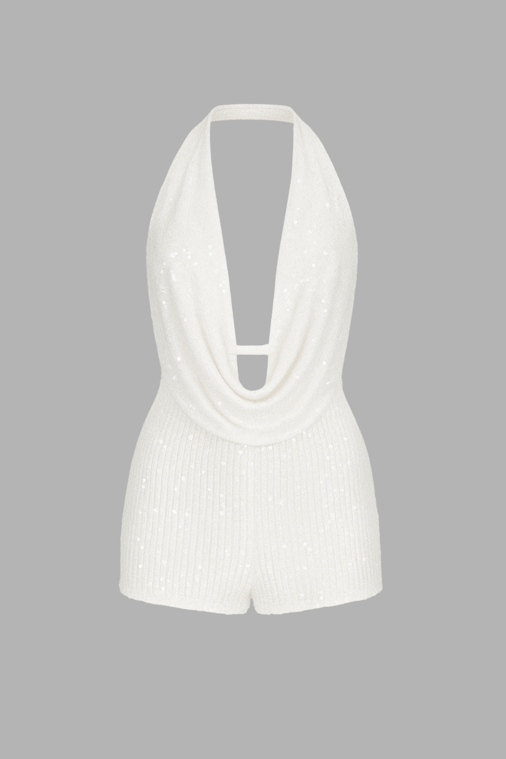 İnce askılarla bağlanan sırt detayı, vücudu saran elastik şort kesim, tüm yüzeyde micro payet dokulu kumaş.