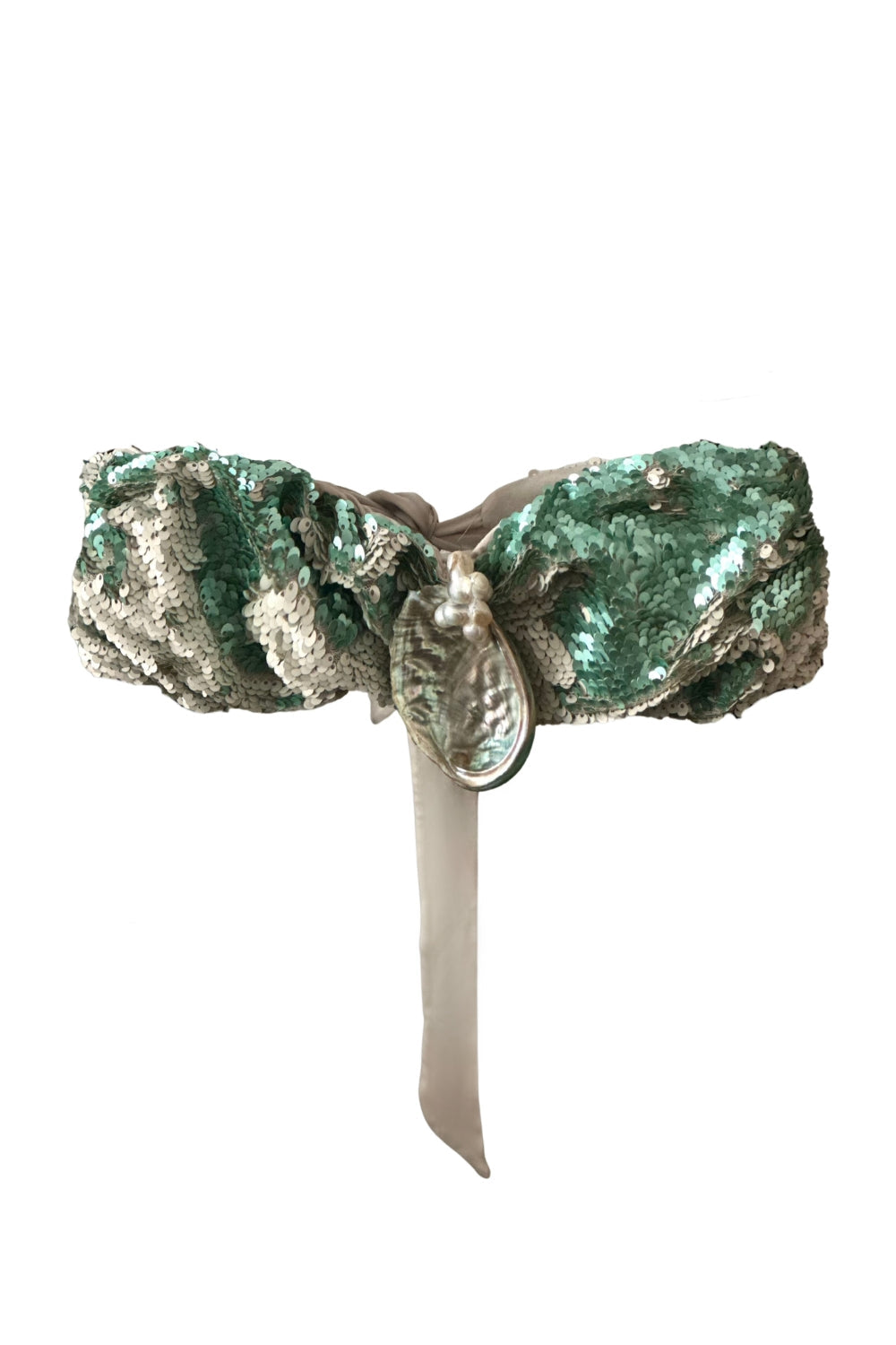 Bali'den özenle toplanmış İstiridye Kabuğu ve Doğal İncilerden oluşmaktadır.Sequin Lace kumaş kullanılarak üretilmiştir.