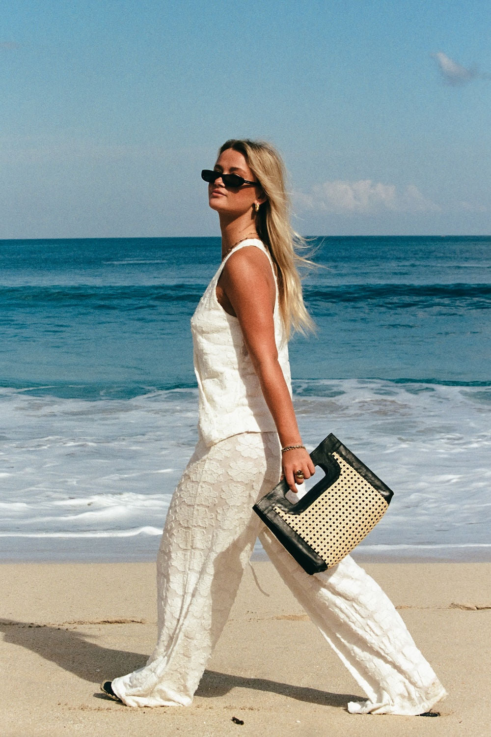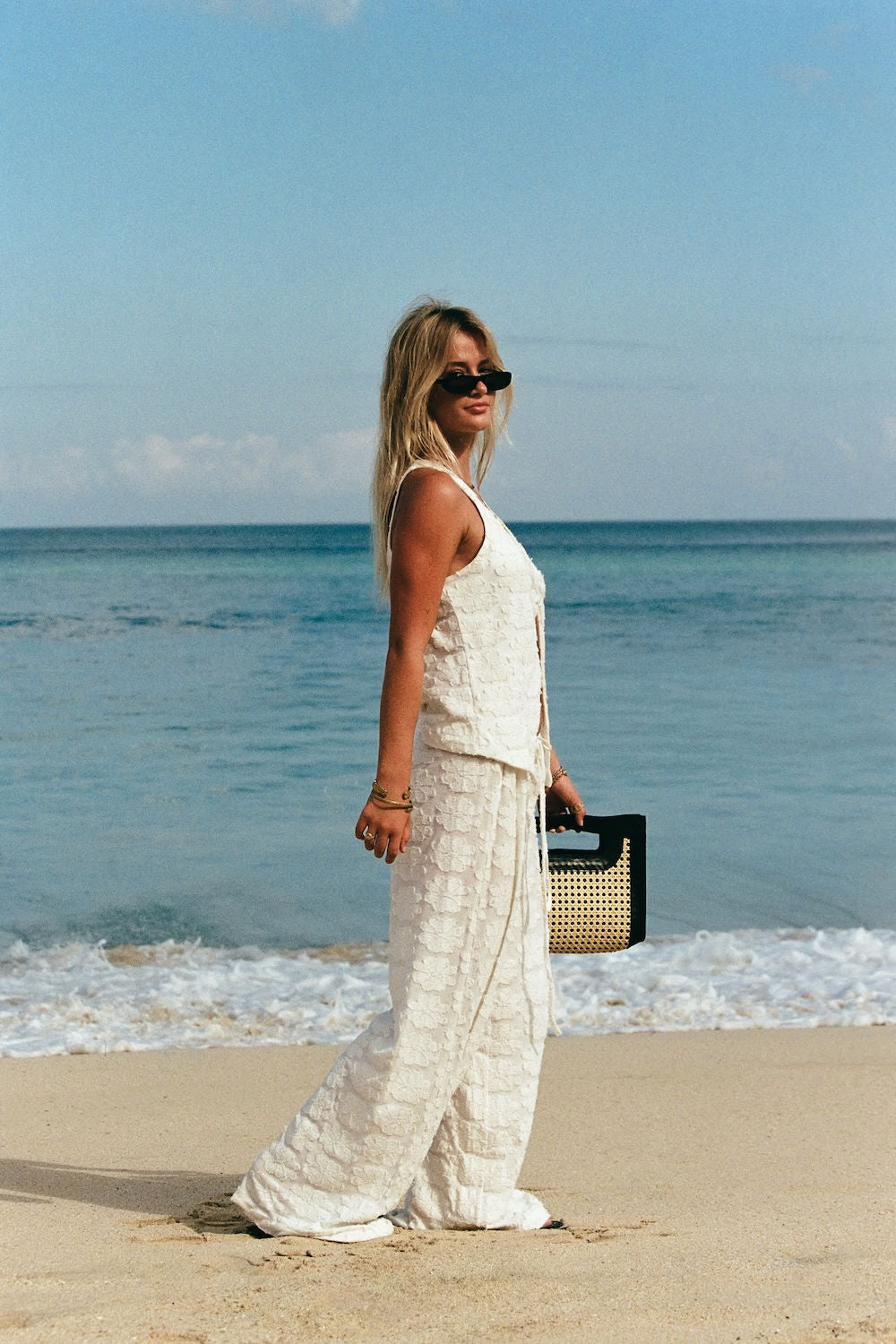 Handcrafted fabric in Bali from a textured, lightweight fabric, this sleeveless top features a front twist detail that subtly reveals the midriff. Designed for coastal days and sunlit getaways, it effortlessly combines elegance with ease. Pairs perfectly with the matching pants or styled solo for a relaxed, chic look.