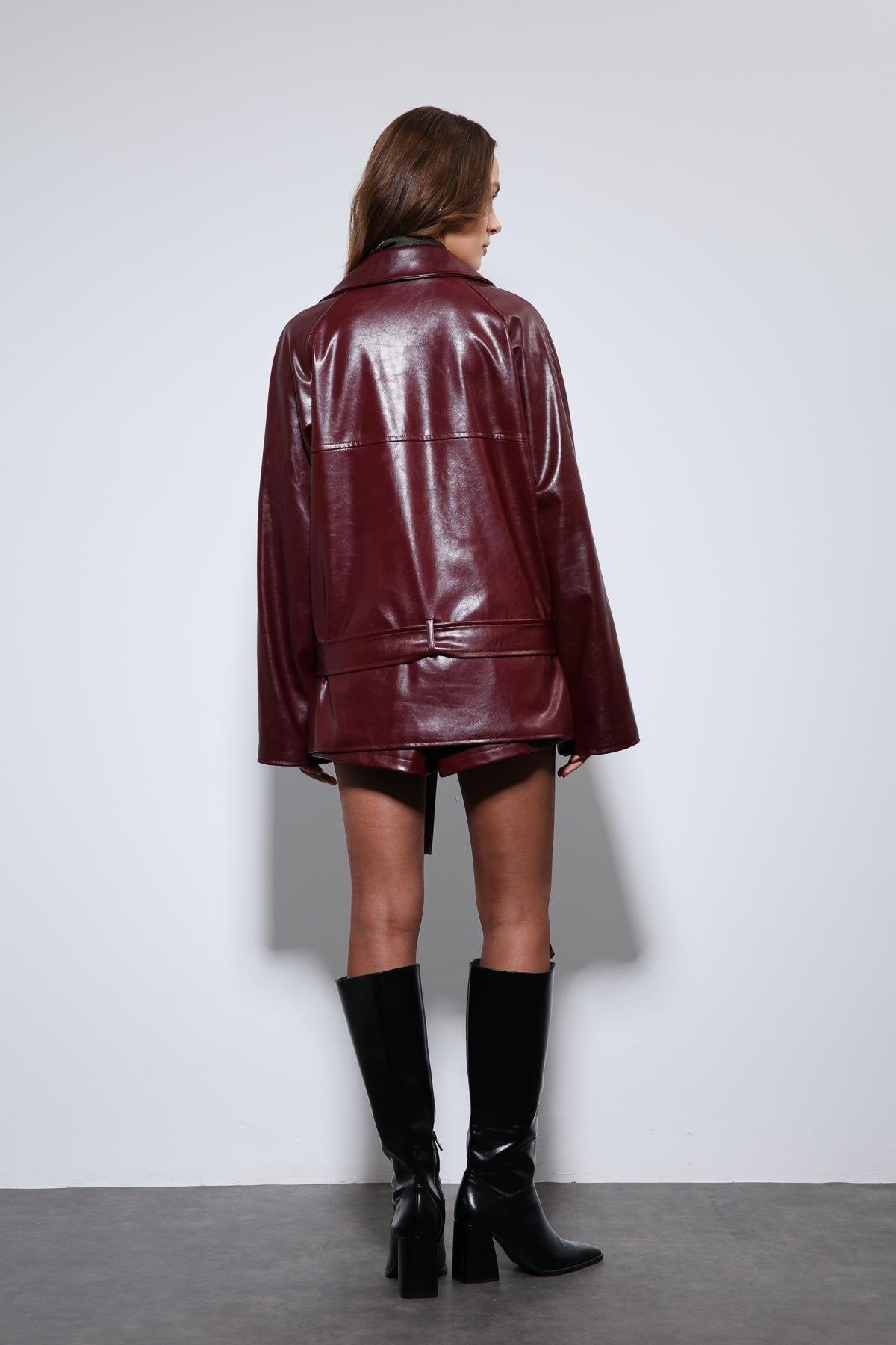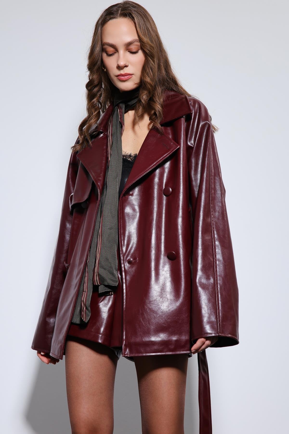 Bordo renkte, kemerli tasarıma sahip suni deri kadın trençkot modelidir. Yapılandırılmış formu, modern görünümü ve şık detaylarıyla hem günlük hem şehir stiline rahatlıkla uyum sağlar. Sezon boyunca kullanıma uygun, güçlü bir dış giyim parçasıdır. Türkiye’de üretilmiştir.