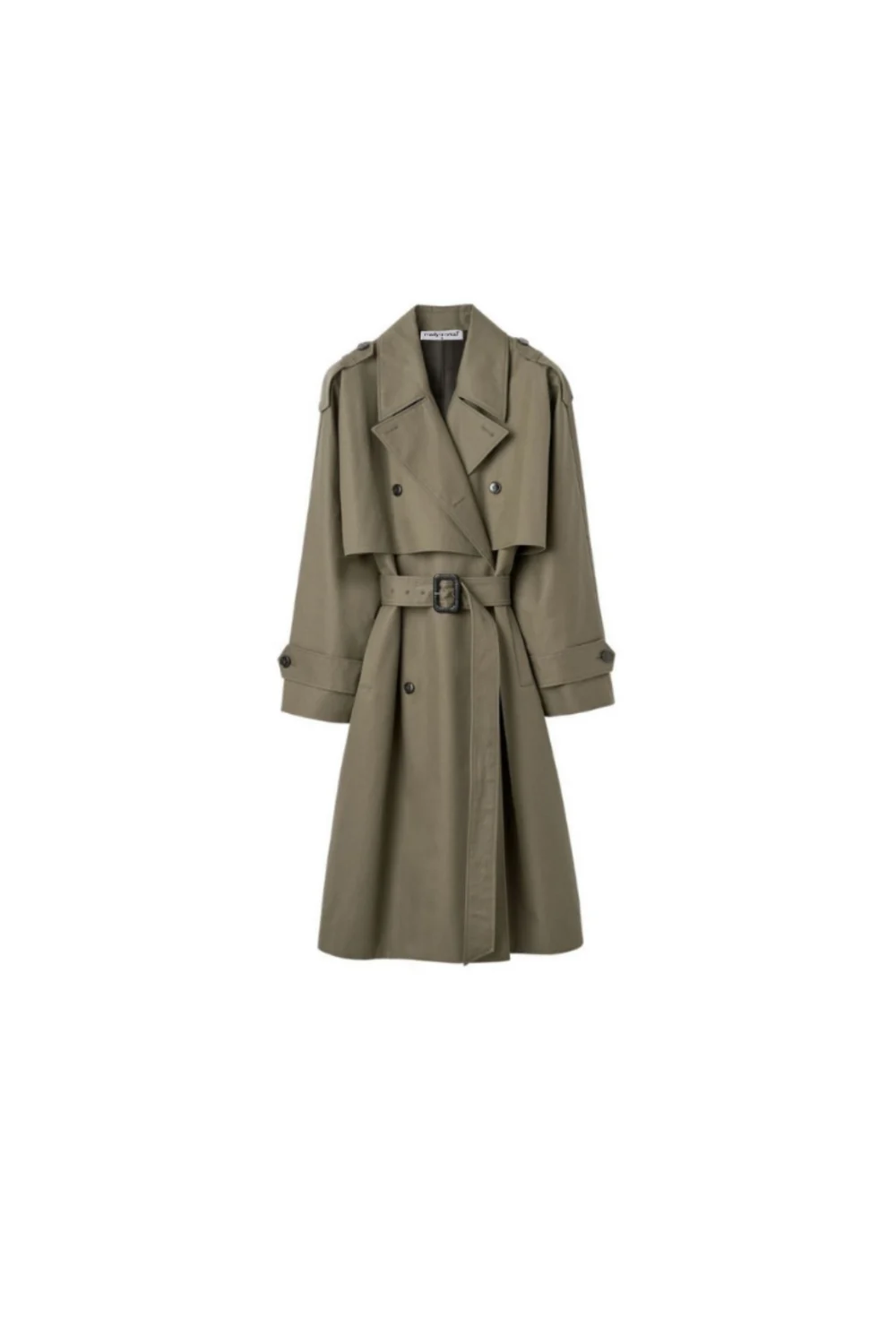 Kelebek yaka belden kuşak detaylı manşetli trençkot.
