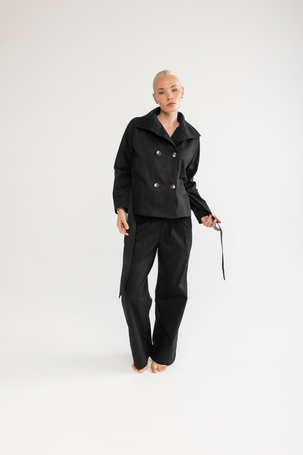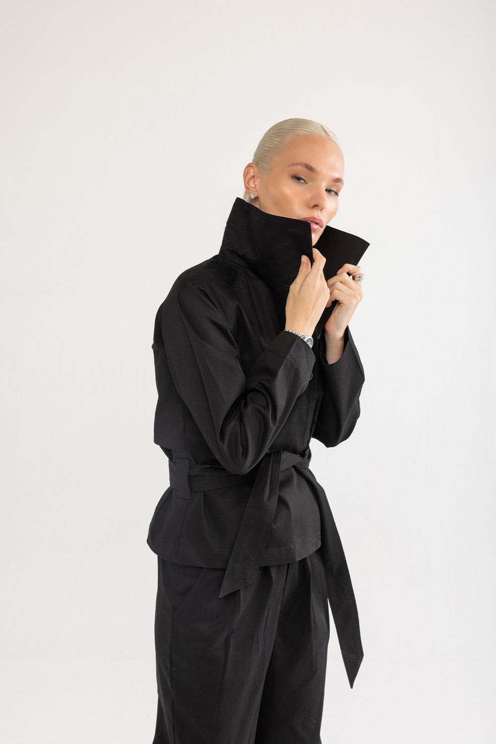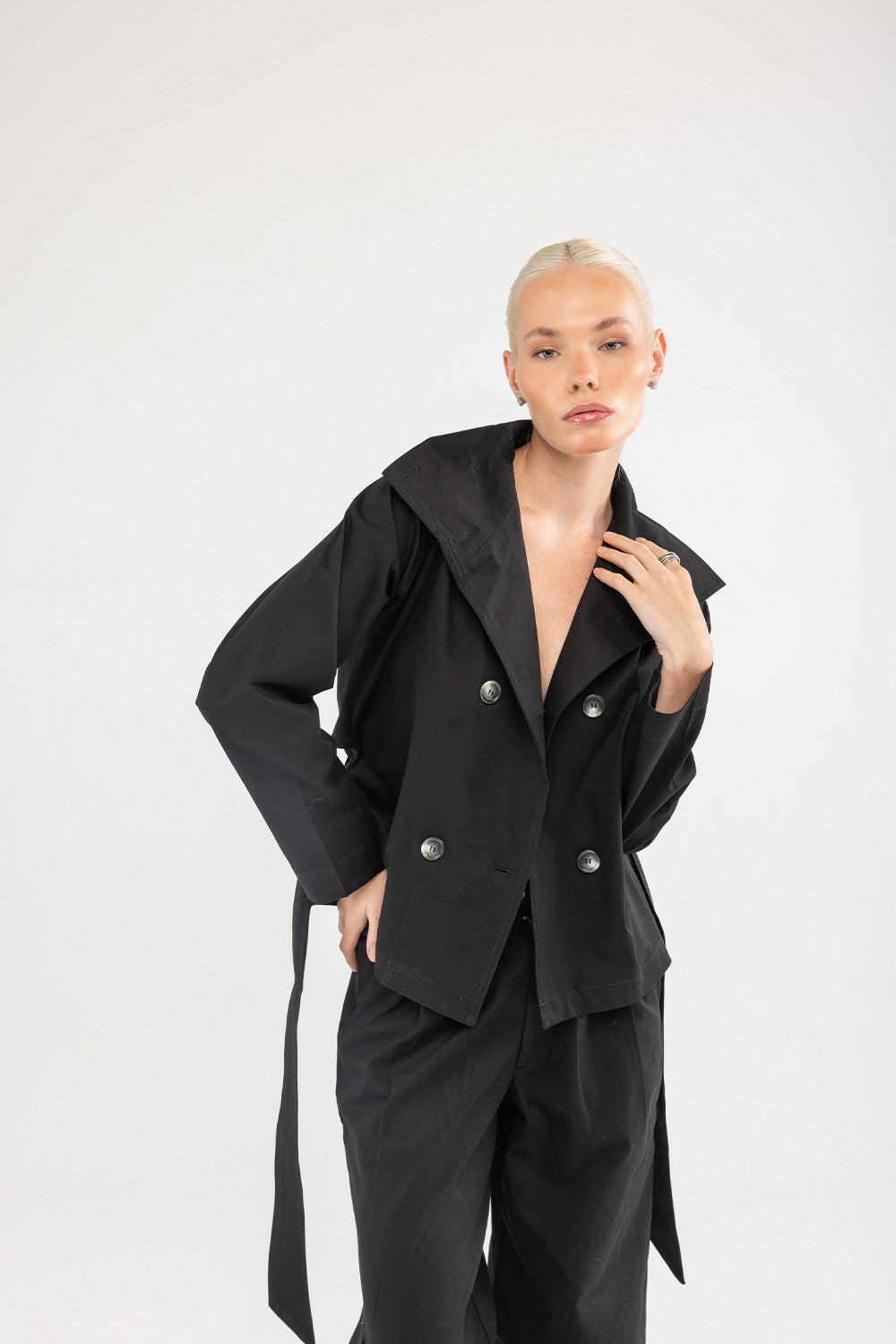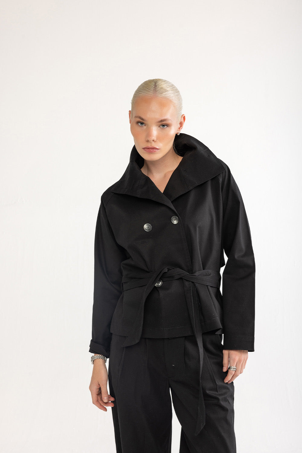 Klasik trençkot çizgilerini modern bir yorumla sunan bu model, sade tasarımıyla zamansız bir duruşa sahiptir. Formunu koruyan pamuklu kumaşı, belirgin yakası ve bele oturan kuşak detayıyla dengeli bir siluet oluşturur. Günlük şehir stilinde olduğu kadar akşam görünümlerinde de güçlü bir tamamlayıcıdır.