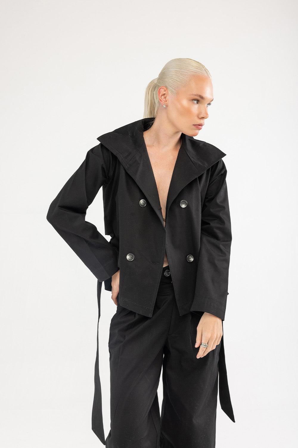 Siyah Kruvaze Kısa Trençkot