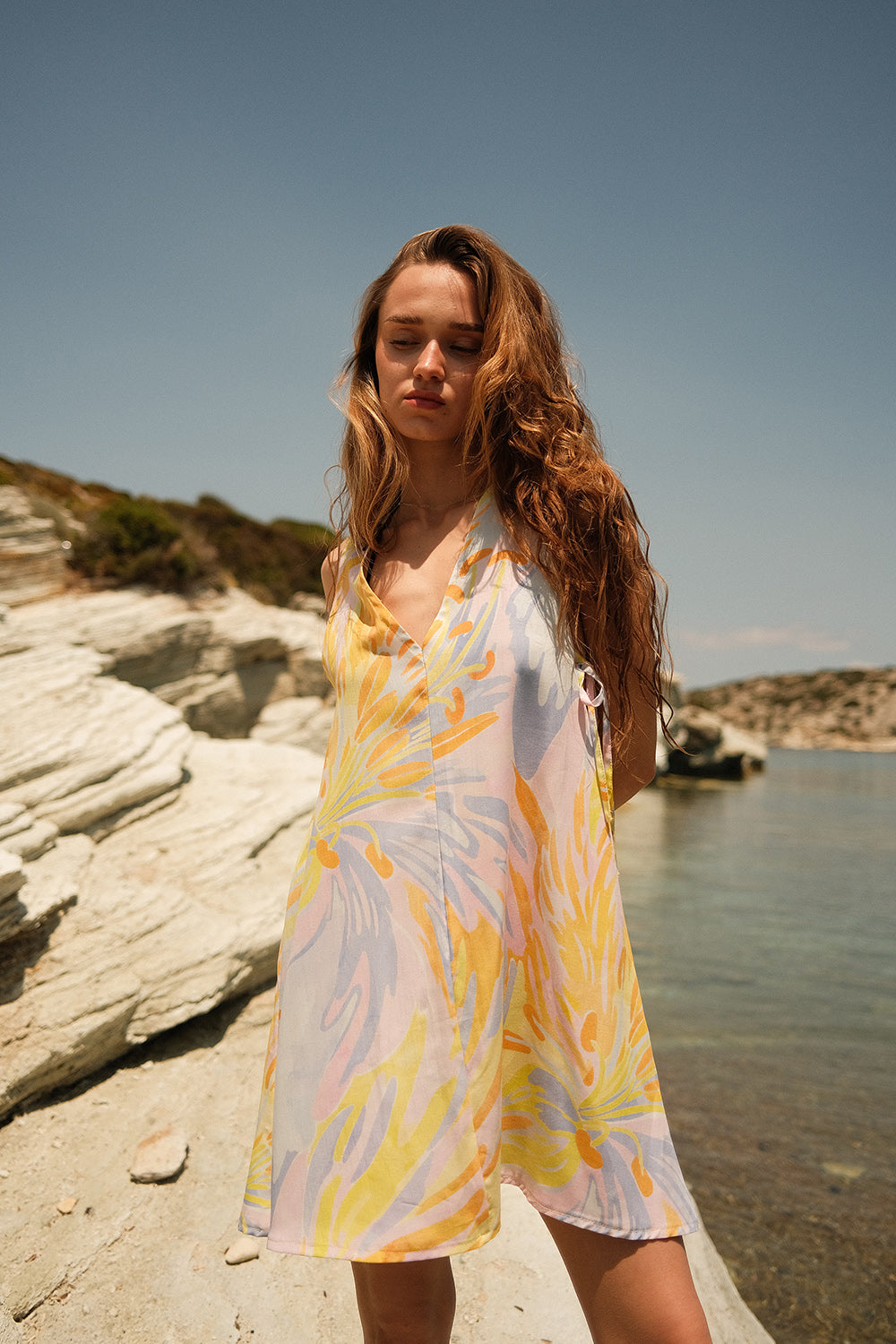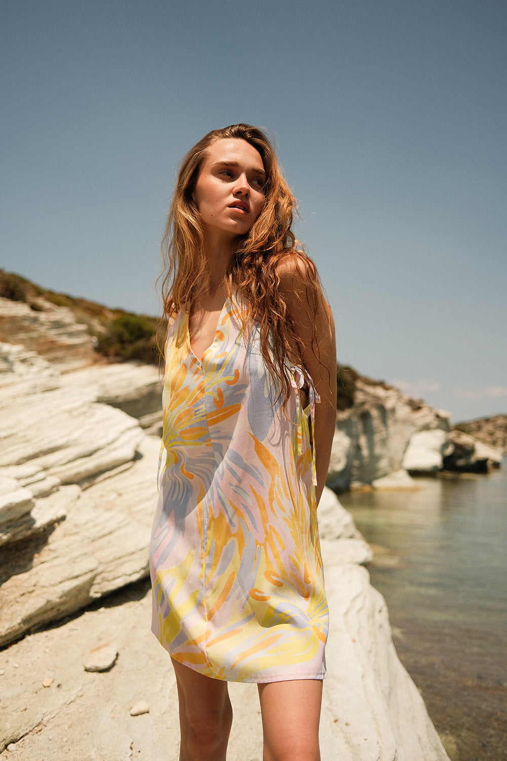 PALMA Kısa Elbise, rahat kesimi ve şık detaylarıyla yaz gardırobunuzun favorisi olacak. Yanlardan bağlanan ve ayarlanabilir detaylar, size özel uyum sağlar. Zarif V yaka, feminen bir duruş katarken, kısa boyuyla yaz günlerine hafiflik katar. Hafif ve nefes alabilen TENCEL™ kumaşı sayesinde gün boyu ferah kalırsınız.