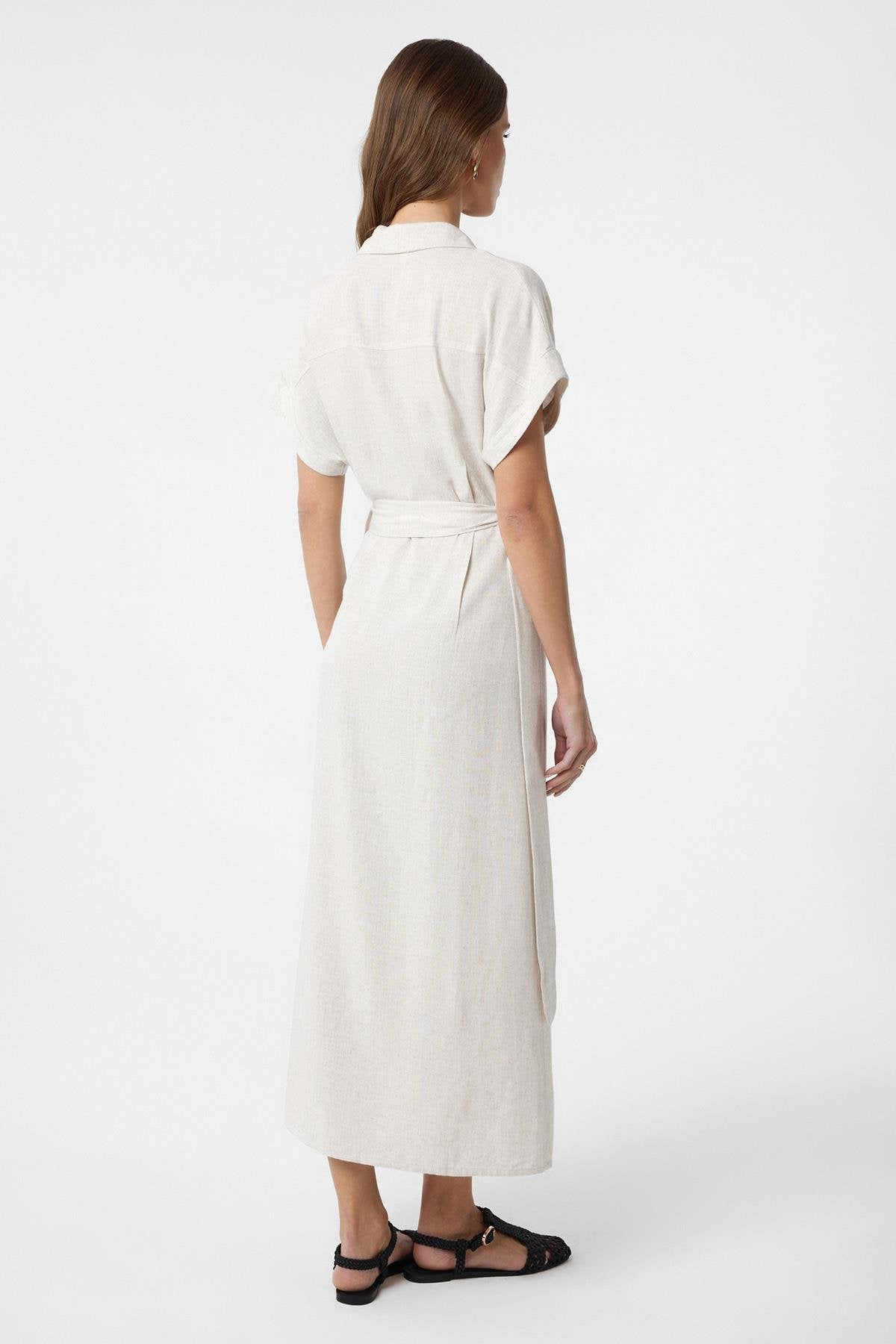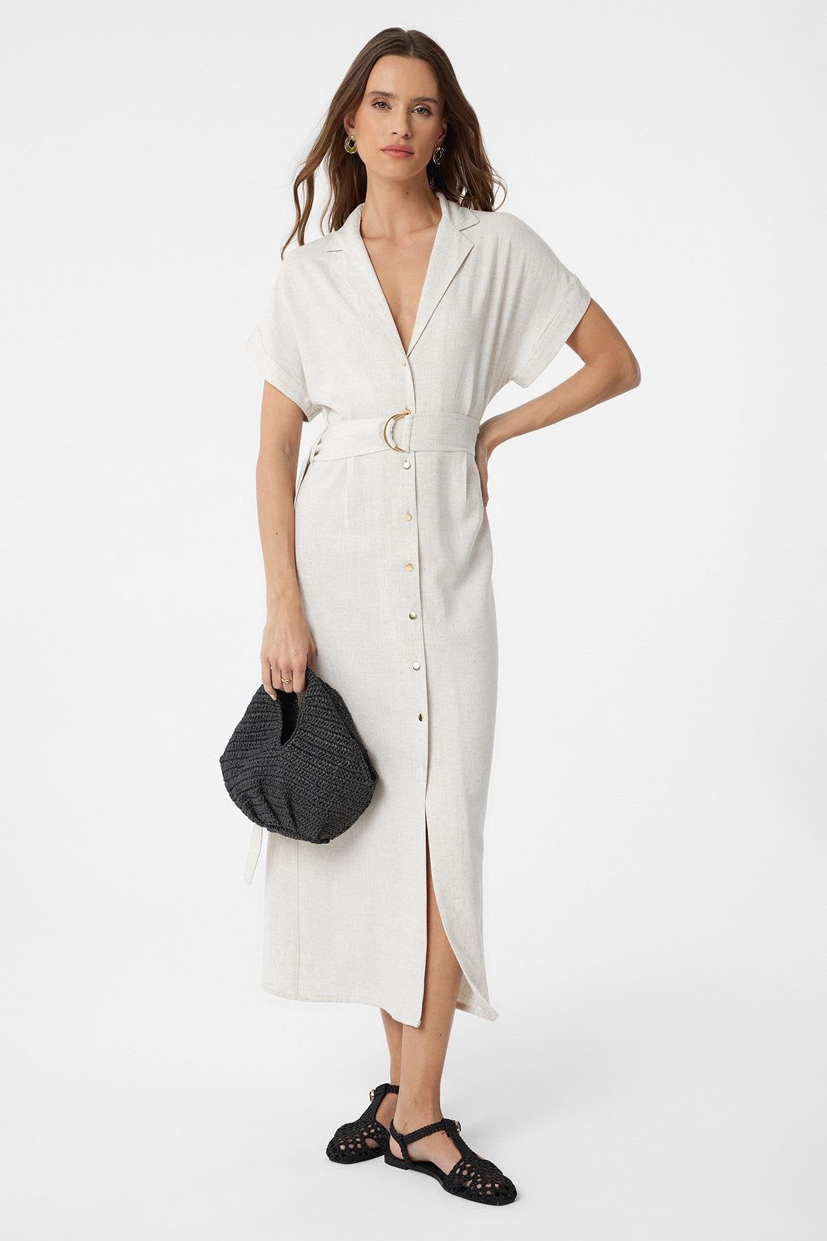 Ekru Keten Karışımlı Kemerli Kadın Elbise