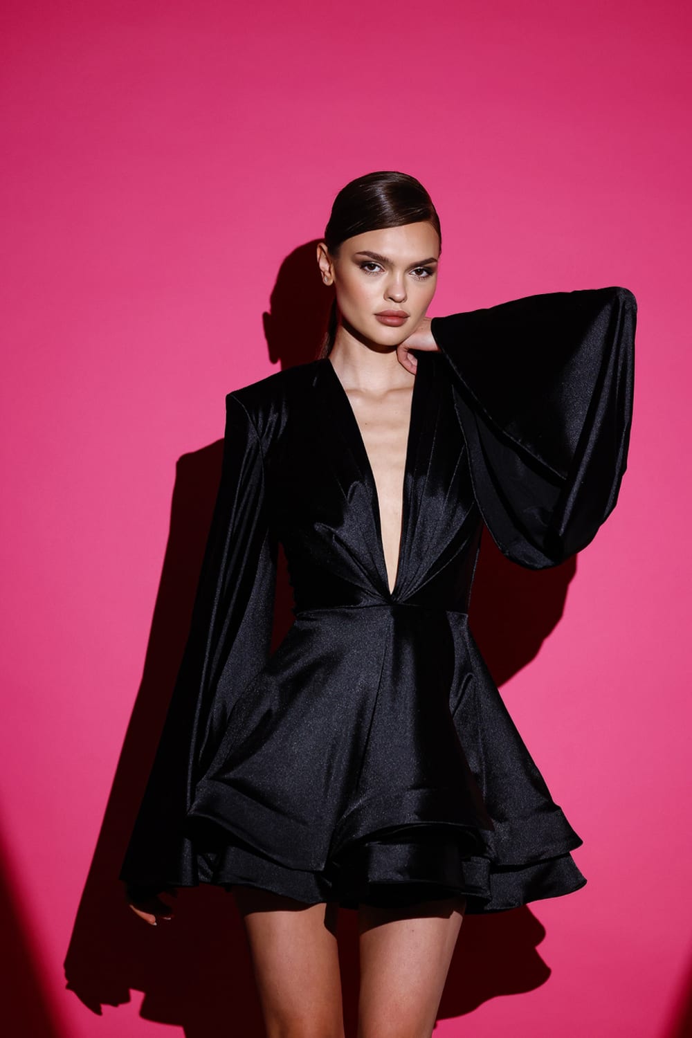 Akıcı saten dokusu ve glenli kesimiyle vücudu zarifçe saran bu elbise, sade ama etkileyici bir siluet sunar. Tam kalıp yapısı ve astarlı formu sayesinde iç göstermez, özel davetlerden şehir akşamlarına kadar her ortamda şık bir duruş sağlar.