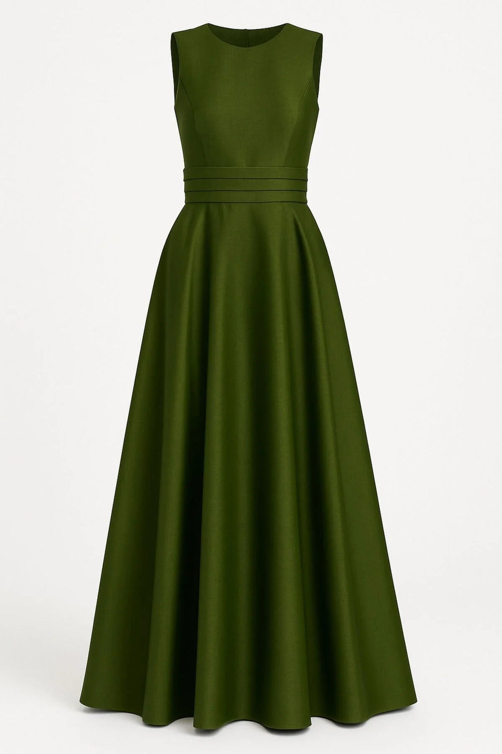 Kolsuz & Piliseli Kuşaklı Şık Koyu Yeşil Tafta Maxi Elbise