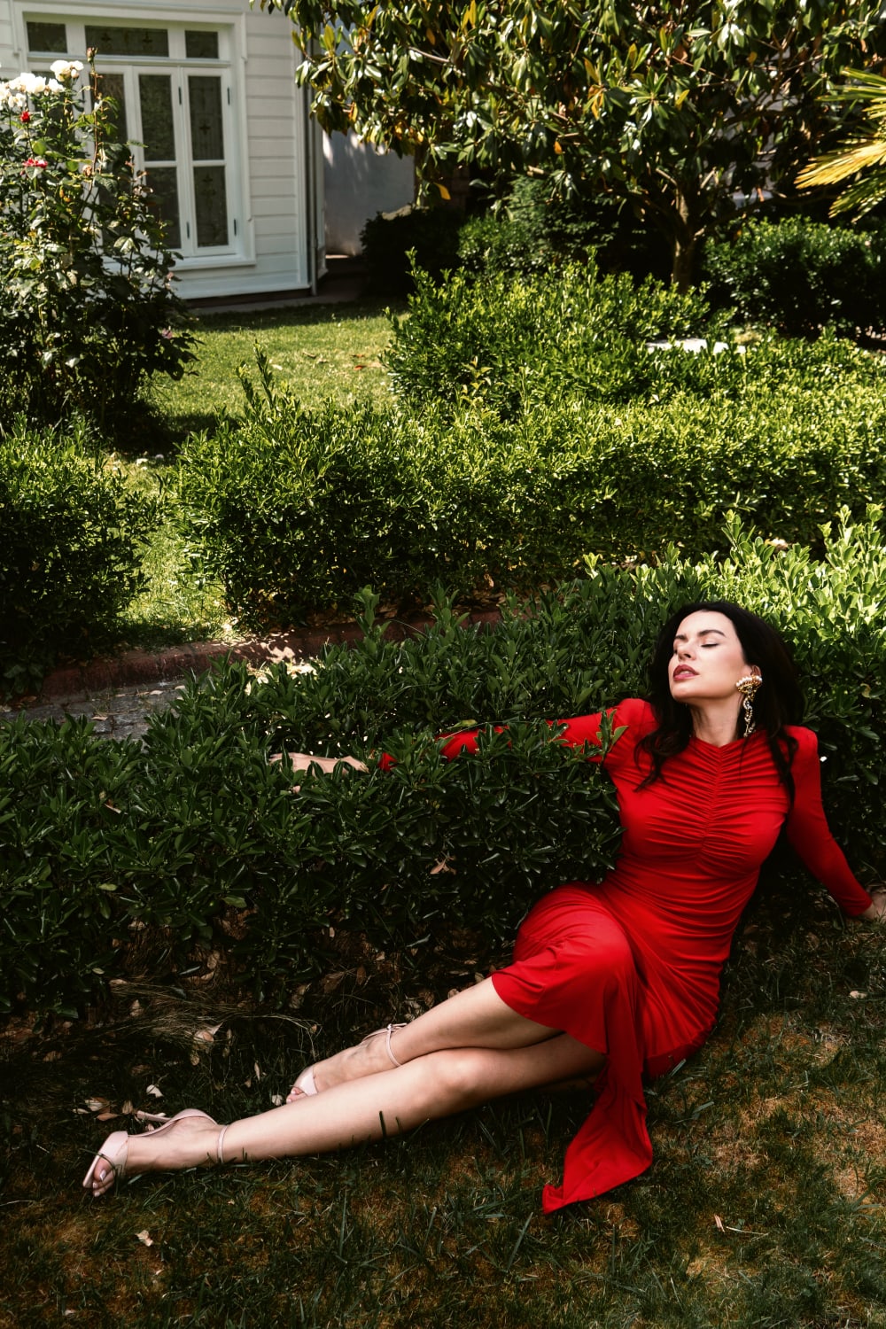 Kendinden emin bir siluet. Bu koyu kırmızı elbise, göğüs ve omuz kısmındaki zarif drape detaylarıyla vücudu heykelsi bir şekilde sarar. Yapılandırılmış vatkalı omuzlarıyla güçlü bir duruş sunarken, ensede tek düğmeyle kapanan açık sırt detayı zarif bir baştan çıkarıcılık katar. Astarsız esnek kumaşıyla adeta ikinci bir ten gibi hissedilir.