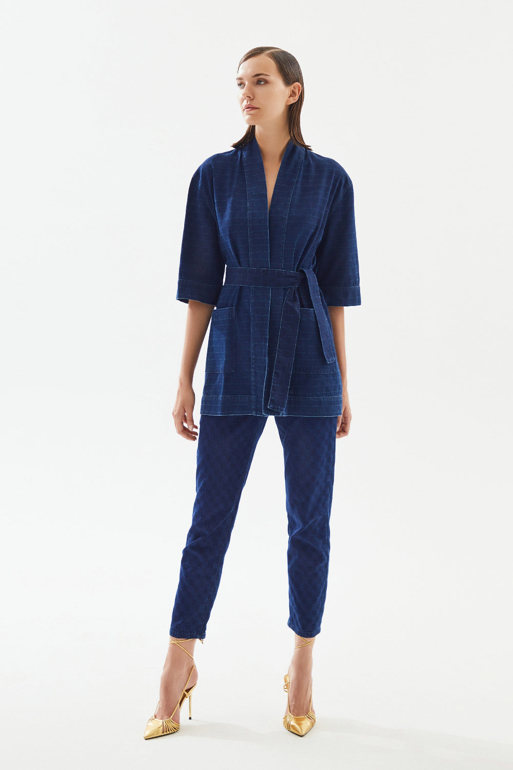 Kadın damalı denim kimono, stilinize zarif ve rahat bir dokunuş katacak çok yönlü bir seçenektir.
