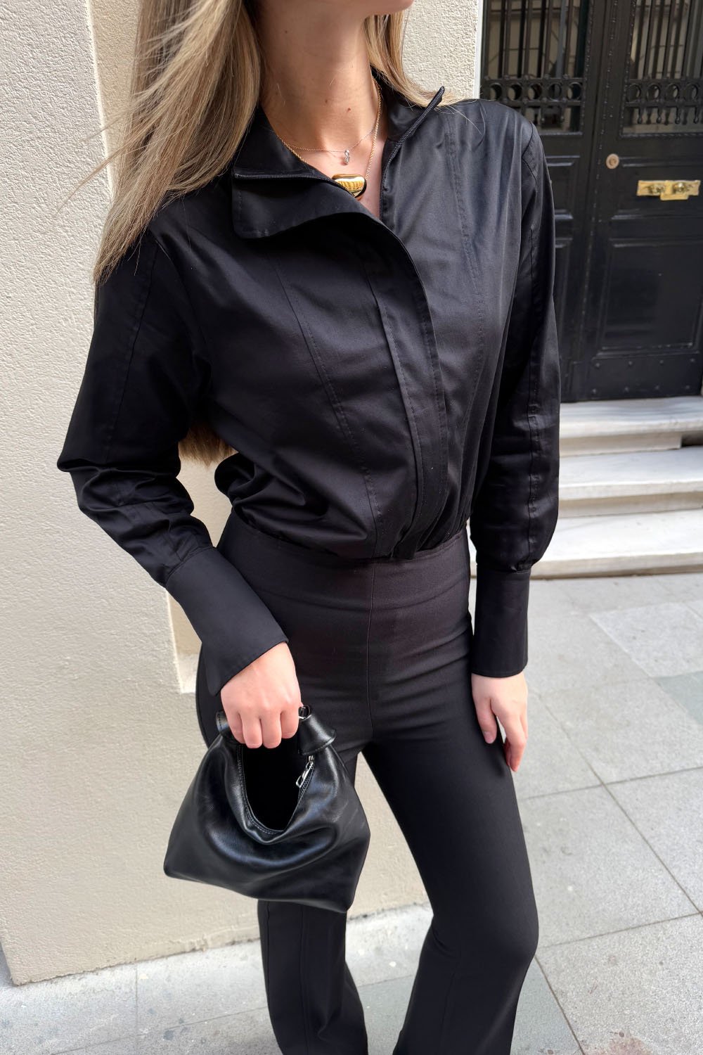 Bodysuit formundaki gömleğin önünde patı olup, yine önden gizli fermuar ile açılıp giyilir. Birinci kalite saten poplindir. Krem ve siyah renk olmak üzere iki farklı renkte üretilmiştir. Manşeti etiket ve gold düğme detaylıdır.