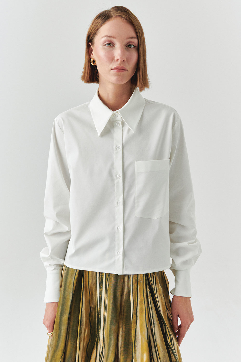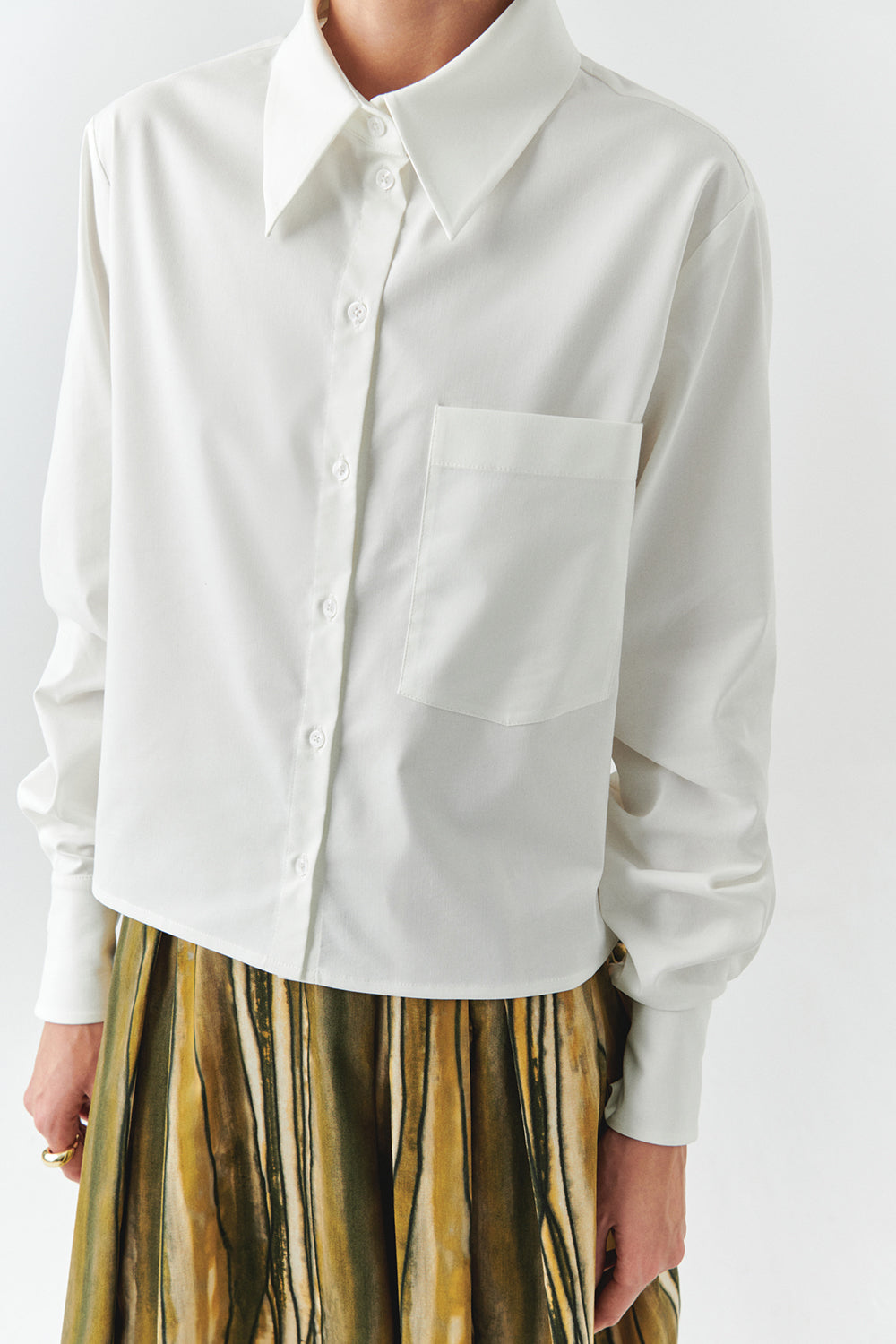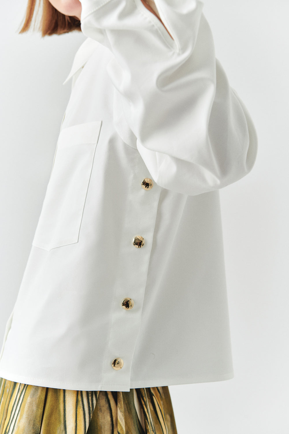 Yumuşacık dokusu ve rahat kesimiyle bu beyaz gömlek, dolabınızın her an kurtarıcı parçası olacak. Yan dikişlerdeki altın çıtçıtlar, sade görünümüne zarif bir ışıltı katıyor. İster desenli bir midi etekle feminen bir hava yaratın, ister kumaş pantolonla ofis şıklığını yakalayın… Soğuk kış günlerinde üzerine oversize bir kazak atarak da kullanabilirsiniz. Her kombinle uyum sağlayan bu parça, gün boyu stilinizi zahmetsizce tamamlayacak.