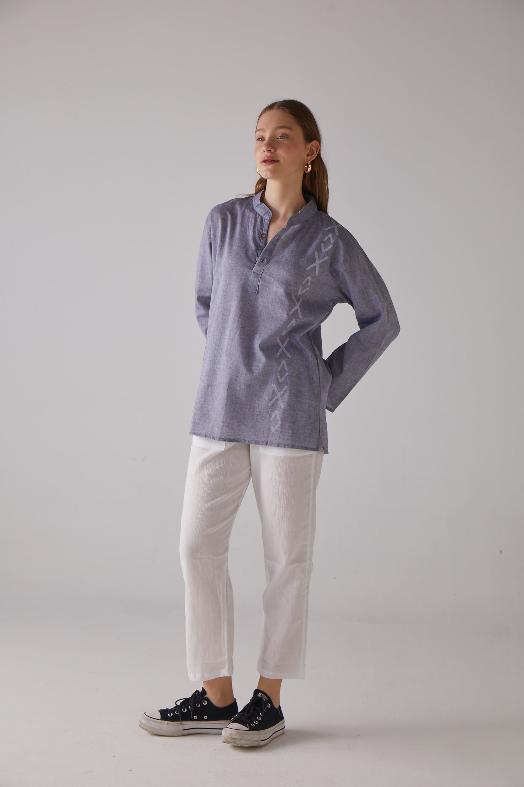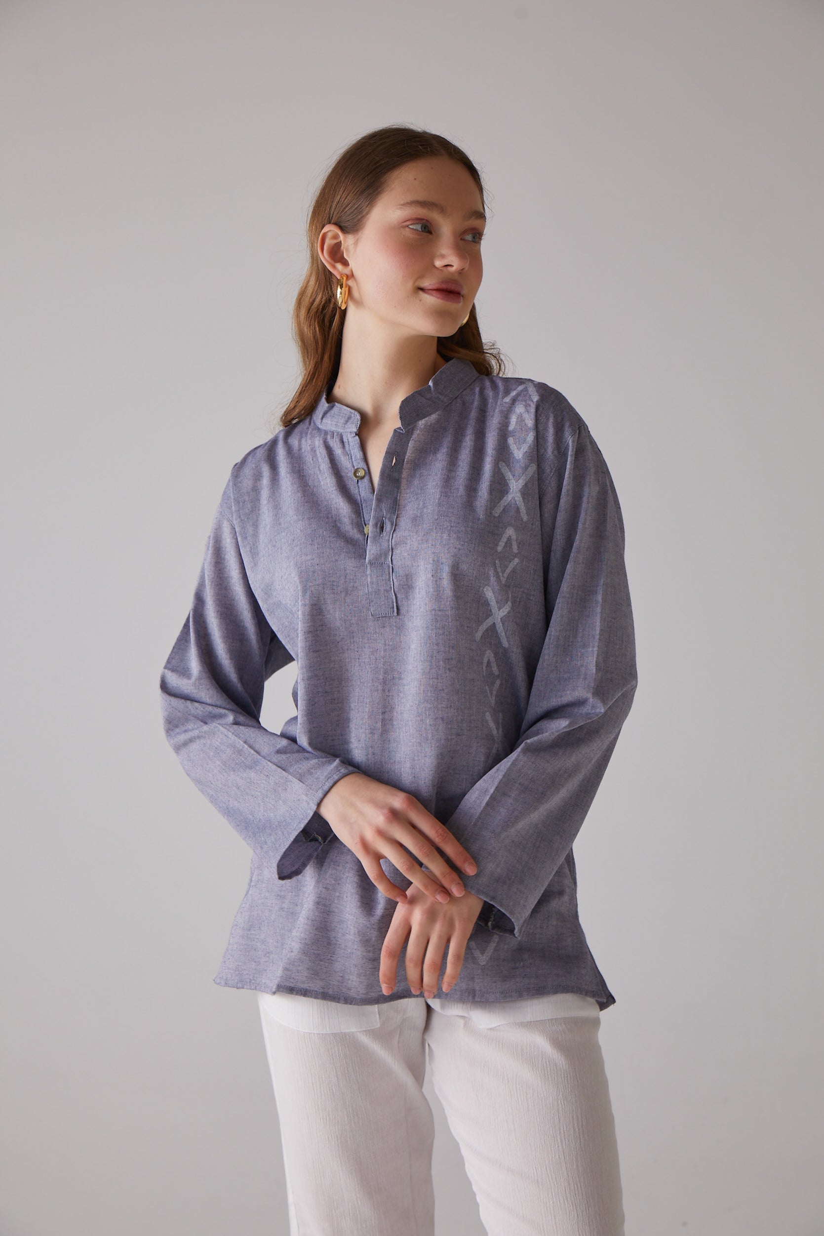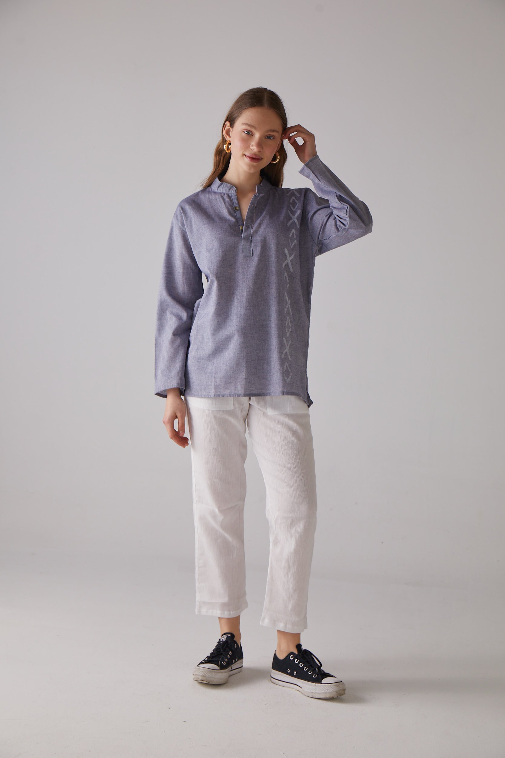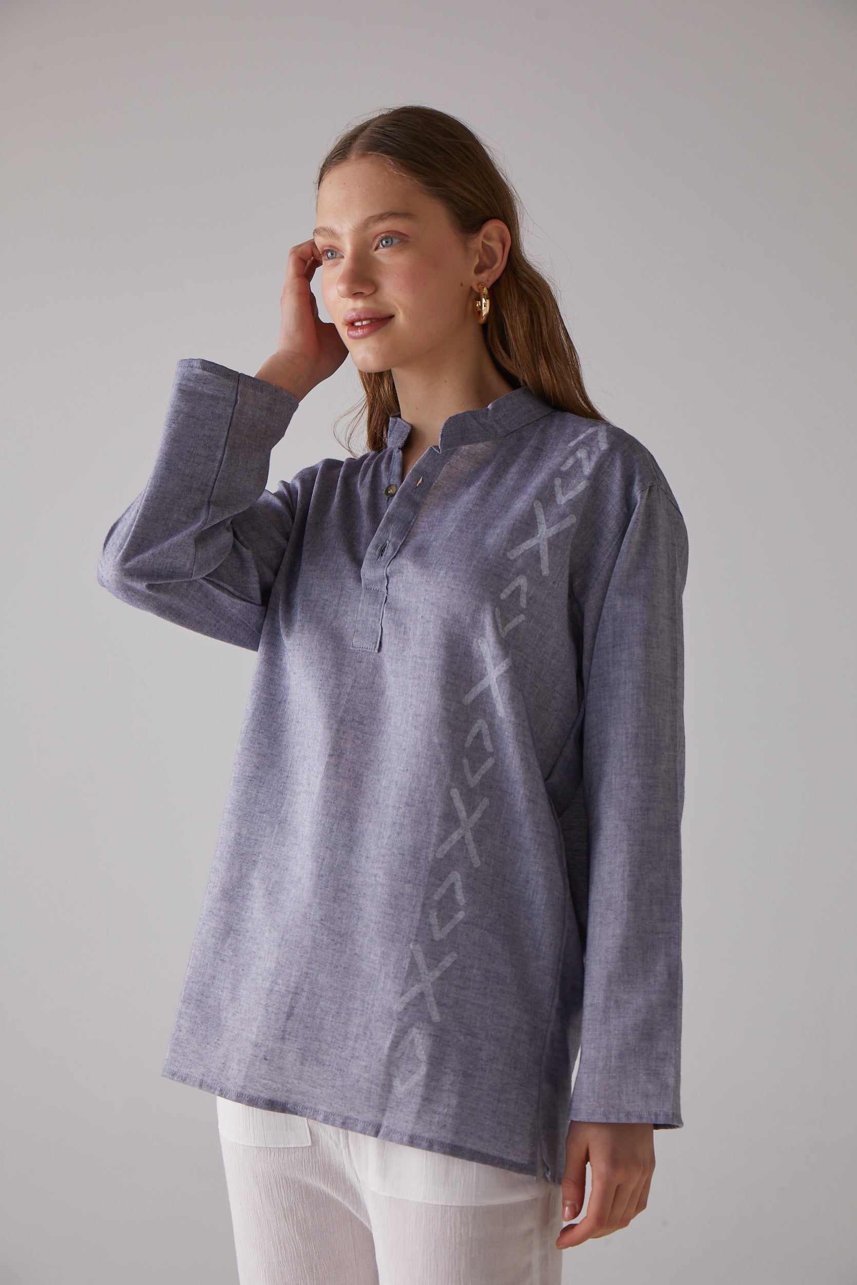 Çapraz Desen Uzun Kollu Mavi Gömlek