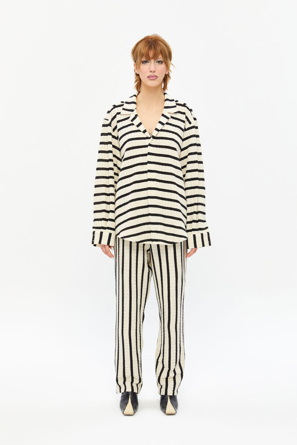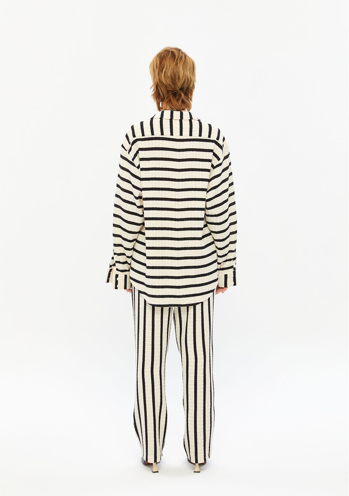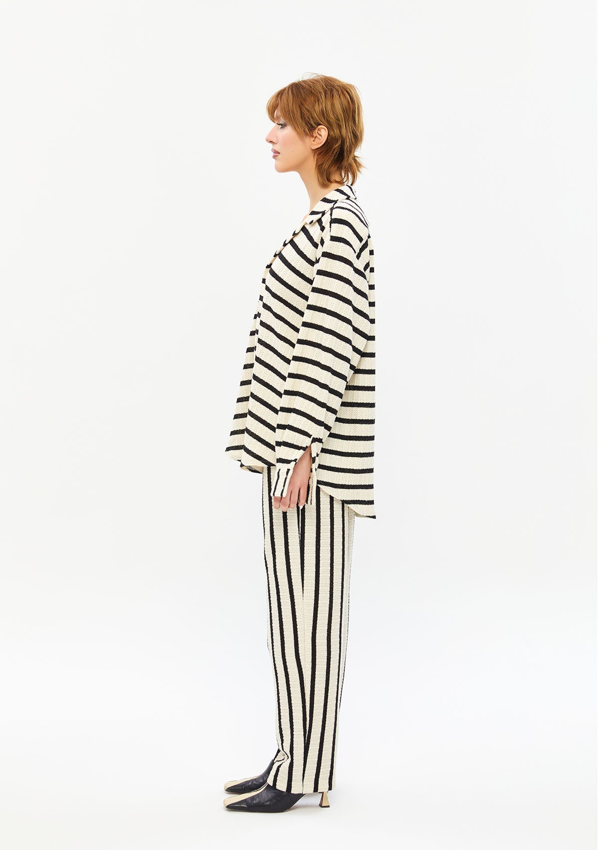 • Siyah-beyaz çizgili, gömlek. Oversize kesimiyle ve kalın kumaşıyla serin günlerde rahat ve sofistike bir stil elde etmenizi sağlıyor.