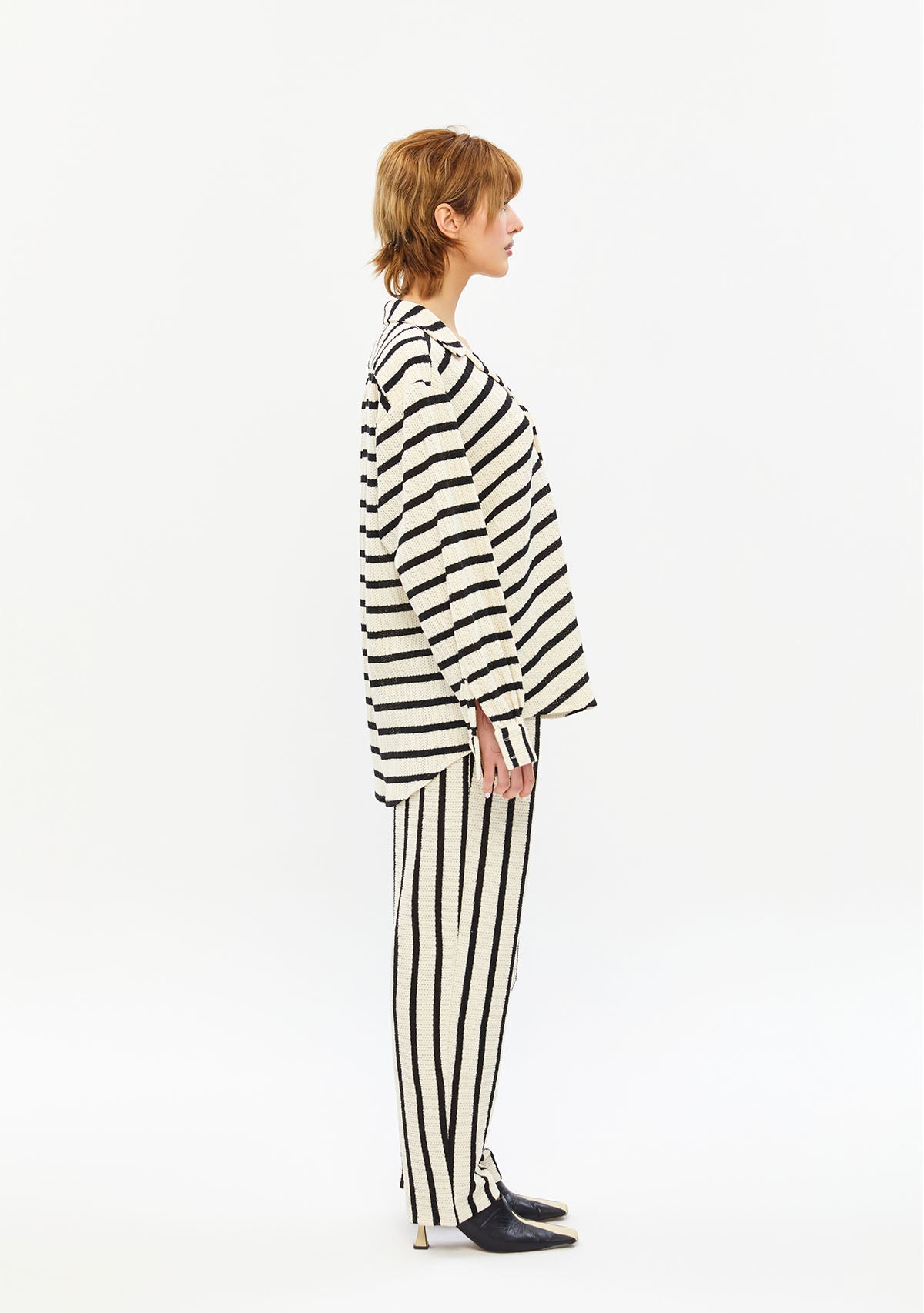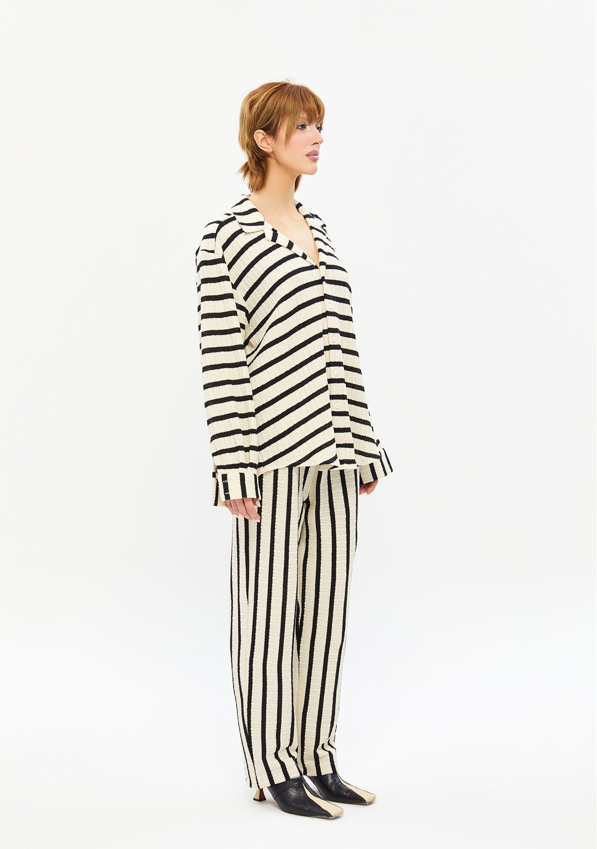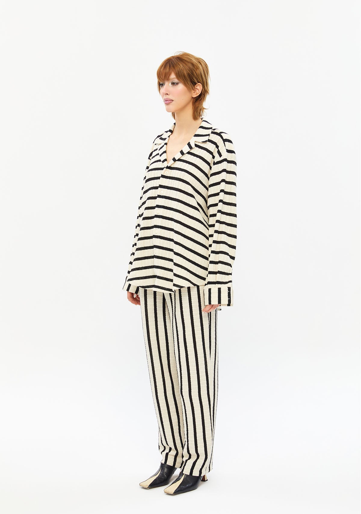 • Siyah-beyaz çizgili, gömlek. Oversize kesimiyle ve kalın kumaşıyla serin günlerde rahat ve sofistike bir stil elde etmenizi sağlıyor.