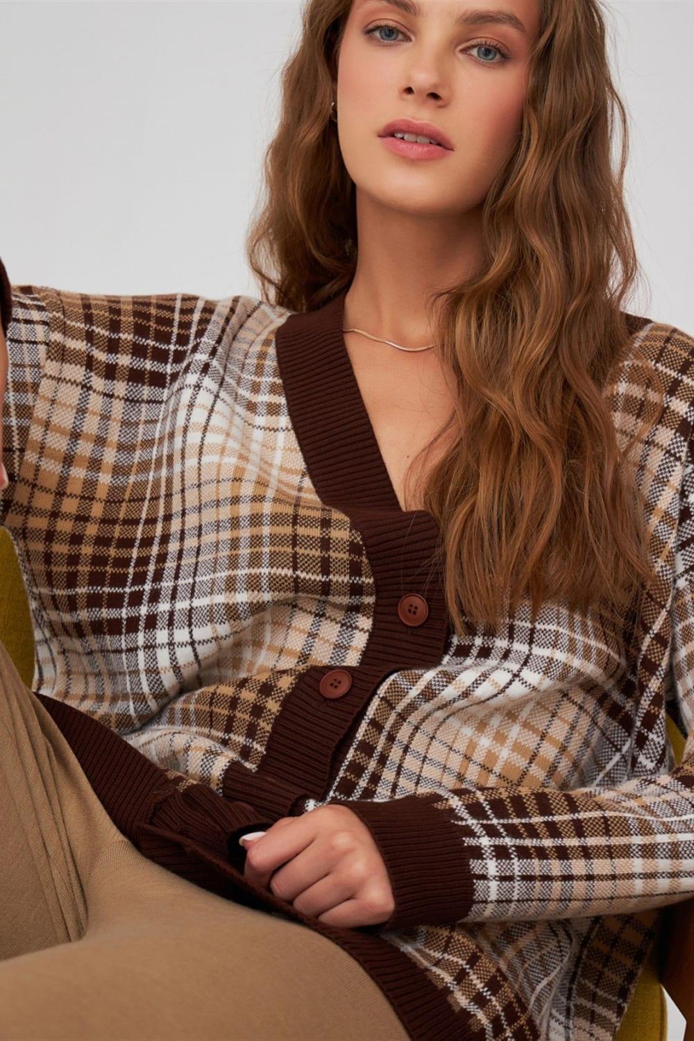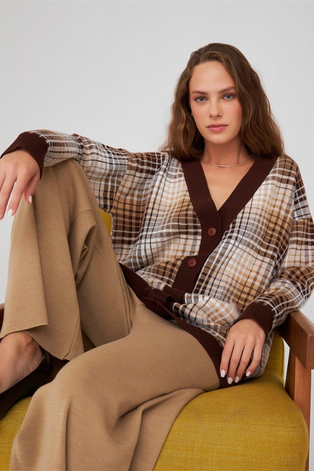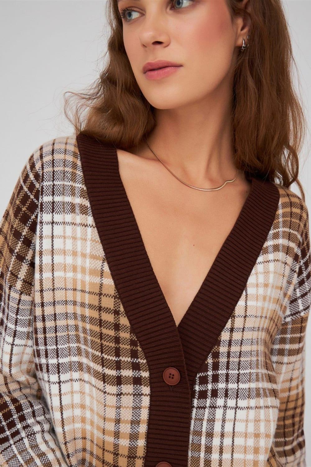 Checked Jacquard Knitted, Drop Sleeved, Buttoned, Deep V-Neck Cozy Cardigan Loose Cut