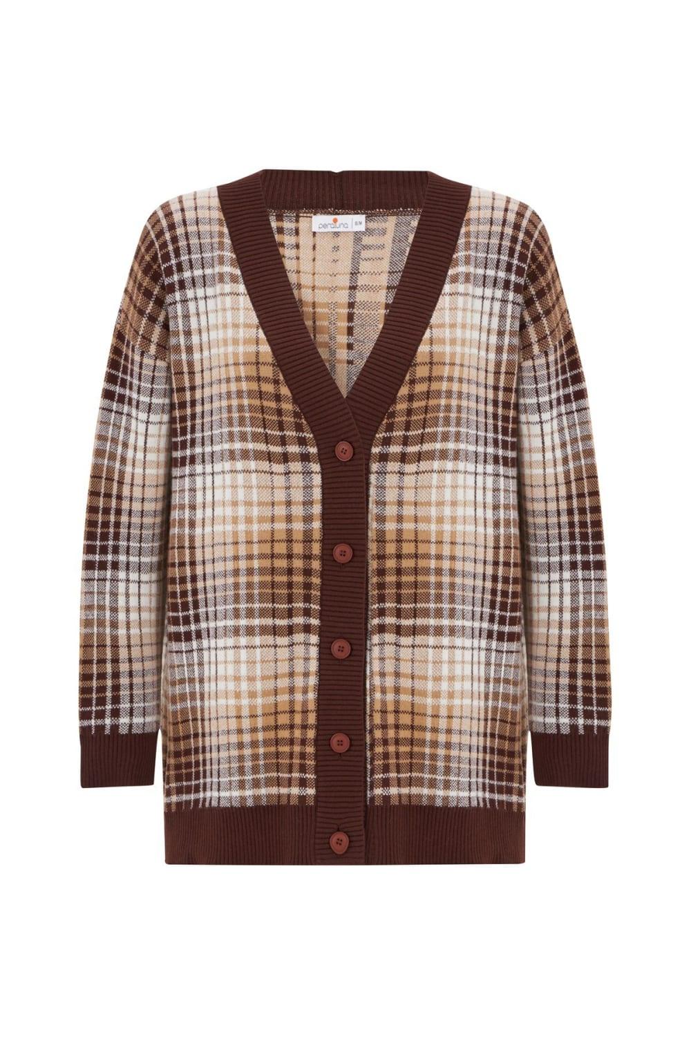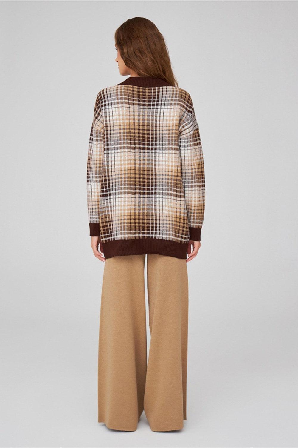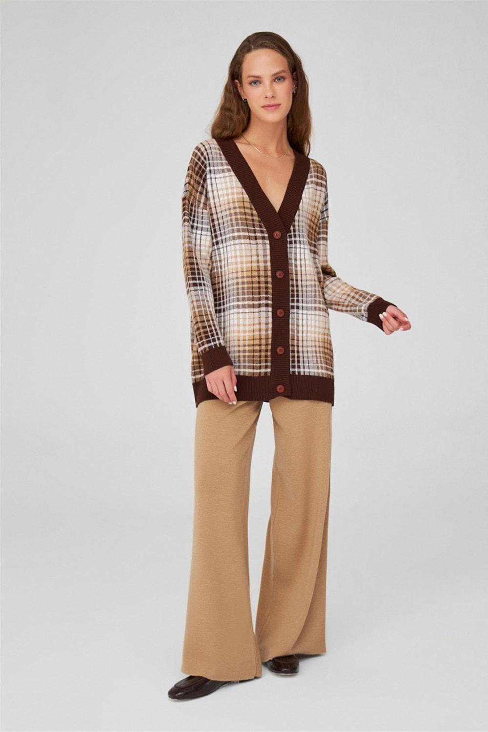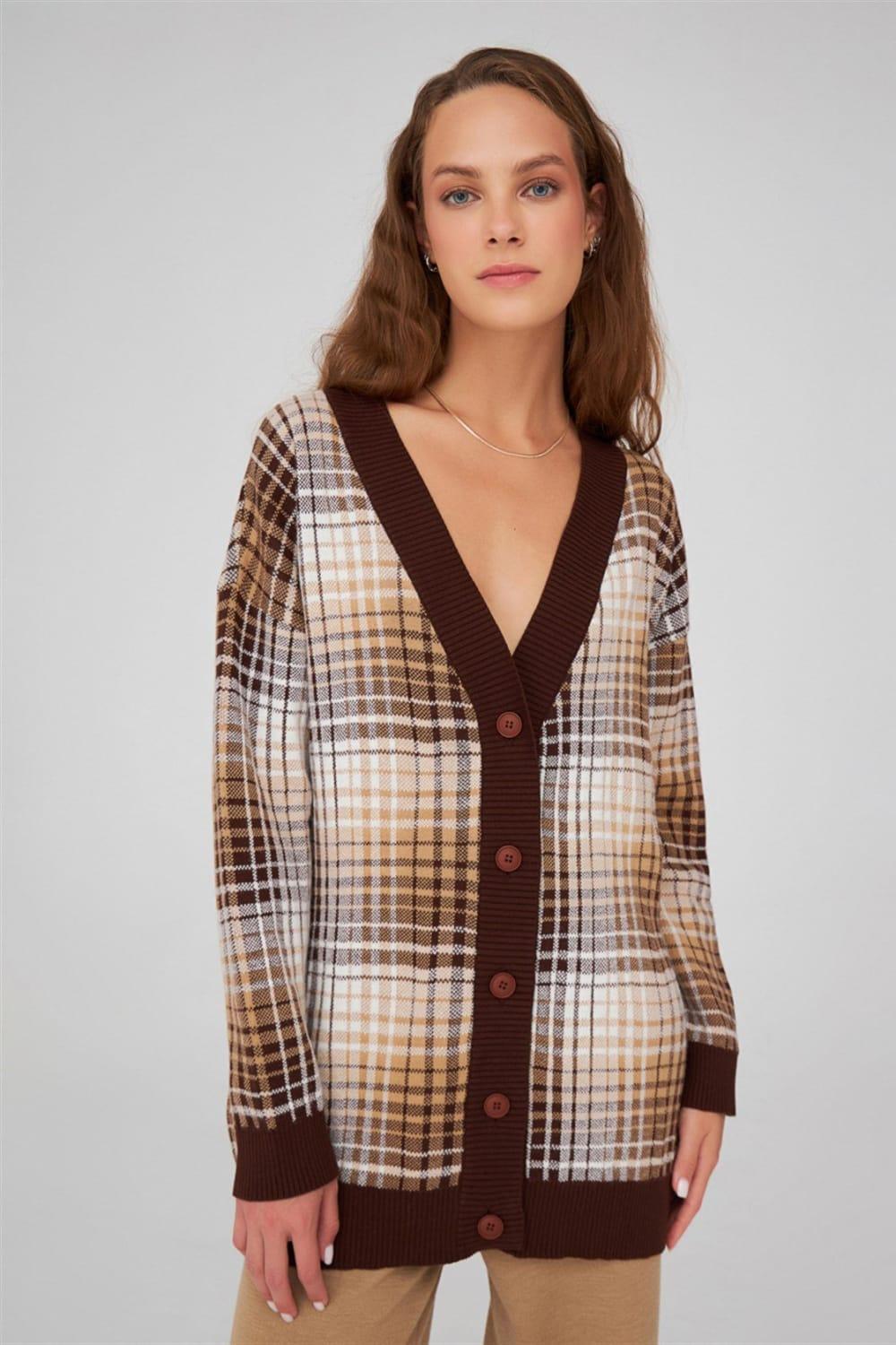 Checked Jacquard Knitted, Drop Sleeved, Buttoned, Deep V-Neck Cozy Cardigan Loose Cut