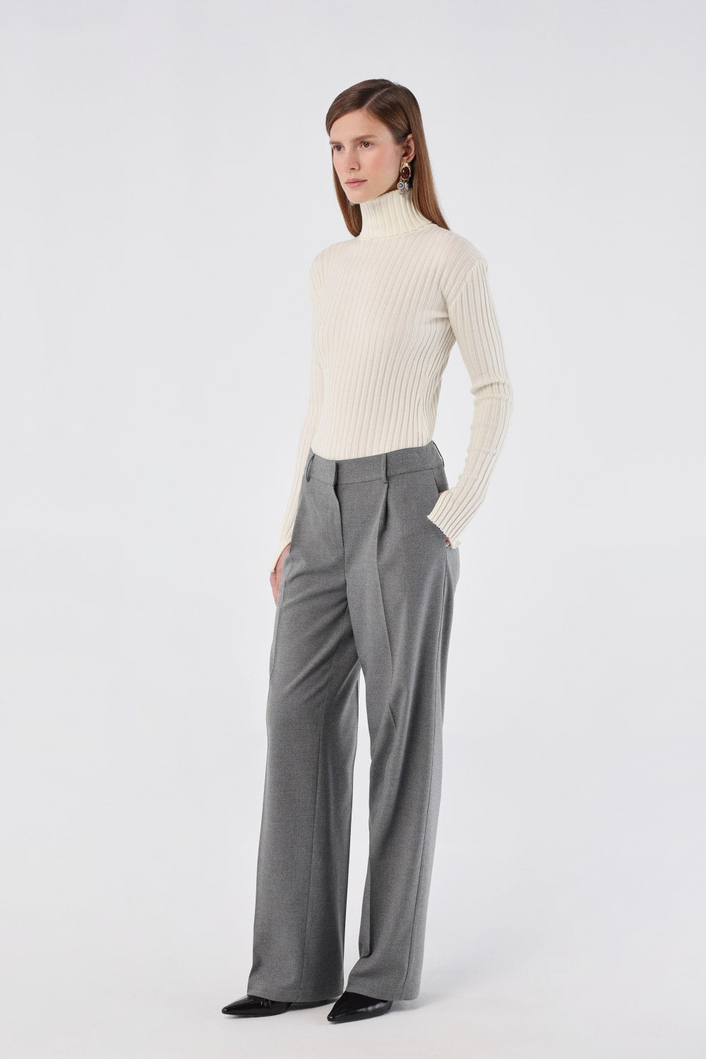 Modern ve zarif bir görünüm sunan geniş paça tasarımıyla hem şıklığı hem de rahatlığı bir araya getirir. Gizli fermuar kapama, temiz hatlar ve kusursuz uyum sağlar. Yan cepler, günlük kullanımda pratiklik sunarken stilinizden ödün vermez. Hem resmi hem de gündelik kombinlerle rahatlıkla kullanılabilir.