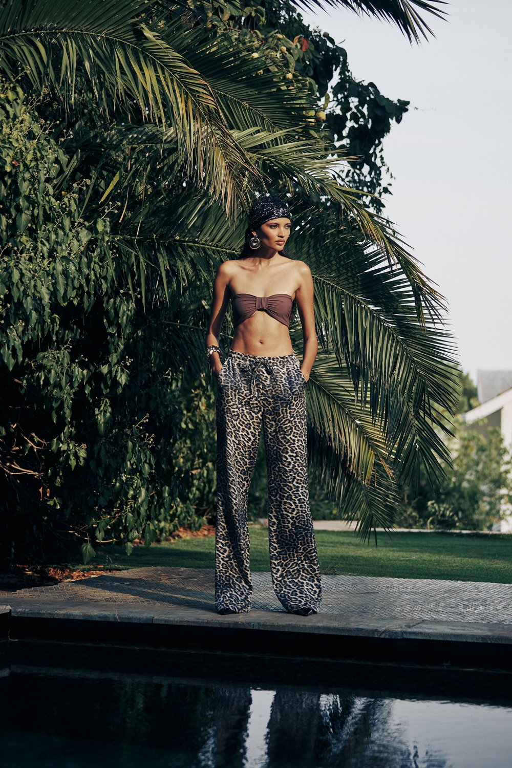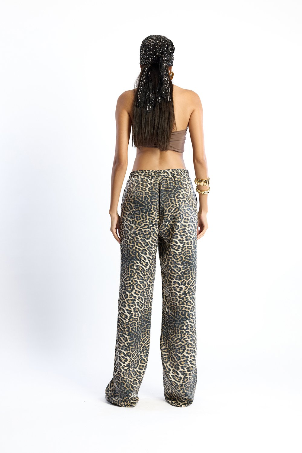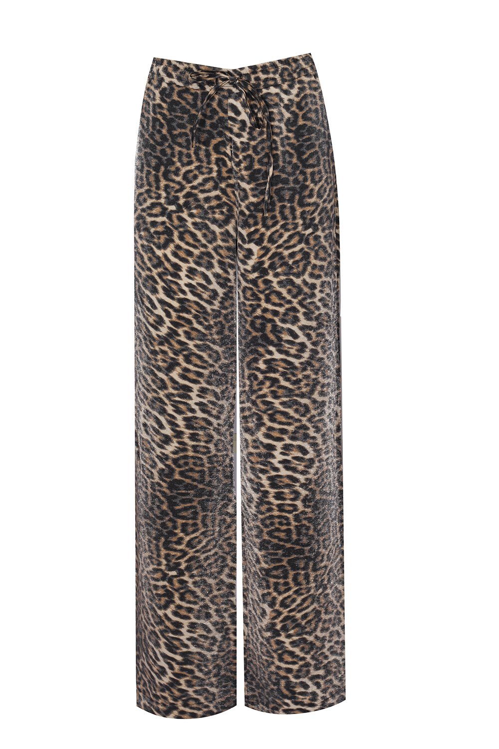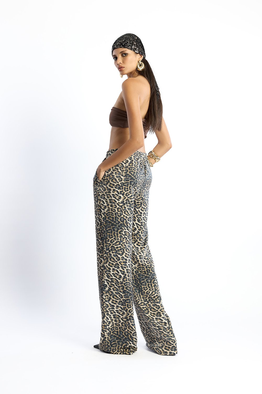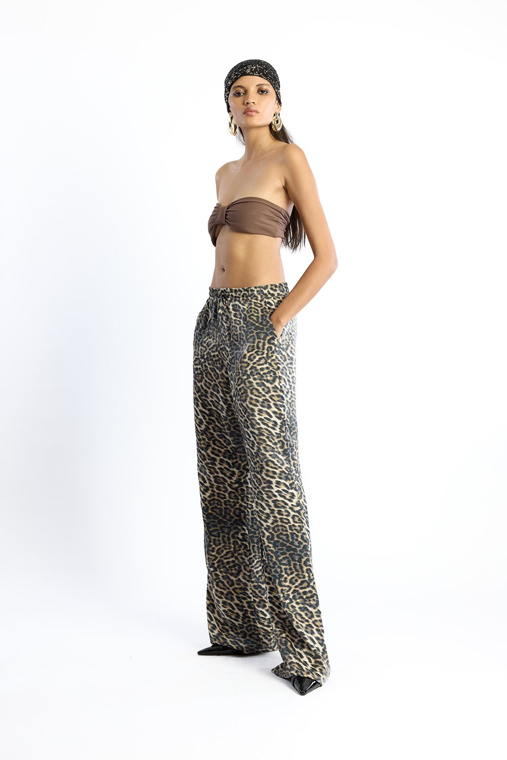 Yüksek Bel Ve Beli Lastikli Leopar Desenli Bol Saten Pantolon