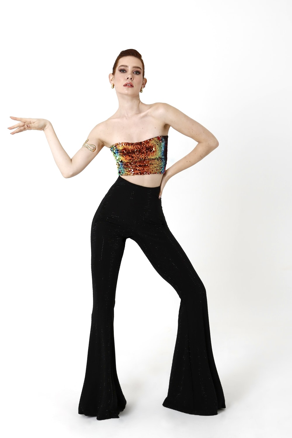 Siyah taşlarla süslenen İspanyol paça pantolonumuz, klasik siyahın asaletiyle göz alıcı bir ışıltıyı buluşturuyor. Vücuda oturan yapısı ve bol paça kesimi bacakları olduğundan daha uzun ve zarif gösterirken, taş detayları modern şıklığa sofistike bir dokunuş katıyor. Gündüzden geceye her ortamda stilinizi vurgulayan güçlü bir parça.